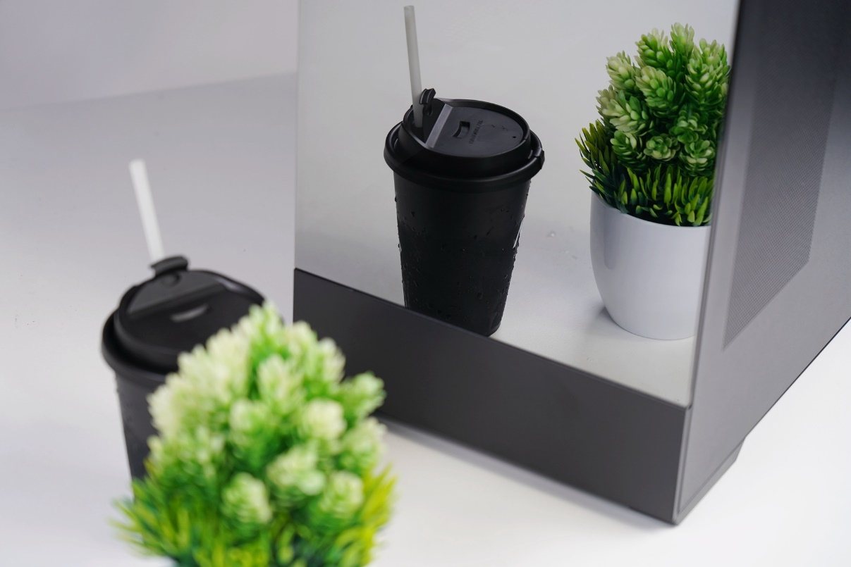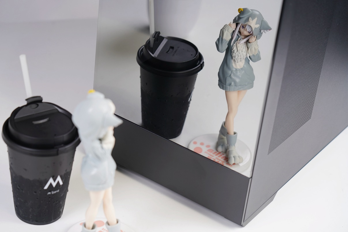 把前面板和侧板盖上以后,内部的灯光可以很好地透射出来,而外部的镜面效果也得到了保留,海景房270°全透的效果和镜面两全其美。