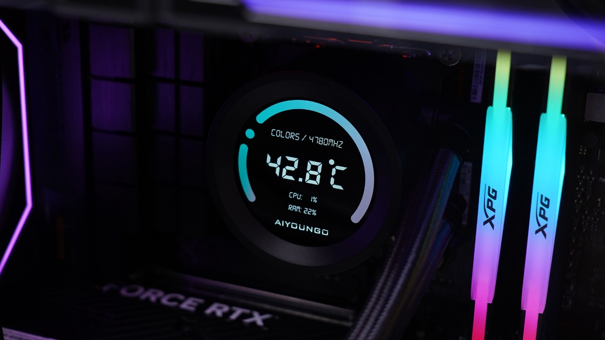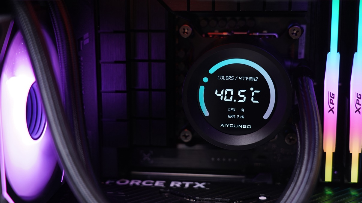 冷头上的数字可以清晰地显示CPU温度、CPU频率以及CPU和显卡的占用率,这样我们就可以在打游戏或者工作的时候随时观察硬件的实时情况。