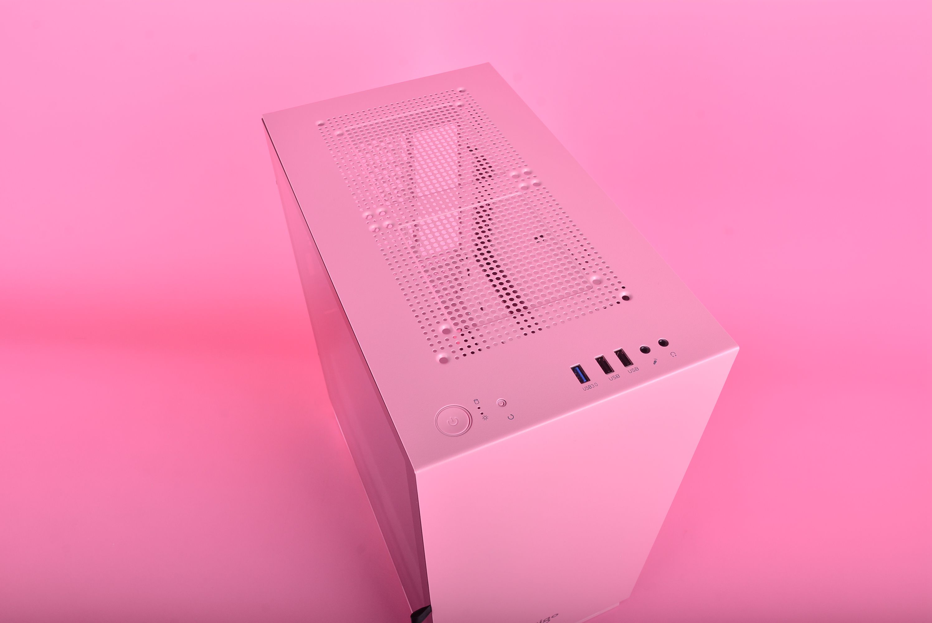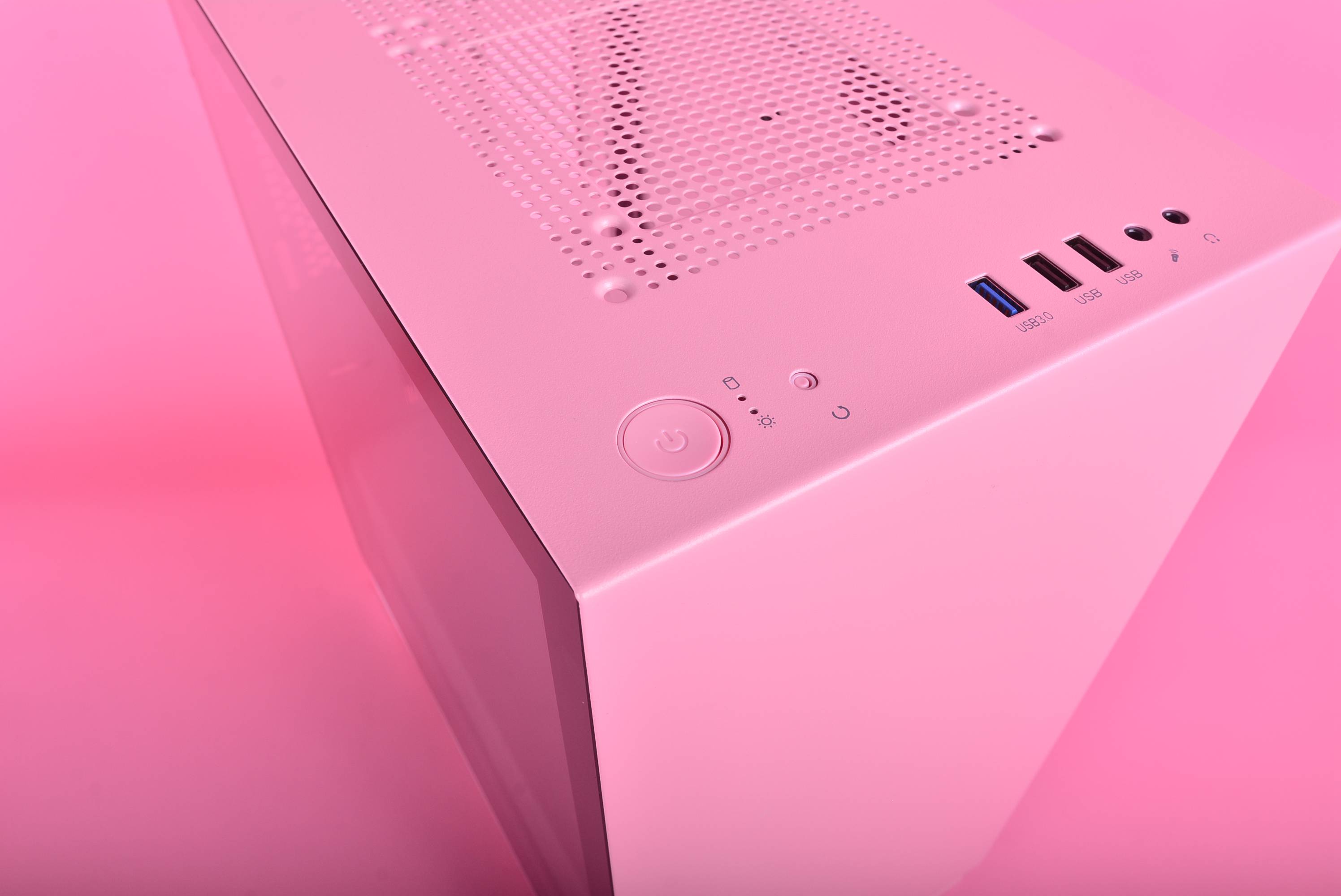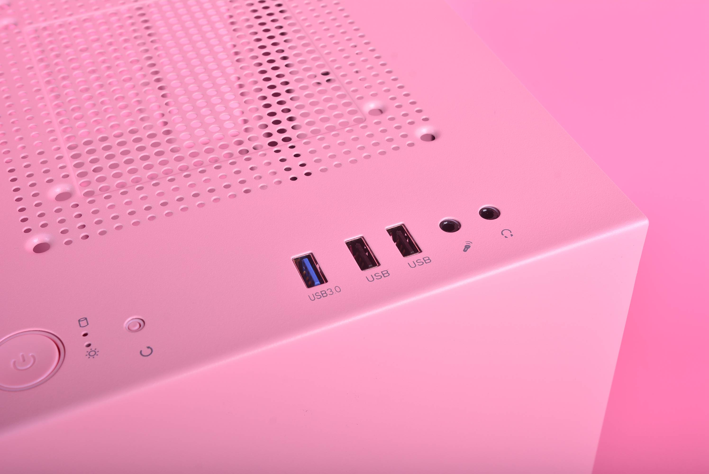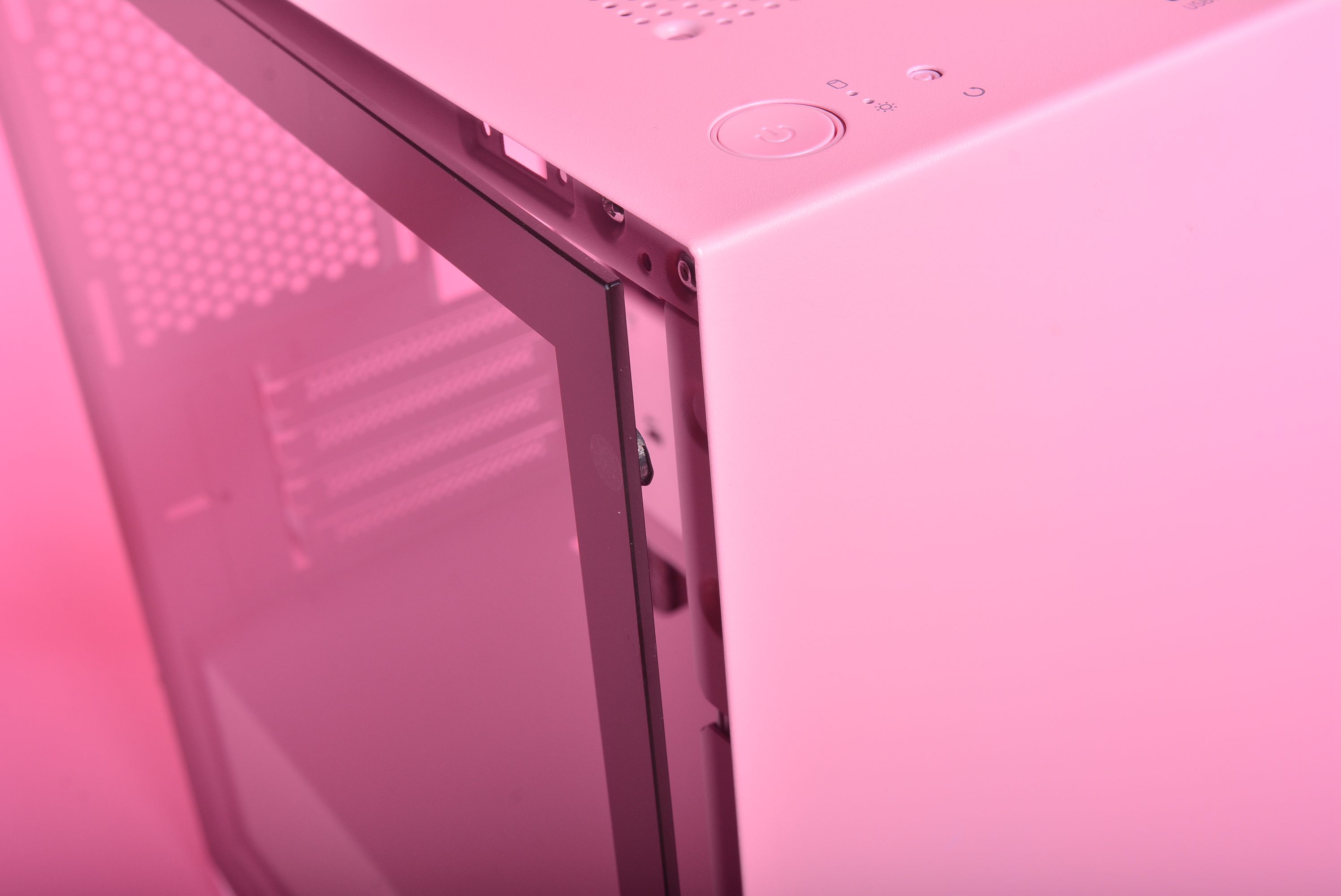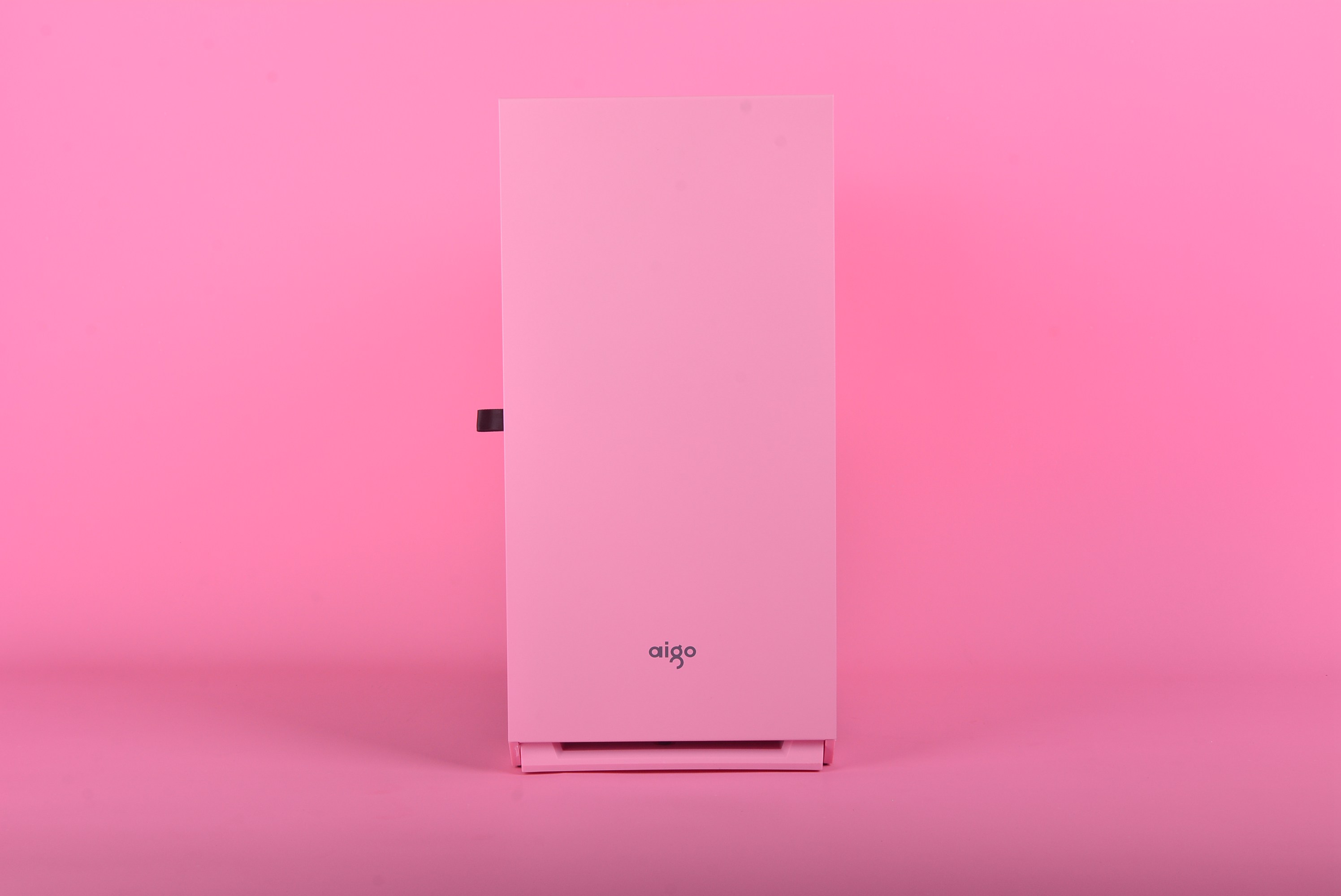 YOGO M2的前面板取消了进风口,换来的是一体感极强的无孔面板,小清新的感觉反而增加了不少。不得不说,这个粉还真挺解毒,一直受苦于黑白机箱的我终于有款解药了。