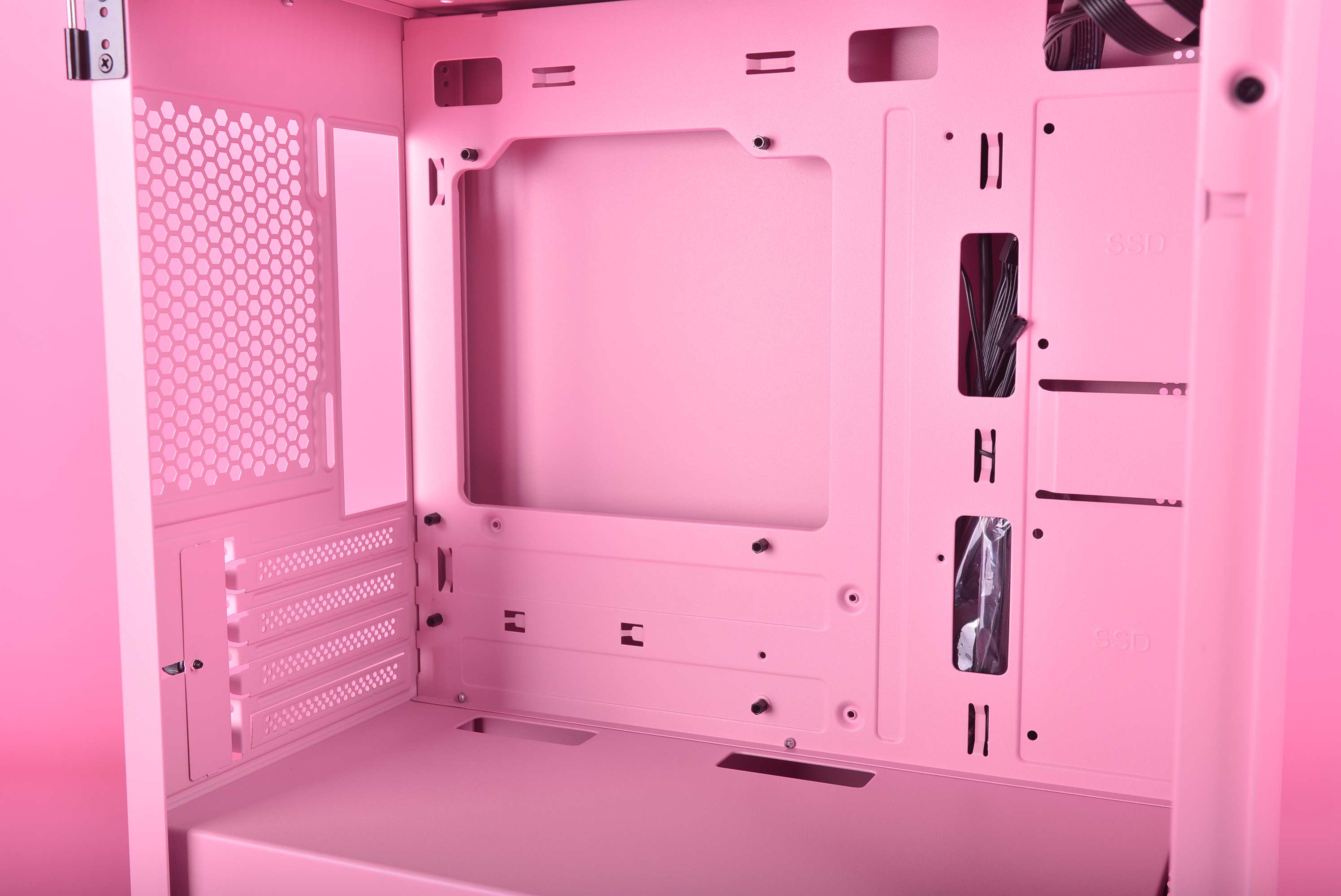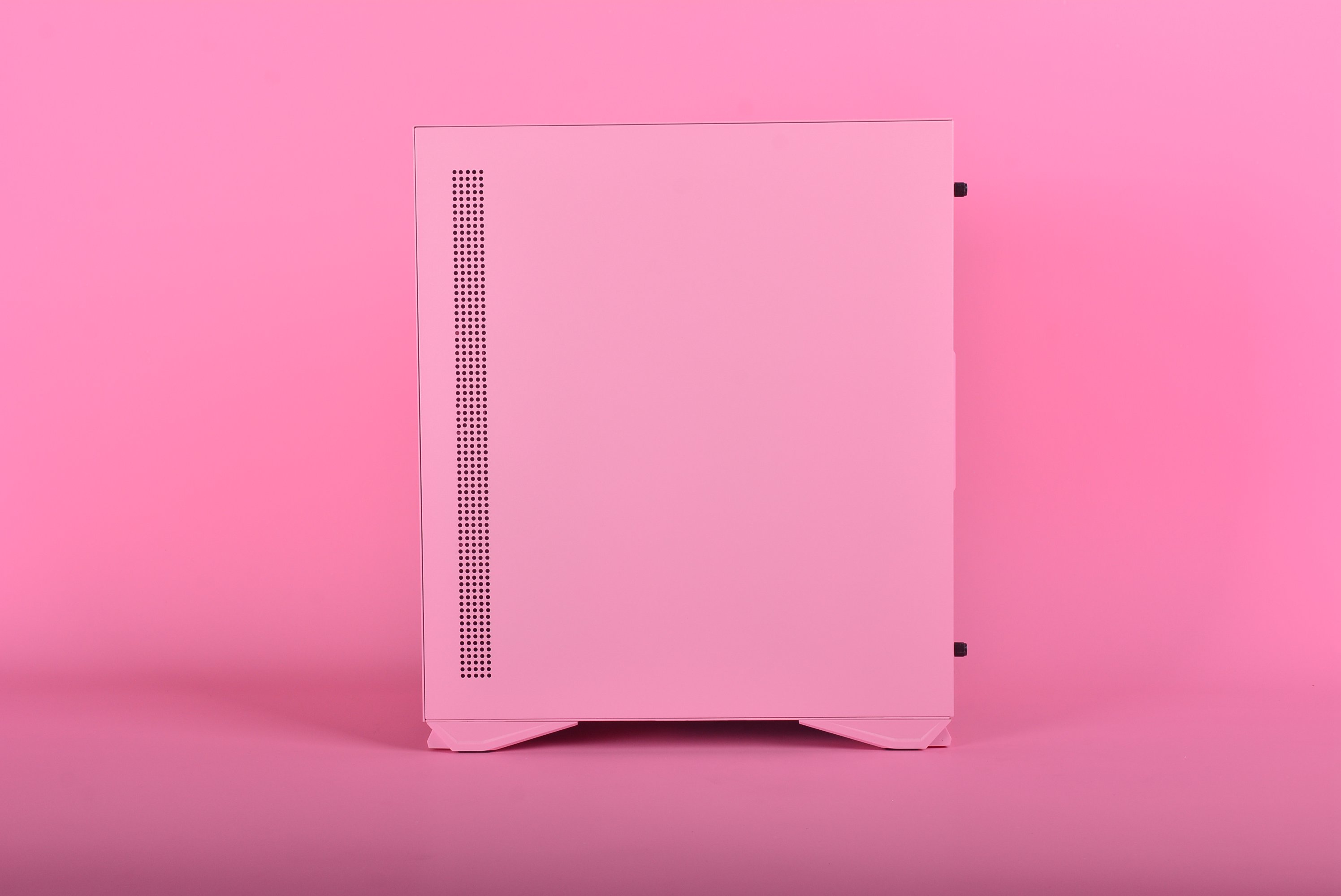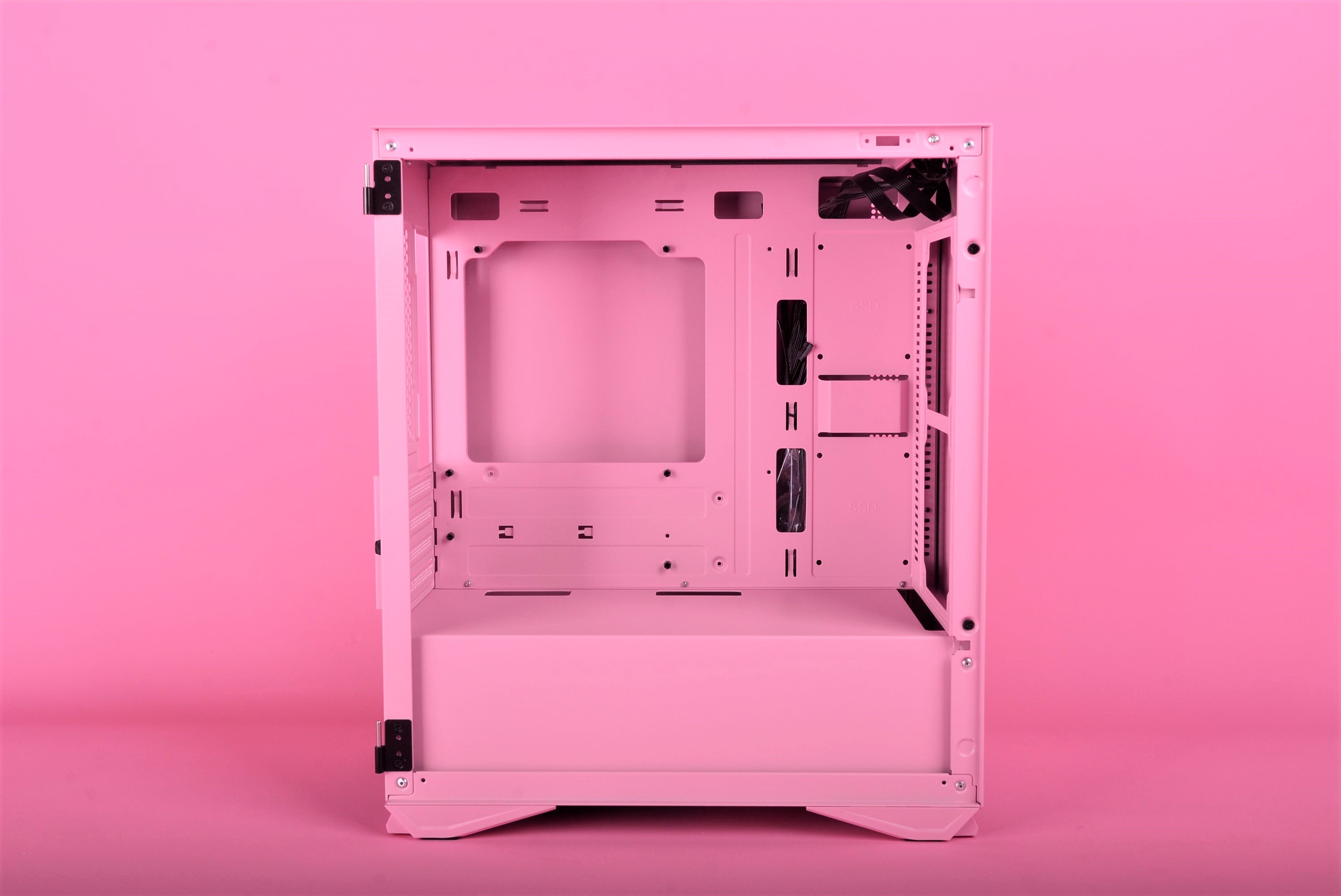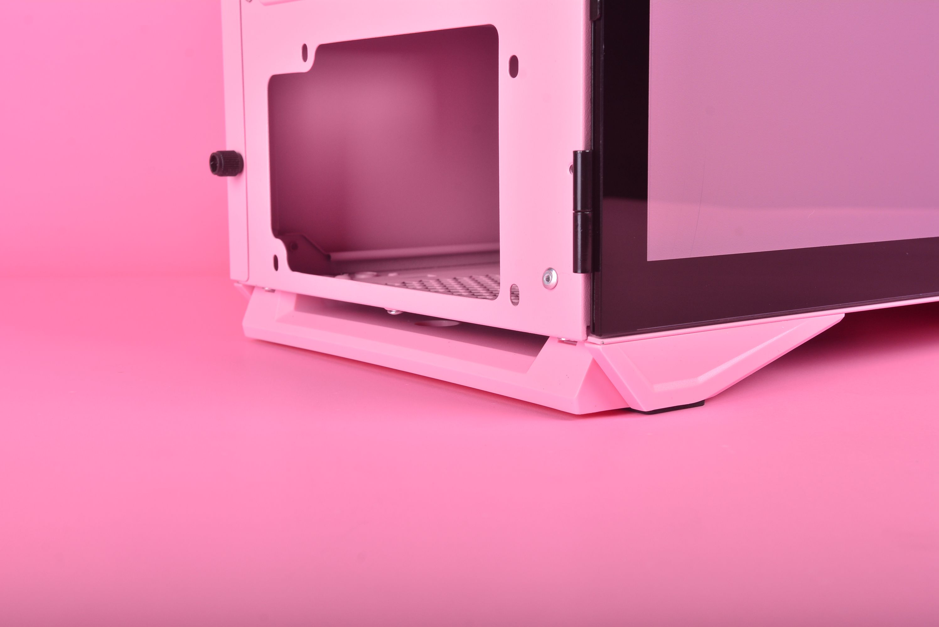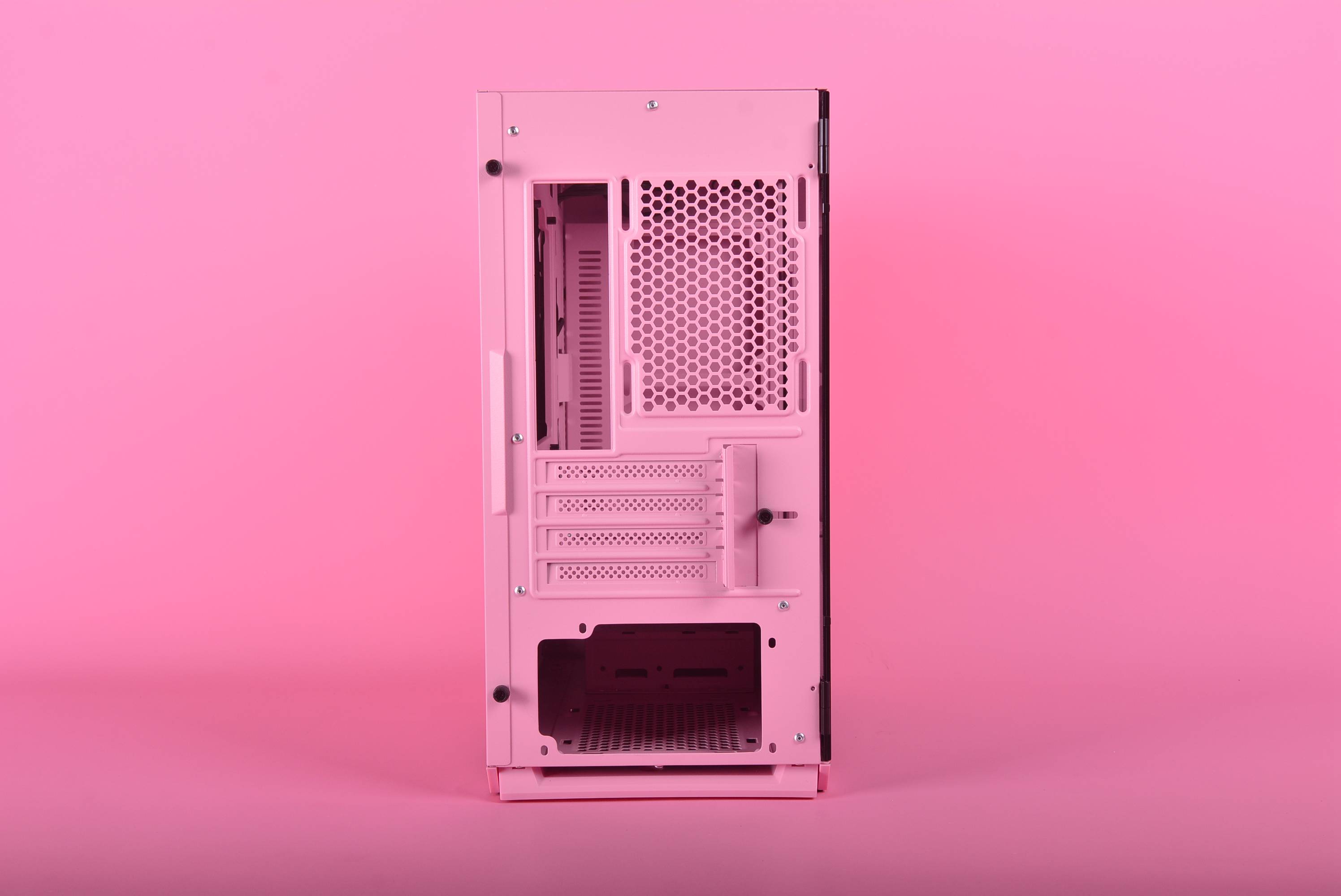 机箱粉红色的配色令人垂涎欲滴,YOGO M2的粉是淡淡的粉色,给人一种非常清爽的感觉,少女心也被激发起来了。整体尺寸360*208*425mm,相较于普通的ATX机箱体积上已经大为减少了。