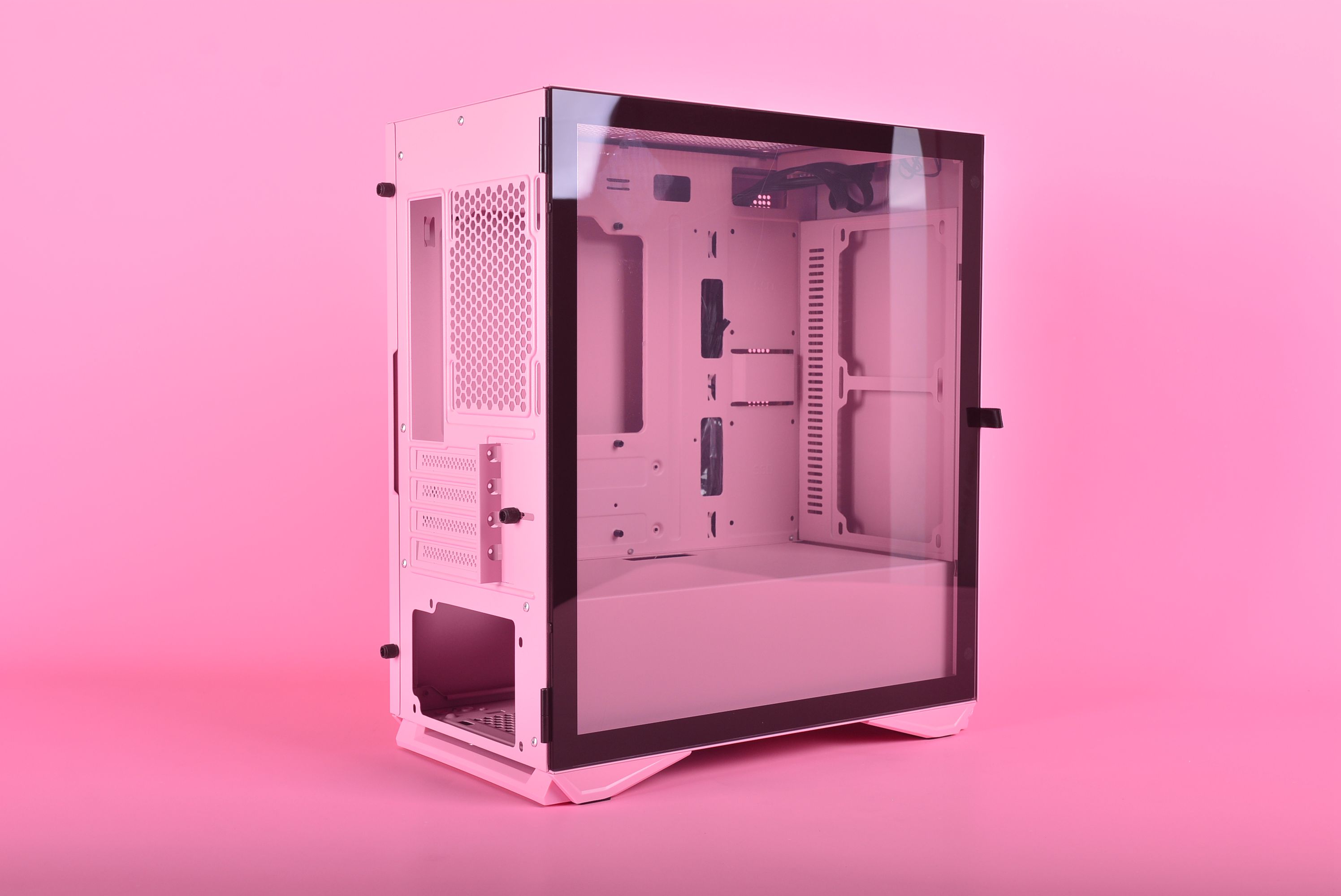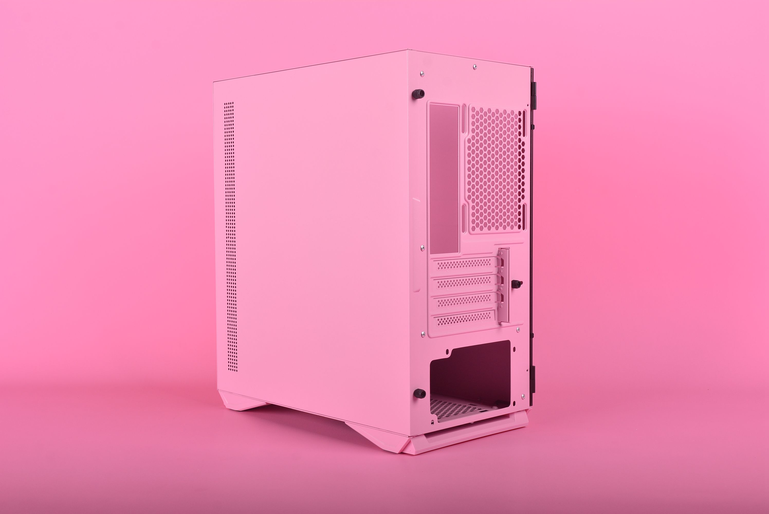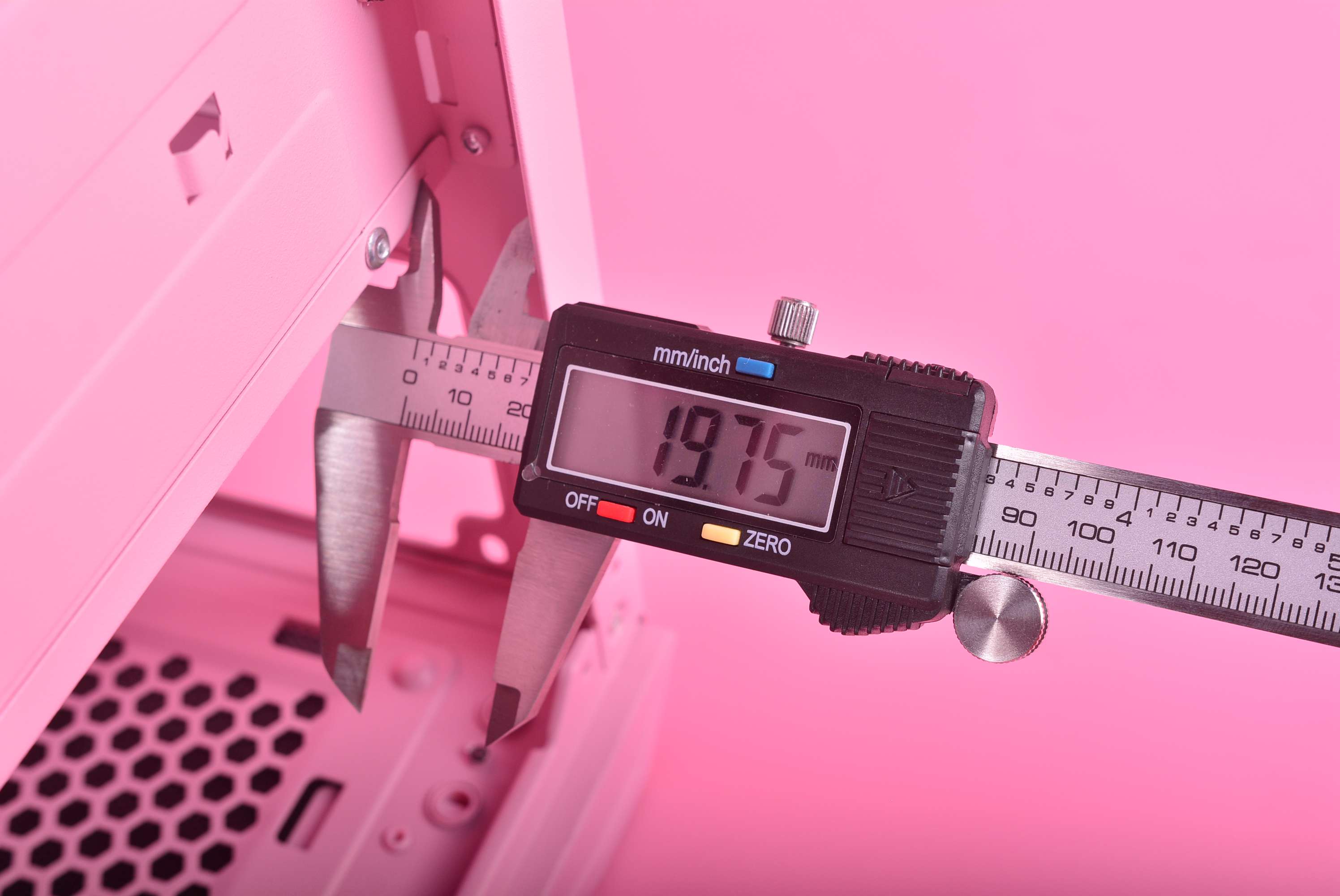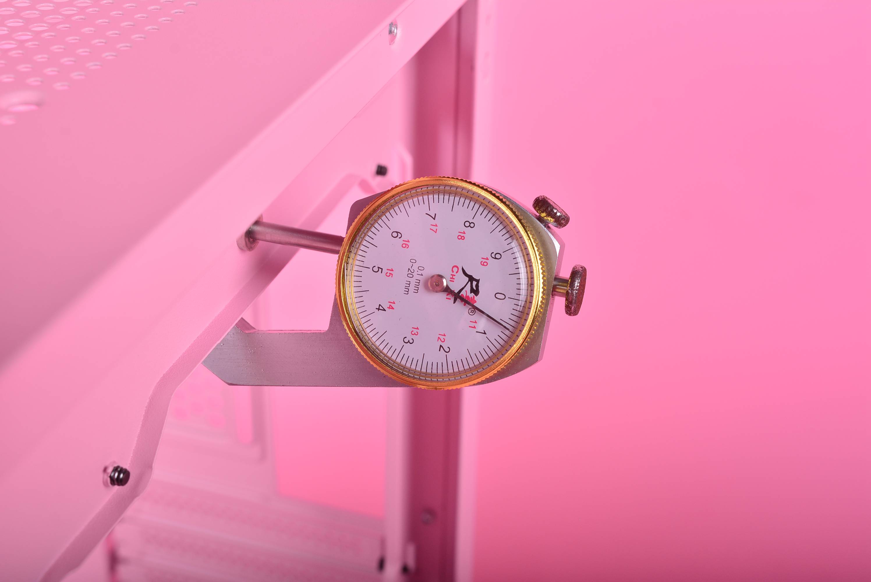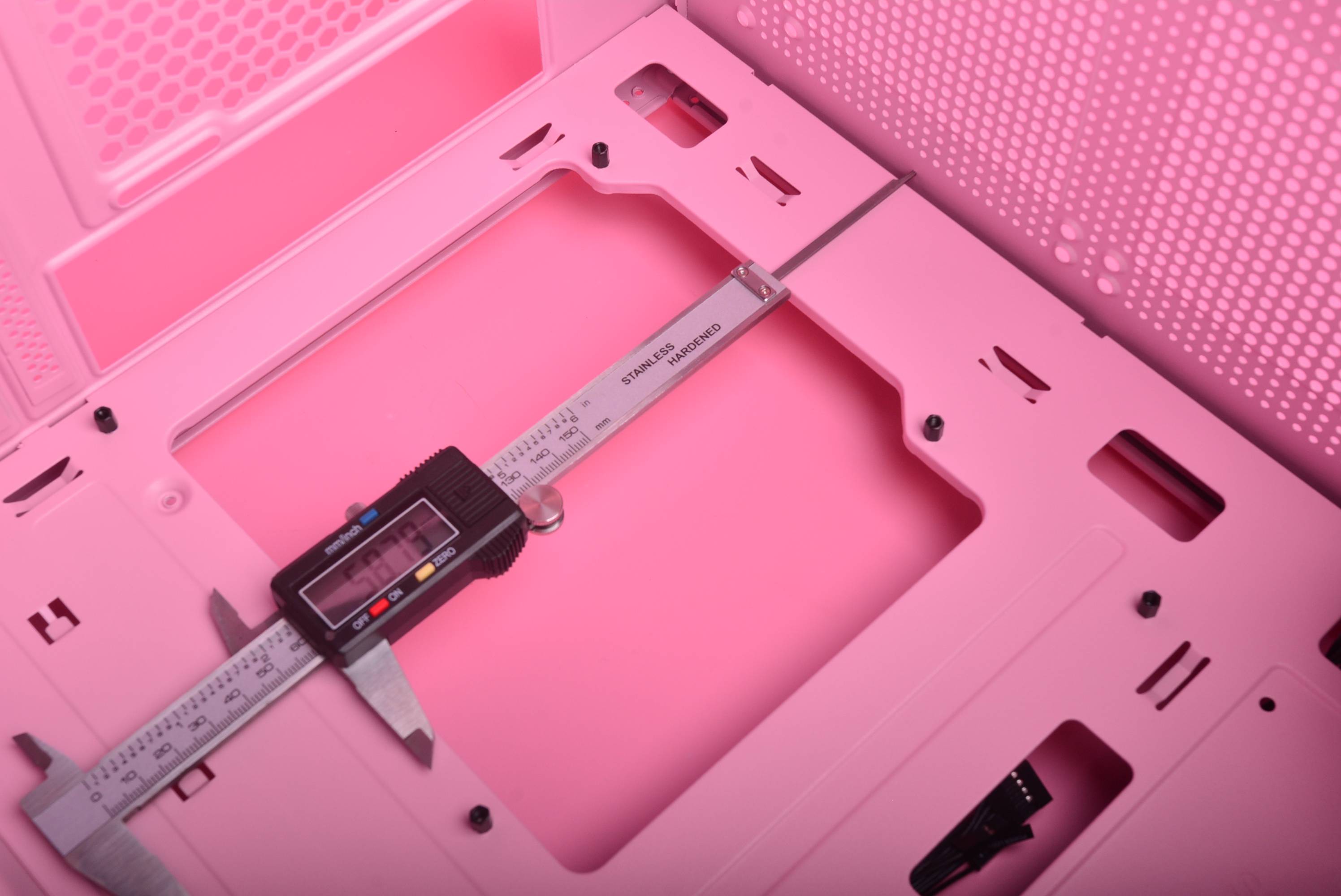 机箱粉红色的配色令人垂涎欲滴,YOGO M2的粉是淡淡的粉色,给人一种非常清爽的感觉,少女心也被激发起来了。整体尺寸360*208*425mm,相较于普通的ATX机箱体积上已经大为减少了。