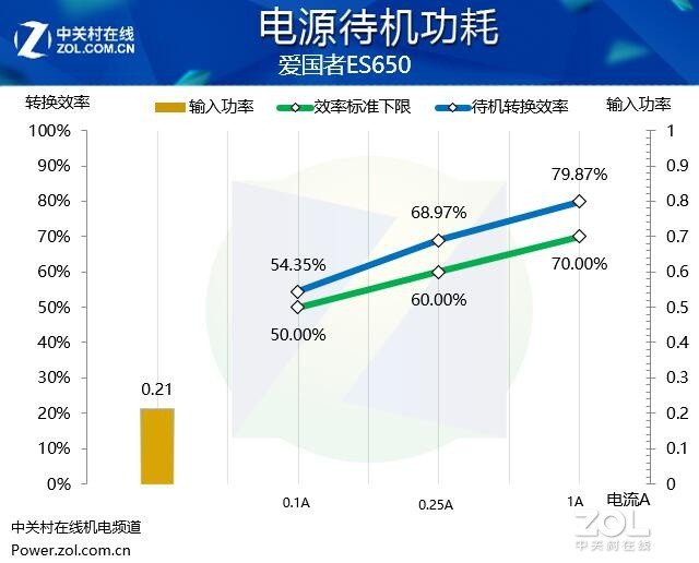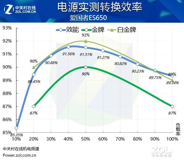 ES650电源的额定功率为650W,可以为单卡旗舰平台提供用电支持,电源经过80 PLUS金牌认证,在实际测试中表现良好,各项转换效率可以达到金牌效能,满载转换效率可以达到白金效能。电源的待机功耗只有0.1W,整体的节能效果也很好。