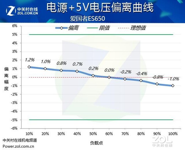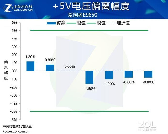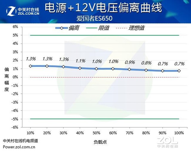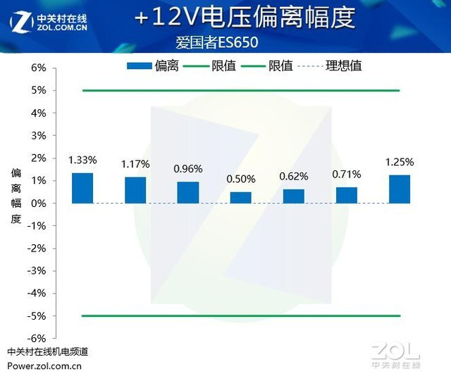 在电压偏离测试中,爱国者ES650电源达到出色水平,各路输出电压偏离全部控制在2%的幅度内,属于说明各路的电压输出非常稳定。