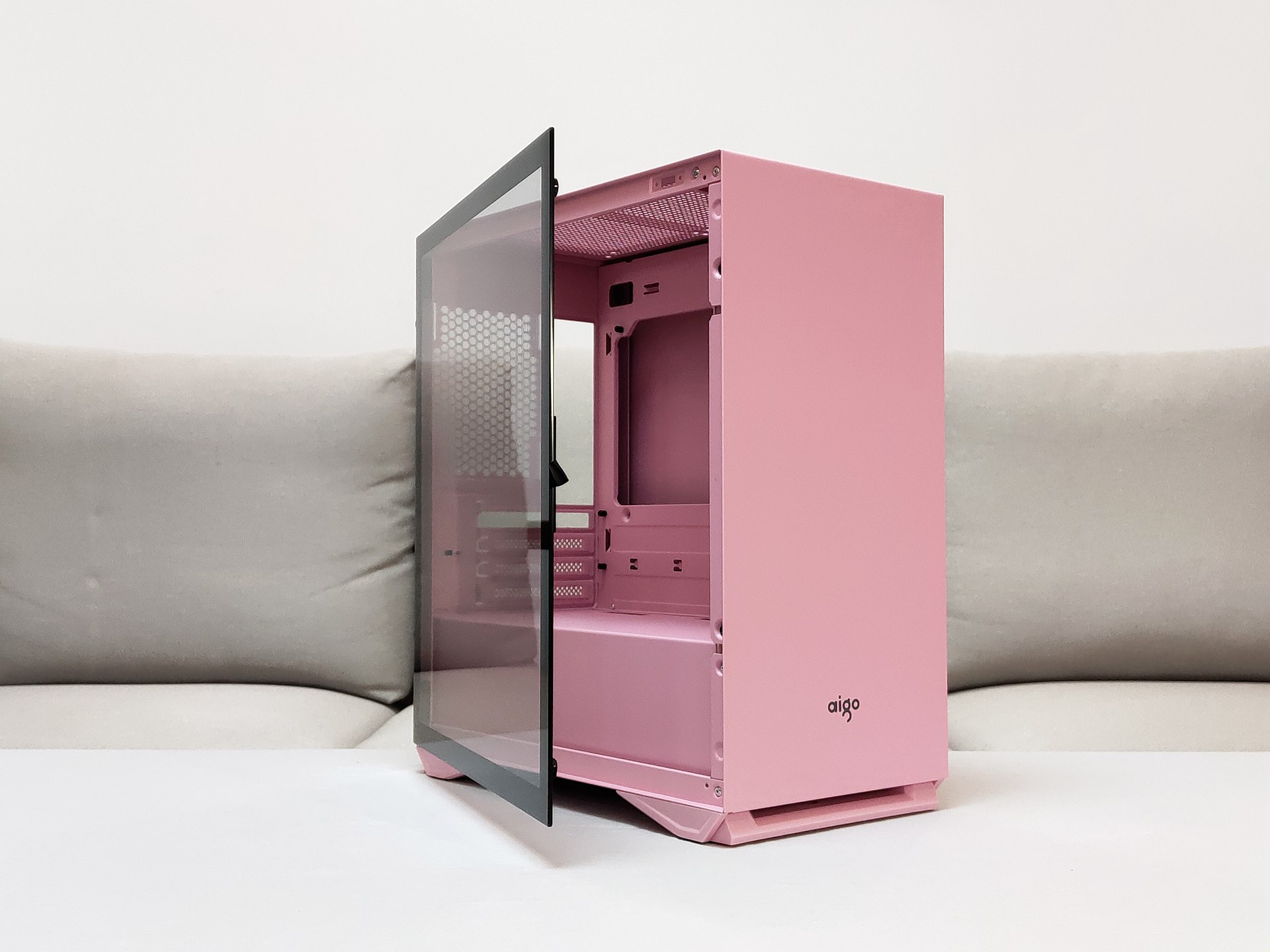 爱国者YOGO M2这款机箱在之前装过一台RX590级别的机器,当时用的是钛灰色,得益于超简洁的设计和凌厉的线条,即使是灰色颜值也显得非常高,这次的粉色款基友也是一眼就看上了,颜值即正义,颜值才是机箱的最终奥义。