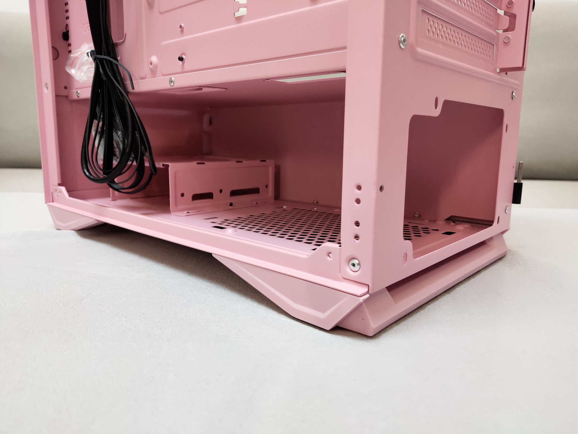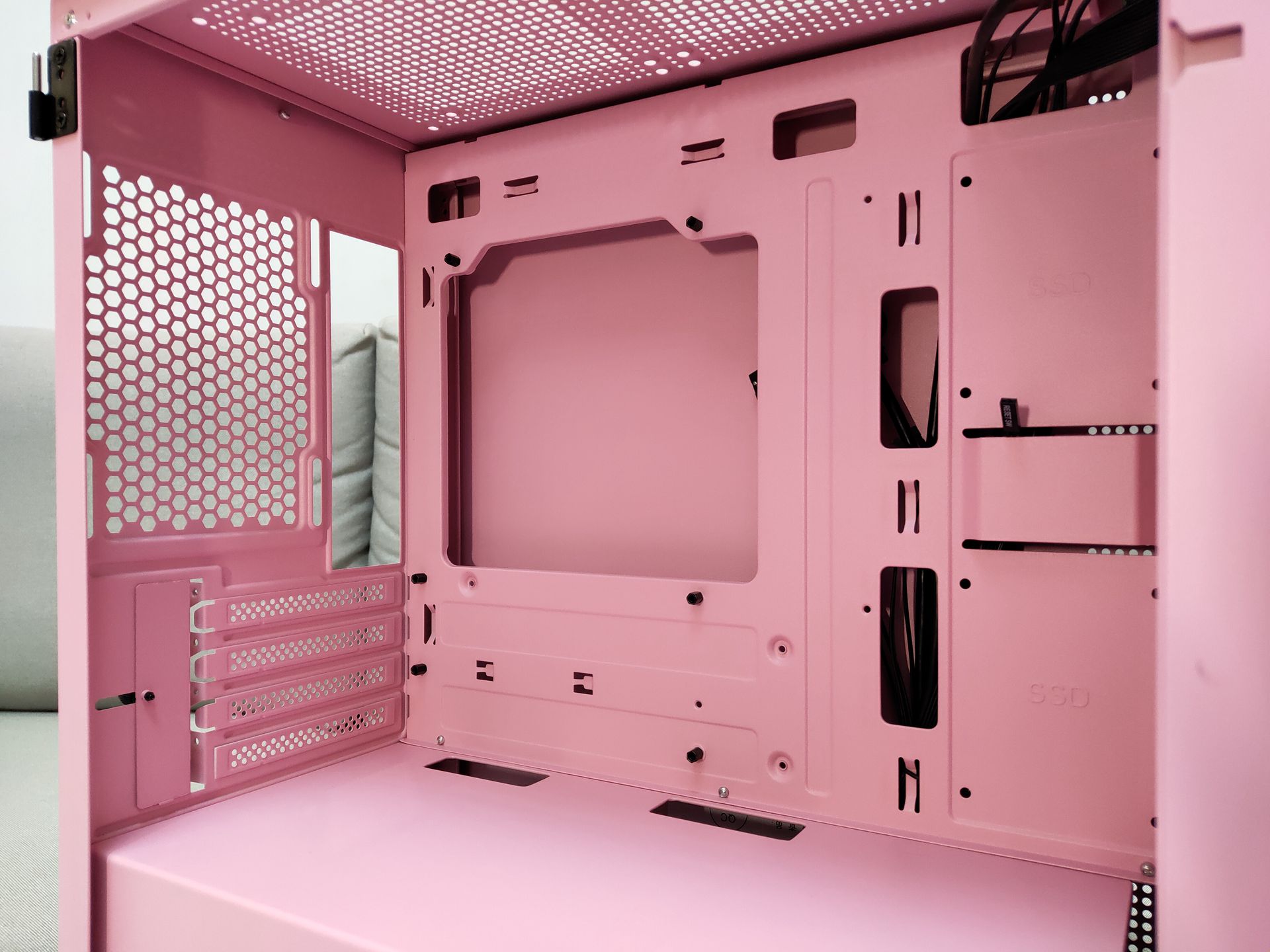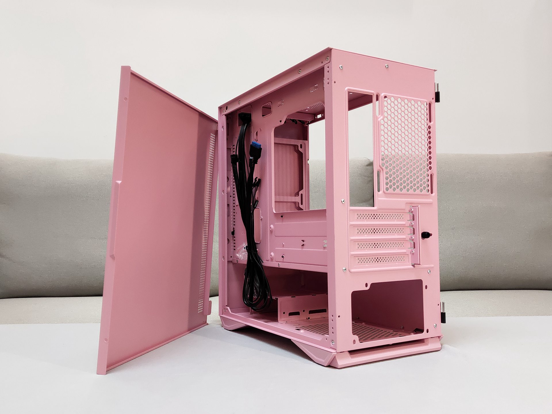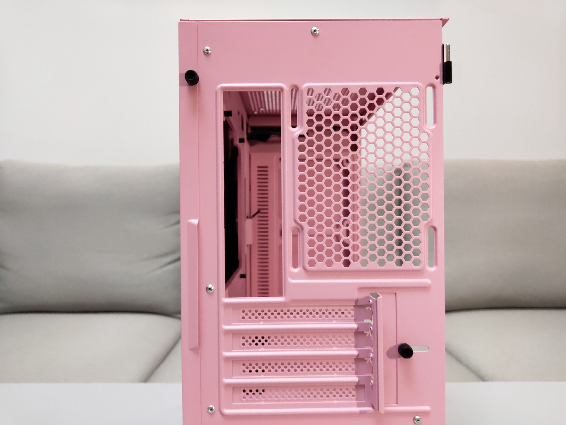 和钛灰色款相比,粉色要显得更加干净、明亮,正面磨砂、亲肤的设计给人一种娇(粉)艳(嫩)欲滴的感觉。和其他款M2一样使用的磁吸开合侧板设计,只需轻轻一拉即可,在安装时可以往上提来取下整块钢化玻璃侧板方便装机,记得去年装时好像忘记取下侧板来着.