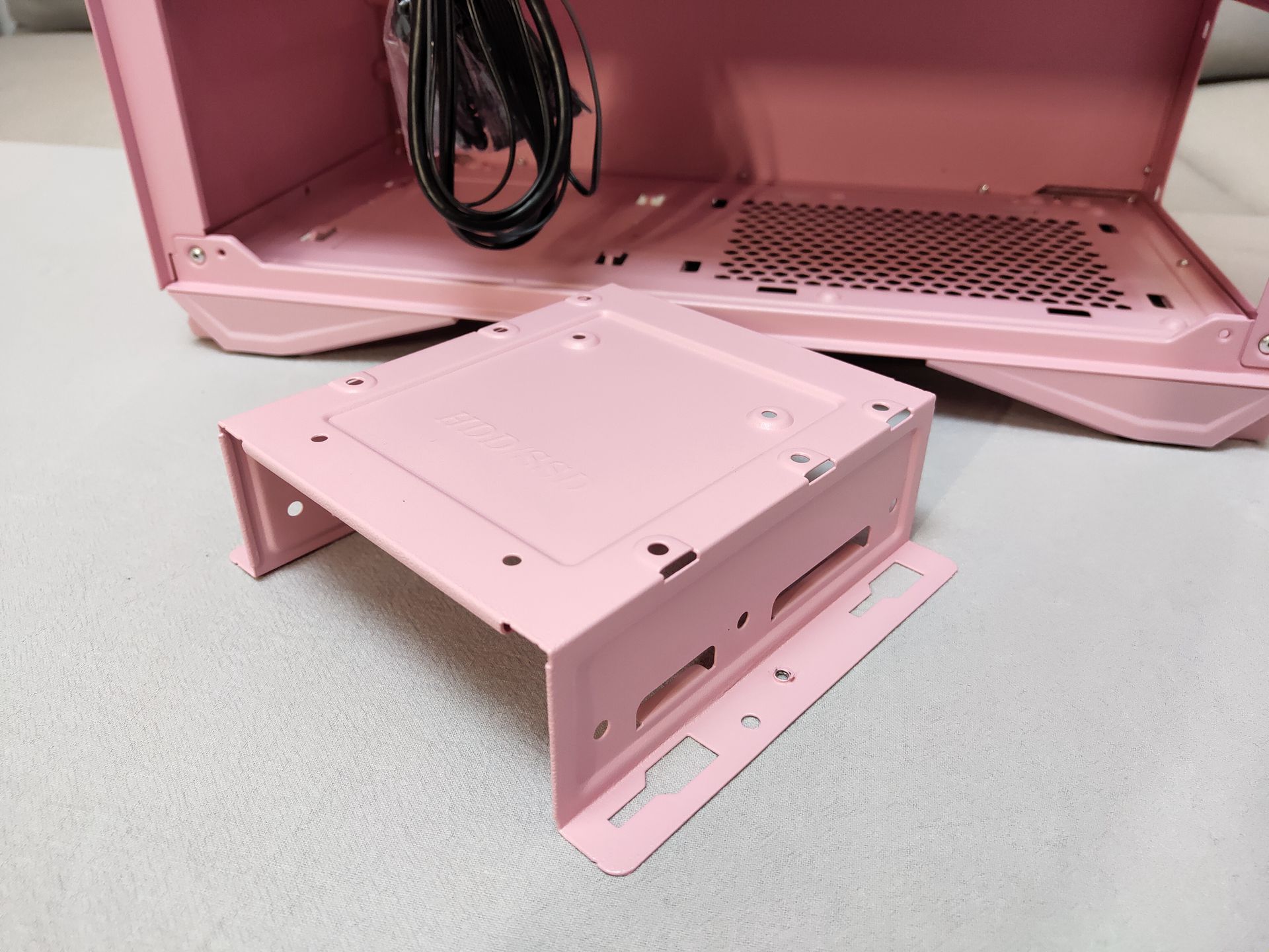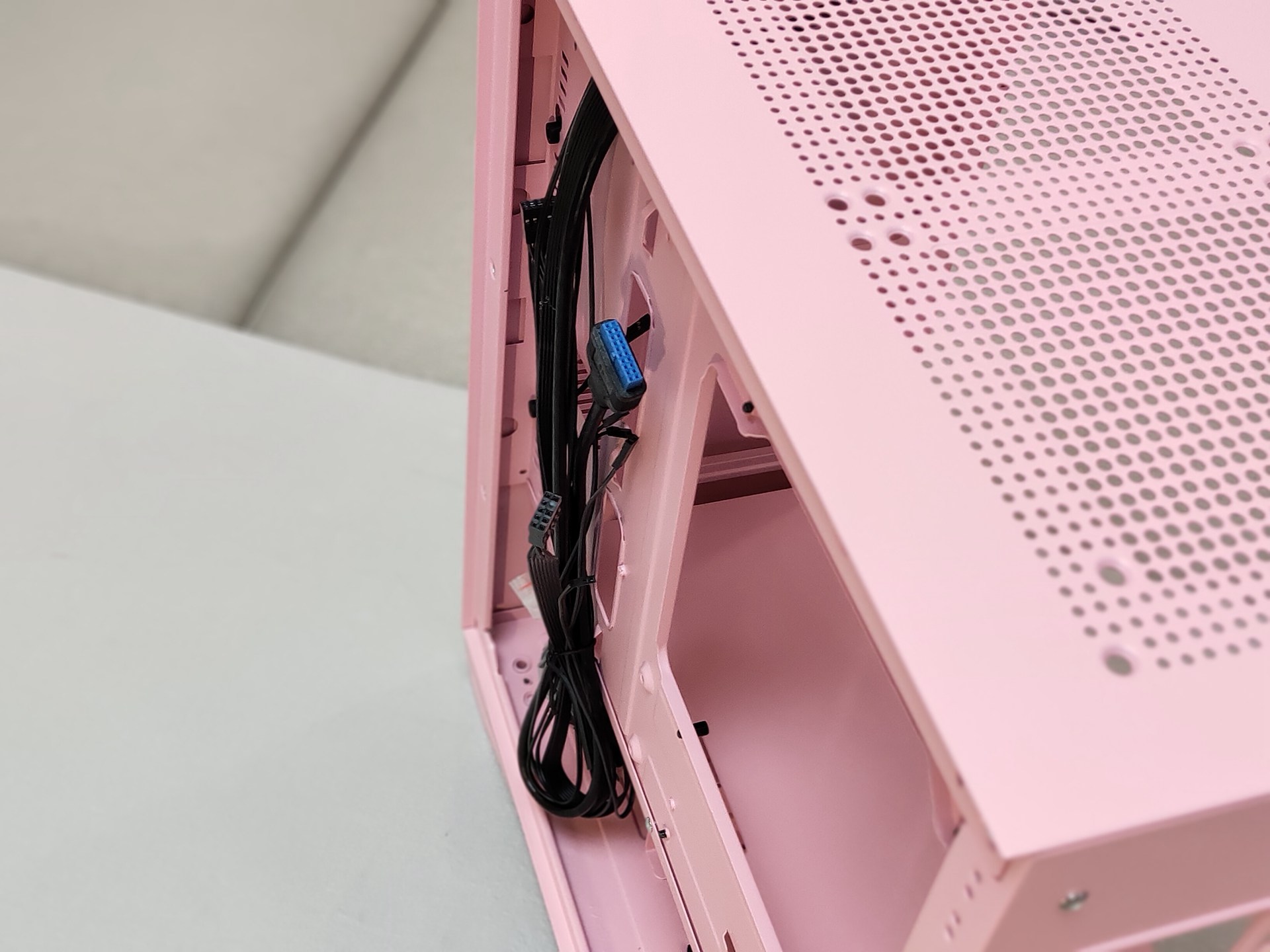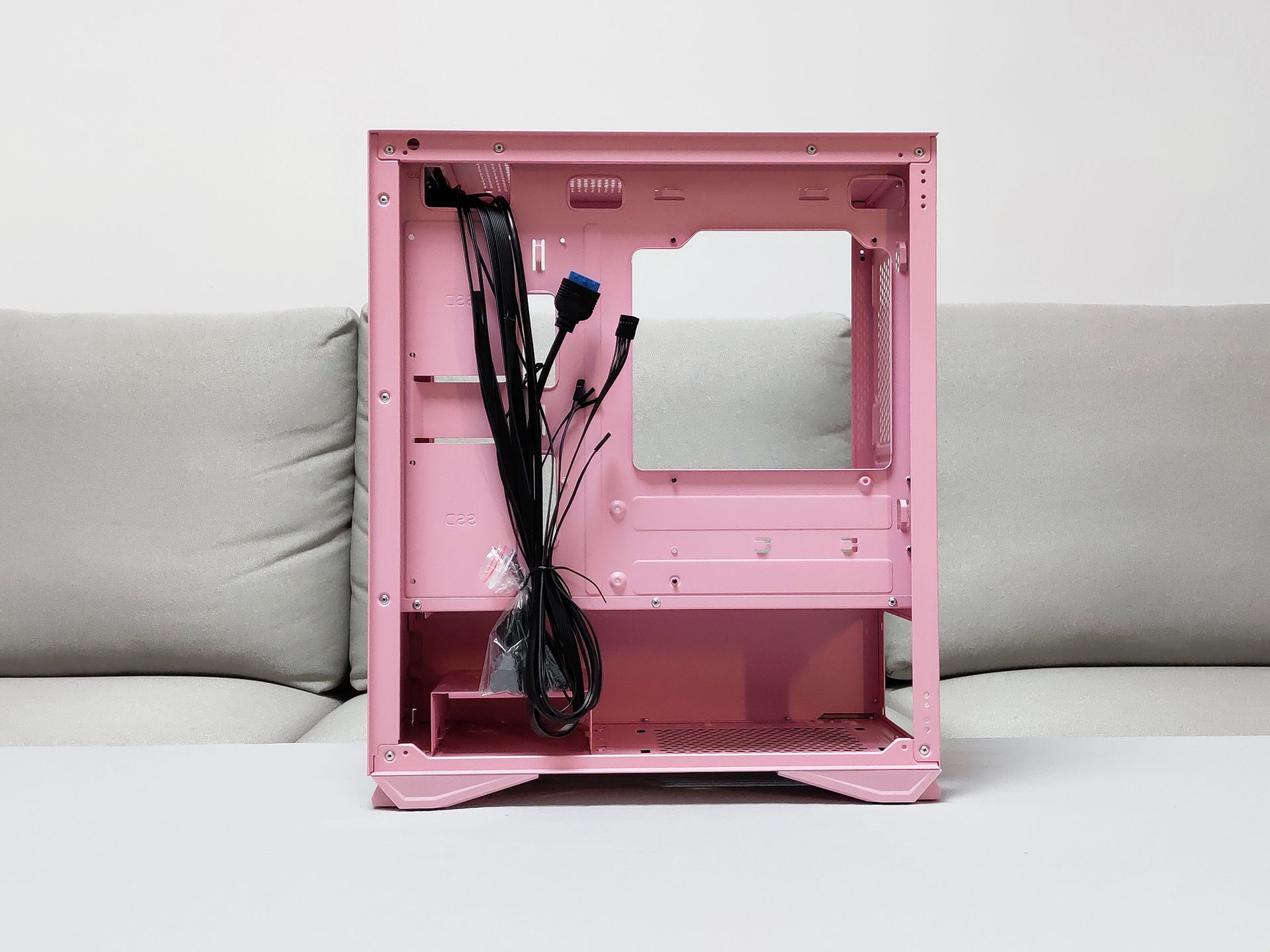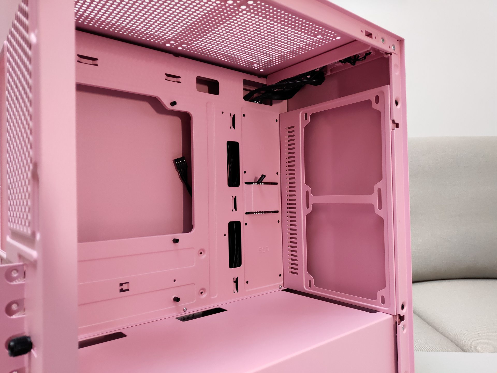 和钛灰色款相比,粉色要显得更加干净、明亮,正面磨砂、亲肤的设计给人一种娇(粉)艳(嫩)欲滴的感觉。和其他款M2一样使用的磁吸开合侧板设计,只需轻轻一拉即可,在安装时可以往上提来取下整块钢化玻璃侧板方便装机,记得去年装时好像忘记取下侧板来着.