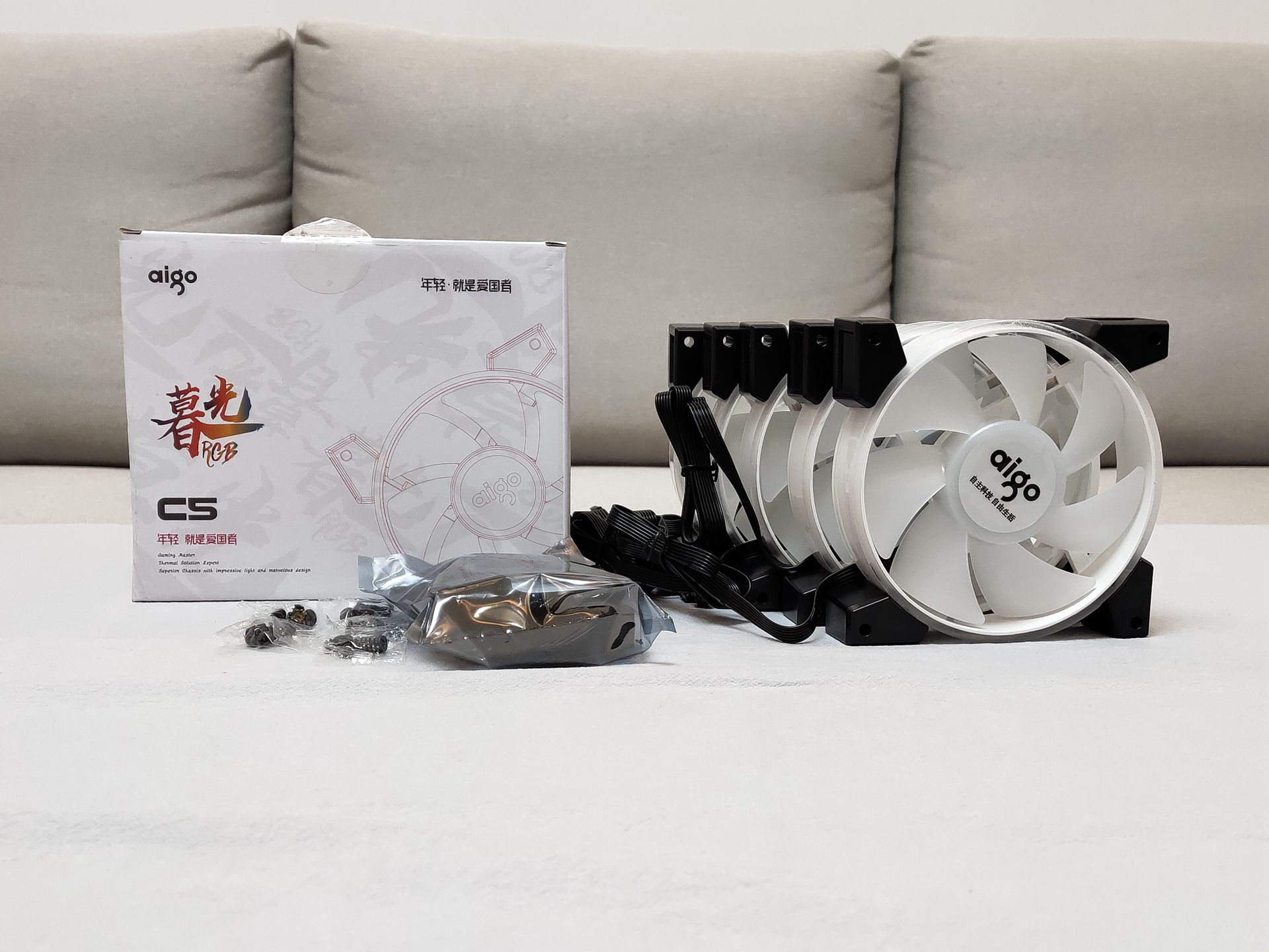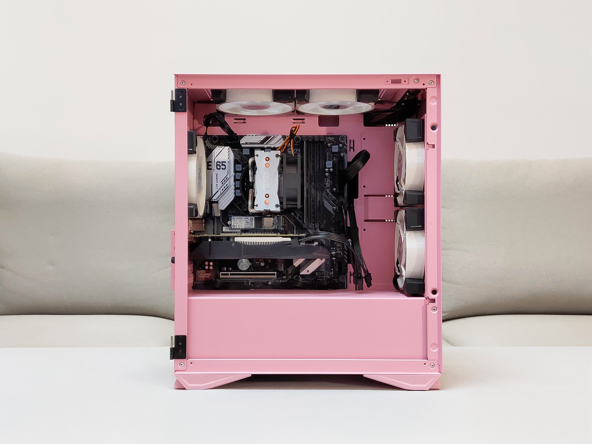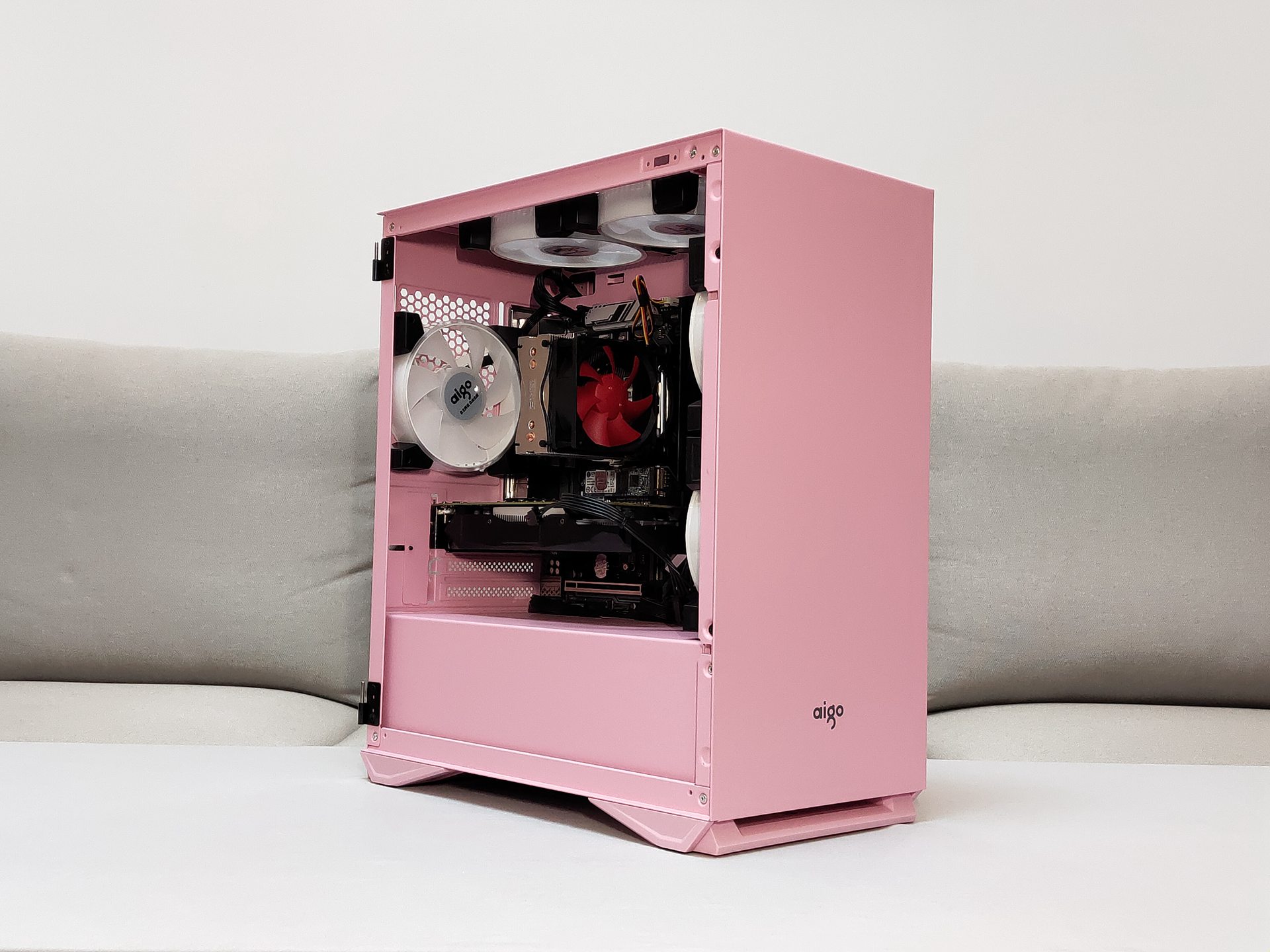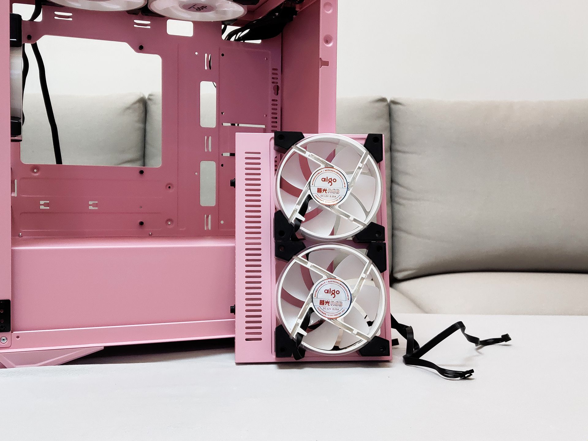 安装散热风扇,机箱风扇使用的同一家的暮光C5 RGB风扇,可以营造一个整体比较粉的效果,至于CPU散热器红海mini的那一抹红就忽略吧,谁让是我送他的他自然也不会嫌弃。安装了双风扇的显卡以及120mm的RGB风扇后可以比较直观的看到内部空间比较宽裕,并不显得紧凑。