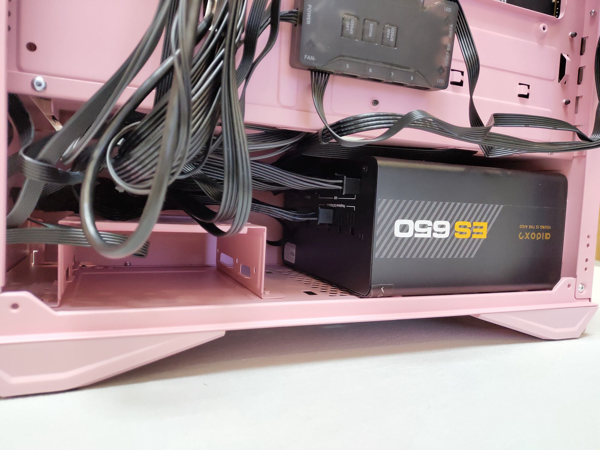 另一个侧面,硬盘架和电源仓单独一个风道,实测安装爱国者ES650这款长达160MM的模组电源时也并没有和硬盘架产生冲突,预留的厚度空间也足够埋线。