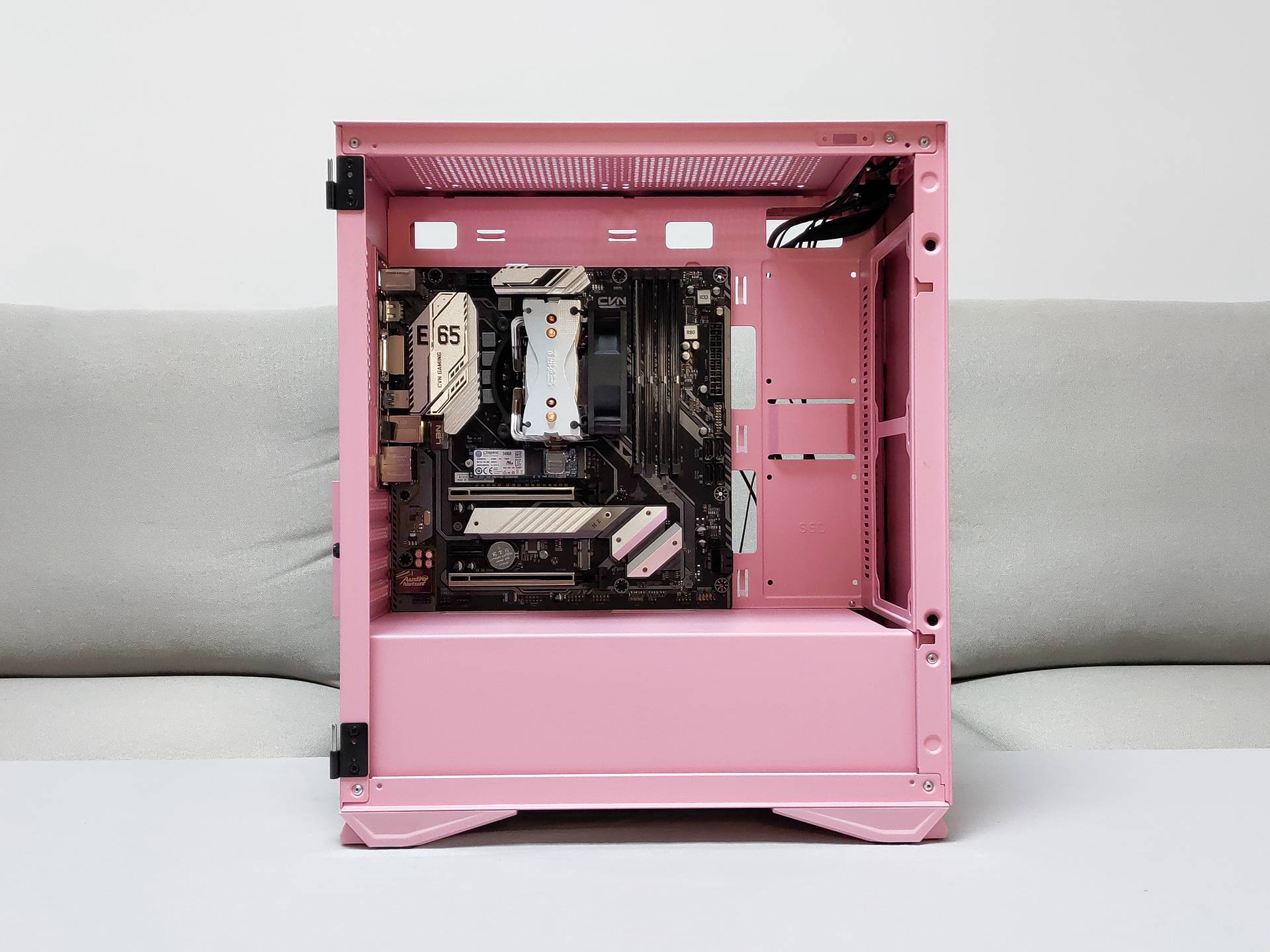 这块主板7相供电,双NVME M.2插槽,支持M.2 WiFi模块,12V RGB插针,性能不错,上次装过一次机换配置后一直没机会出掉,这次便宜出掉了,白色的散热片也还比较搭粉色,其实黑色与这款机箱也是比较搭的,机箱没有做成全粉色的应该是考虑到了搭配,追求全粉色的壕大概也不会选这个价位的,定位明确。