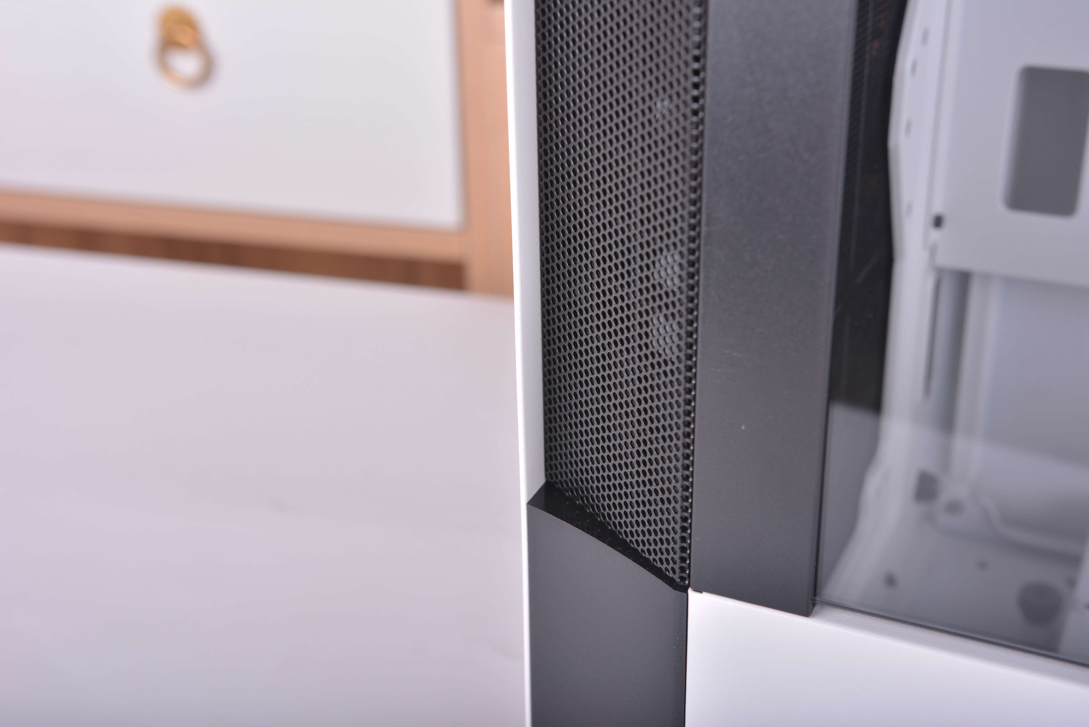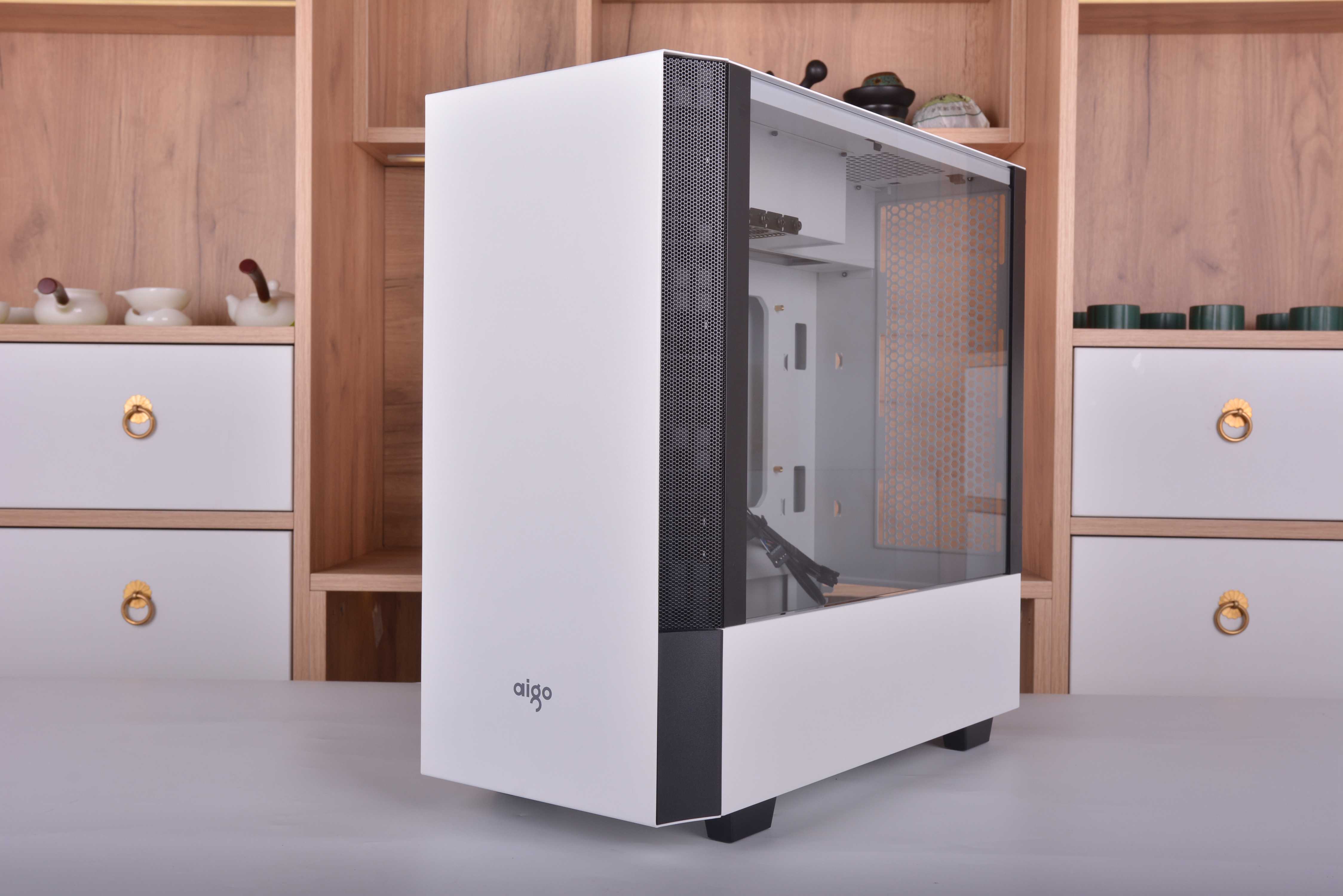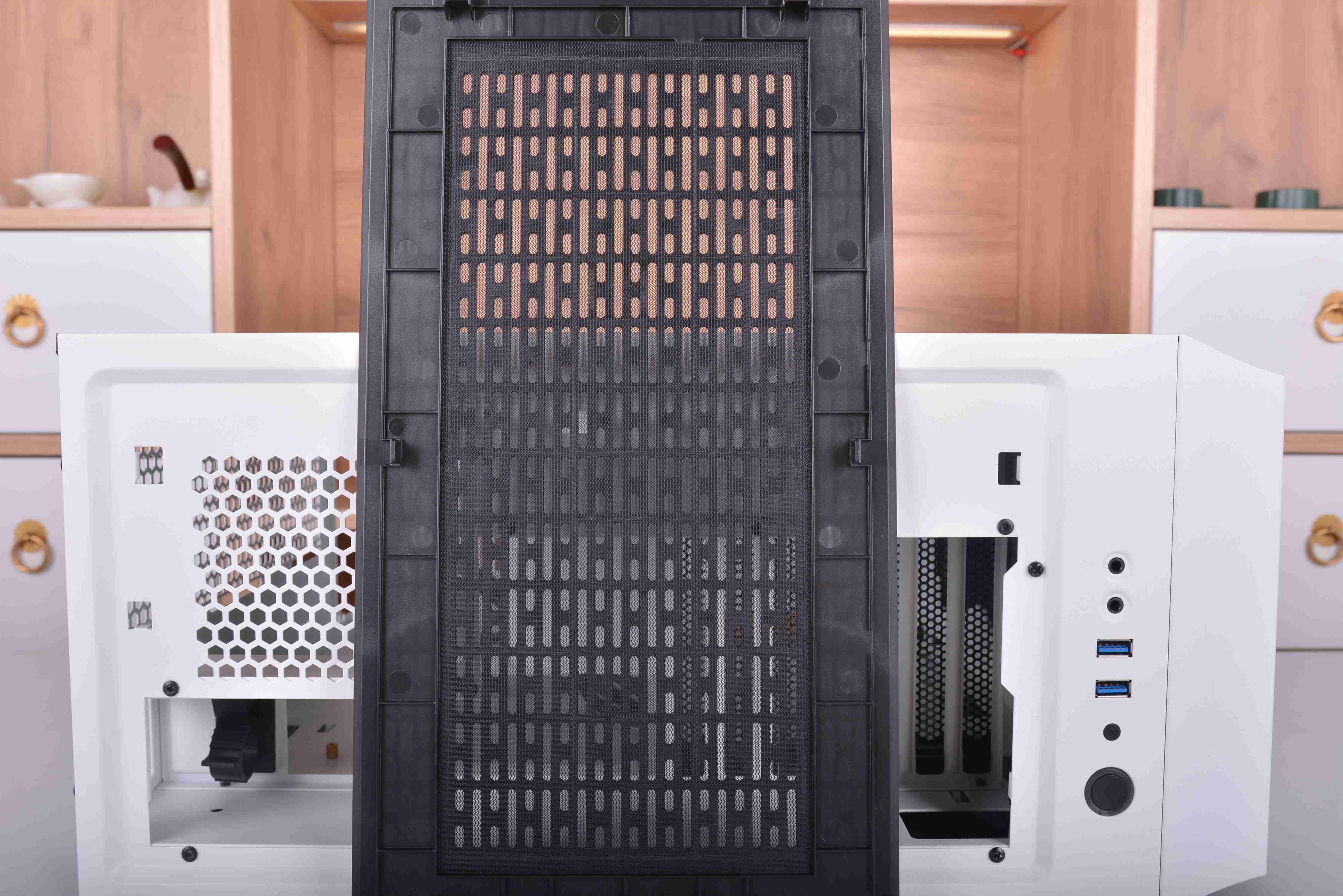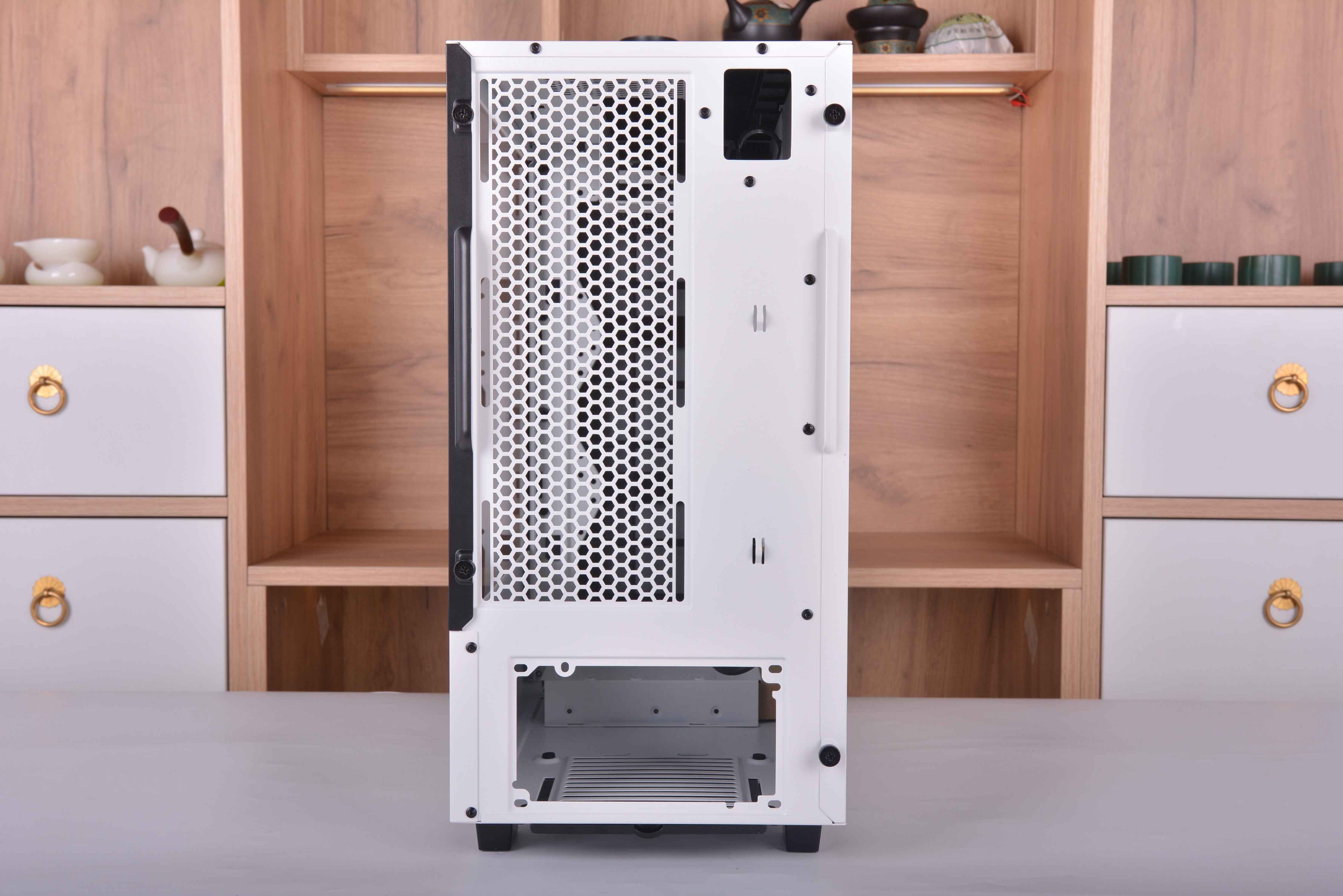 不同于常规的机箱,破晓X的侧透是开在了右方,左方则变成了背部区域,对于机箱只能放在左手边的玩家来说应该是个巨大的惊喜了,特别一些学生宿舍。我之前在学校时候,有些舍友桌子右手边是可以放东西的储物柜,一般的侧透机箱都是在左手边开的侧透,像这样情况的话就只能牺牲掉储物柜来放机箱了;但破晓X的侧透是开在右边,遇到这种情况就很好解决了,直接把箱子放在右手边就可以了。