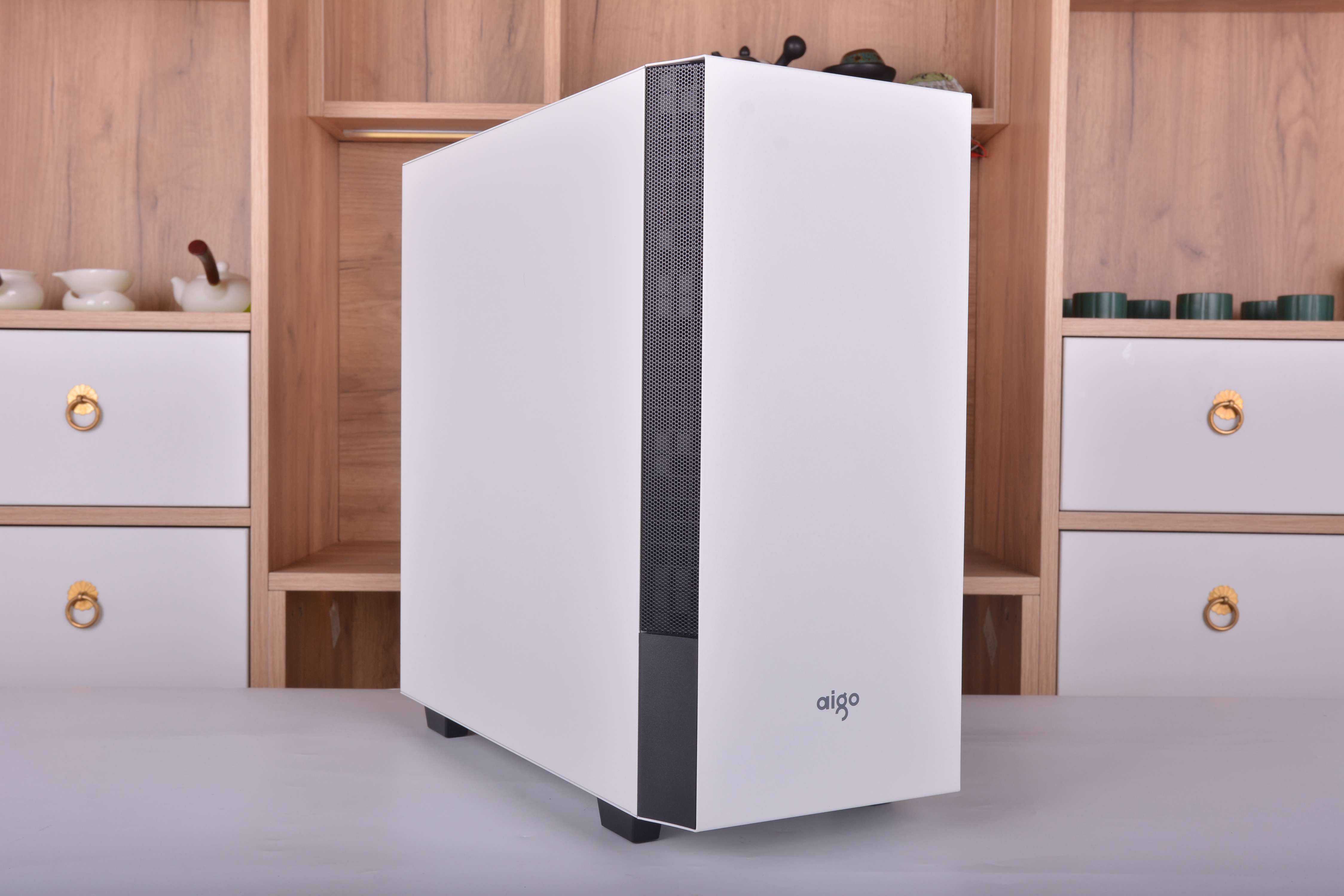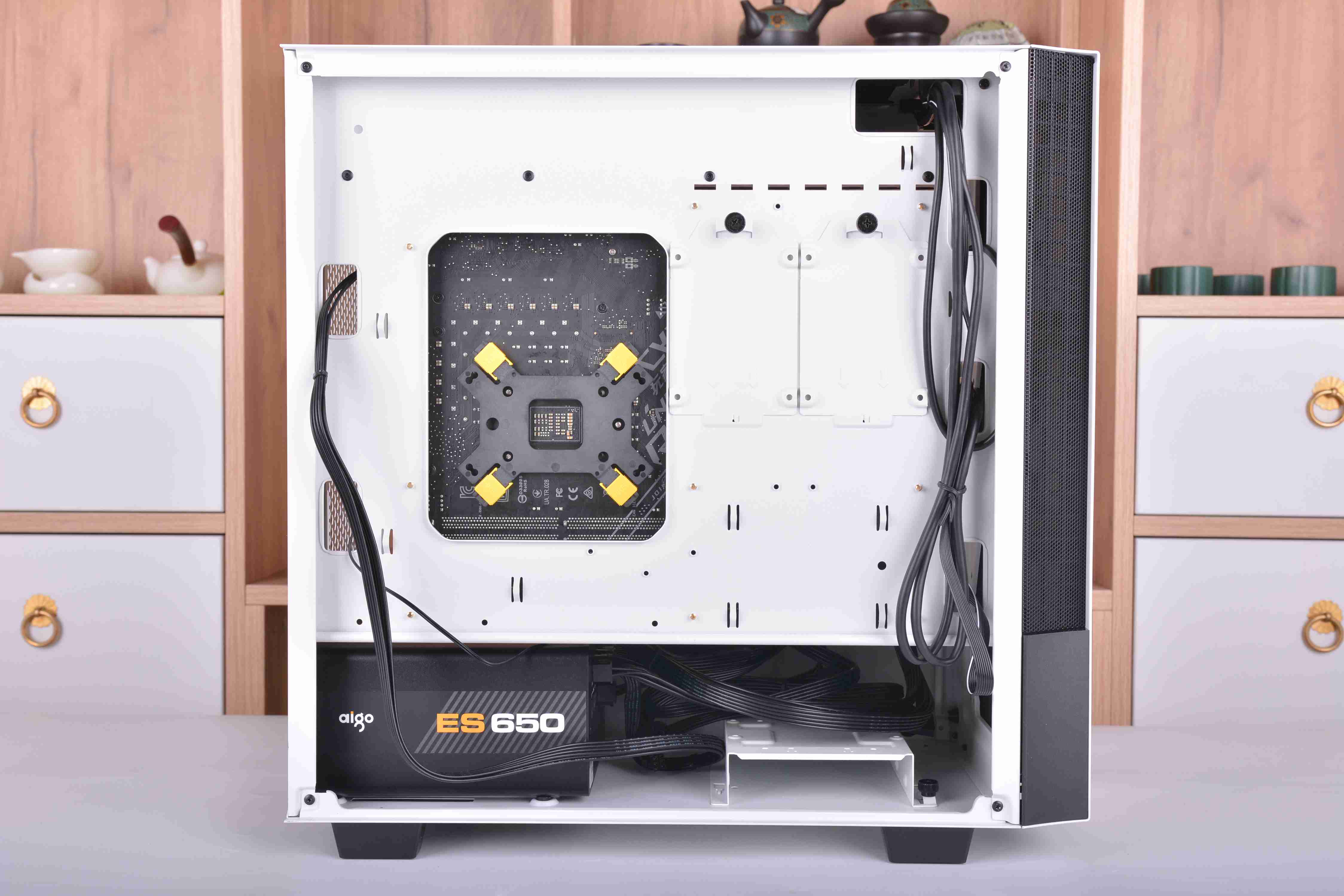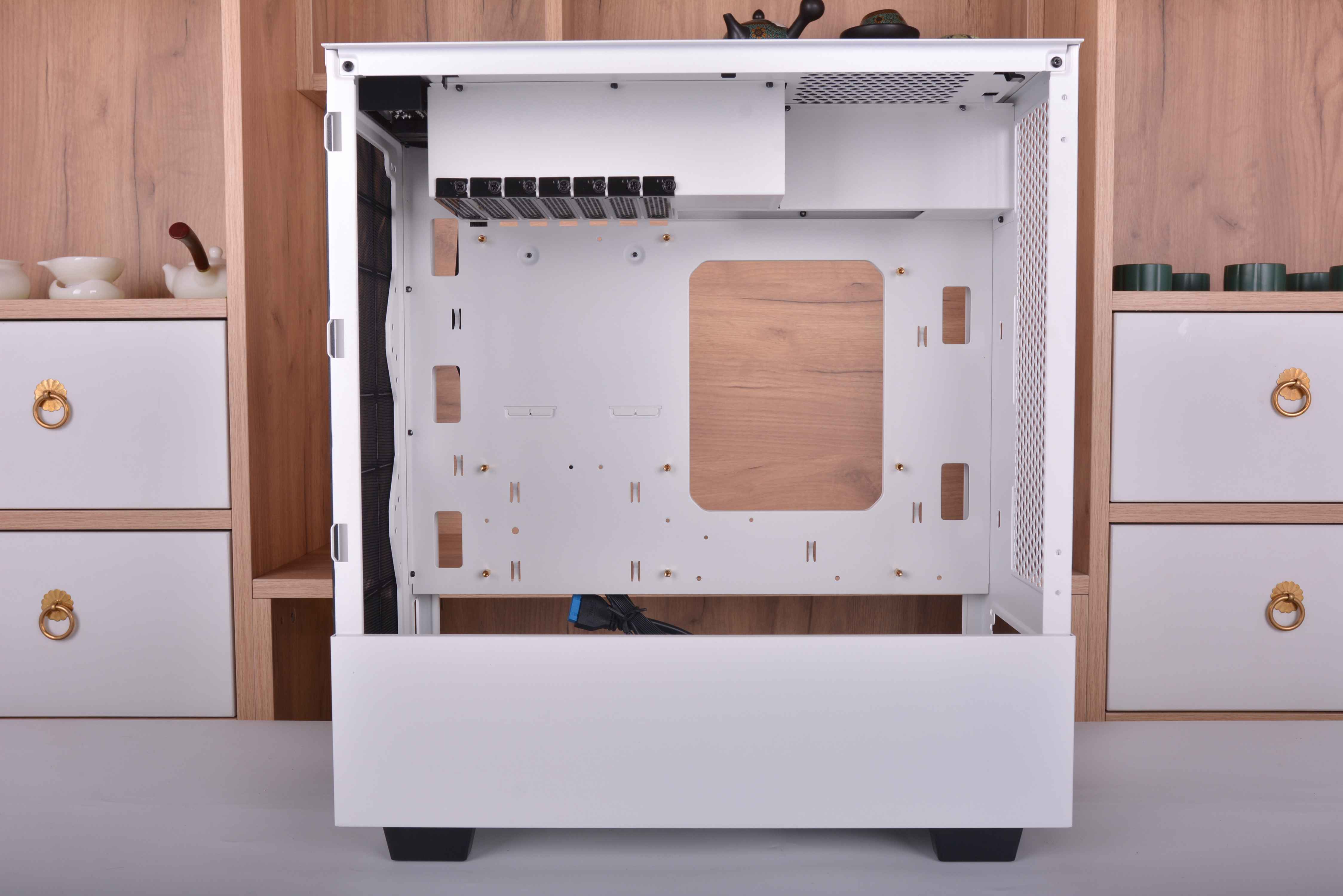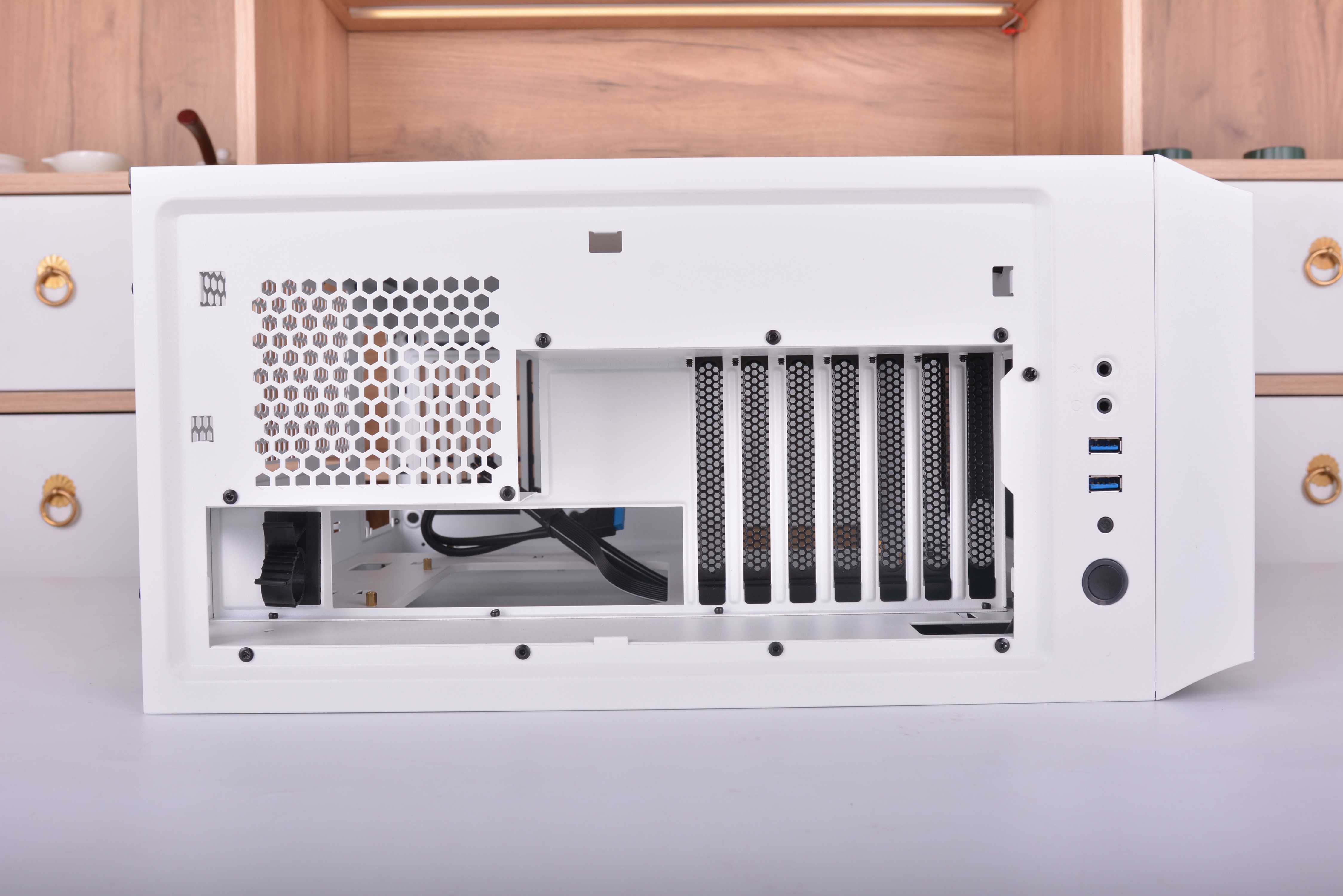 不同于常规的机箱,破晓X的侧透是开在了右方,左方则变成了背部区域,对于机箱只能放在左手边的玩家来说应该是个巨大的惊喜了,特别一些学生宿舍。我之前在学校时候,有些舍友桌子右手边是可以放东西的储物柜,一般的侧透机箱都是在左手边开的侧透,像这样情况的话就只能牺牲掉储物柜来放机箱了;但破晓X的侧透是开在右边,遇到这种情况就很好解决了,直接把箱子放在右手边就可以了。