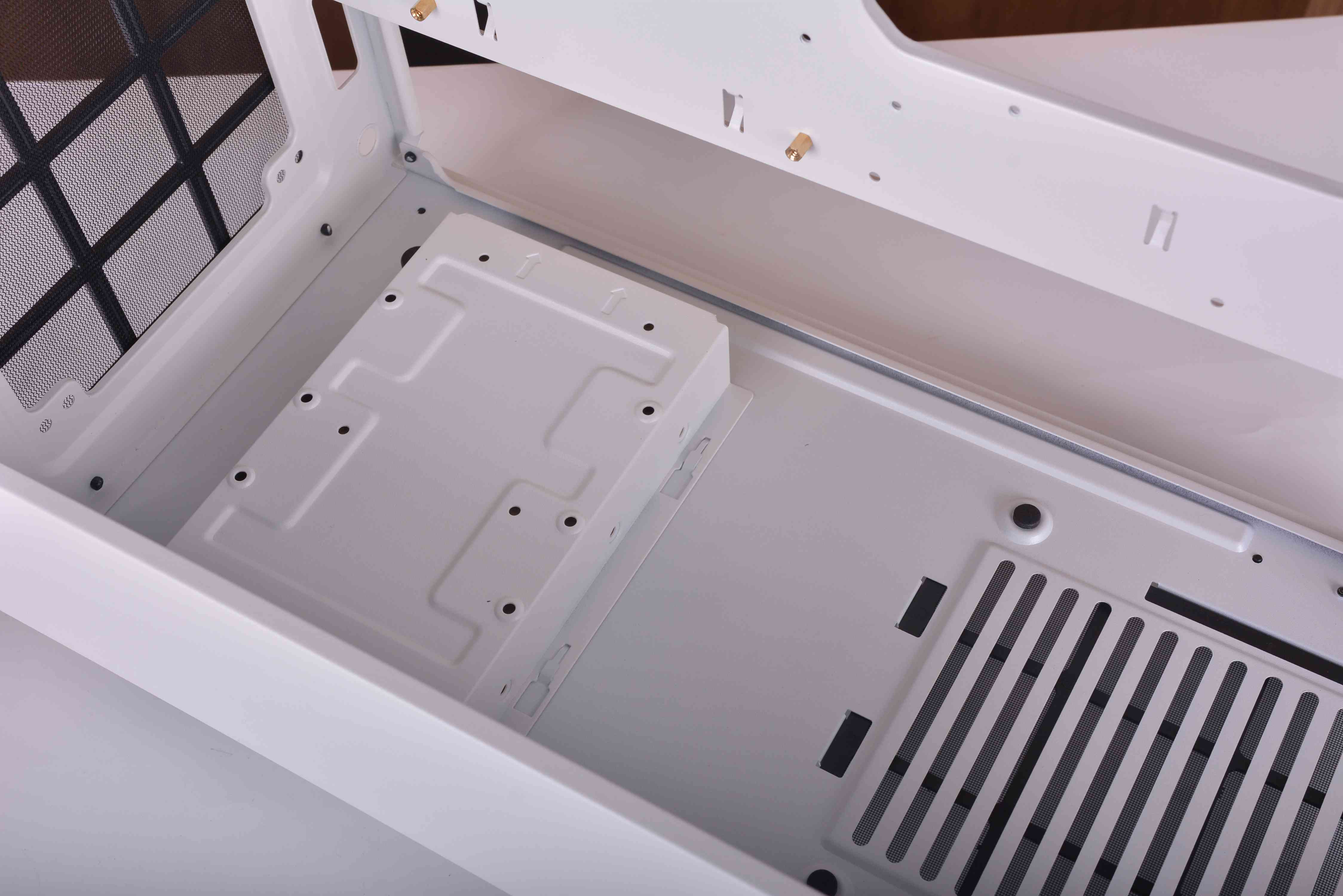 机箱的底部依然是设计成电源仓与硬盘仓的位置,也就是电源的进风口还是独立开来的。