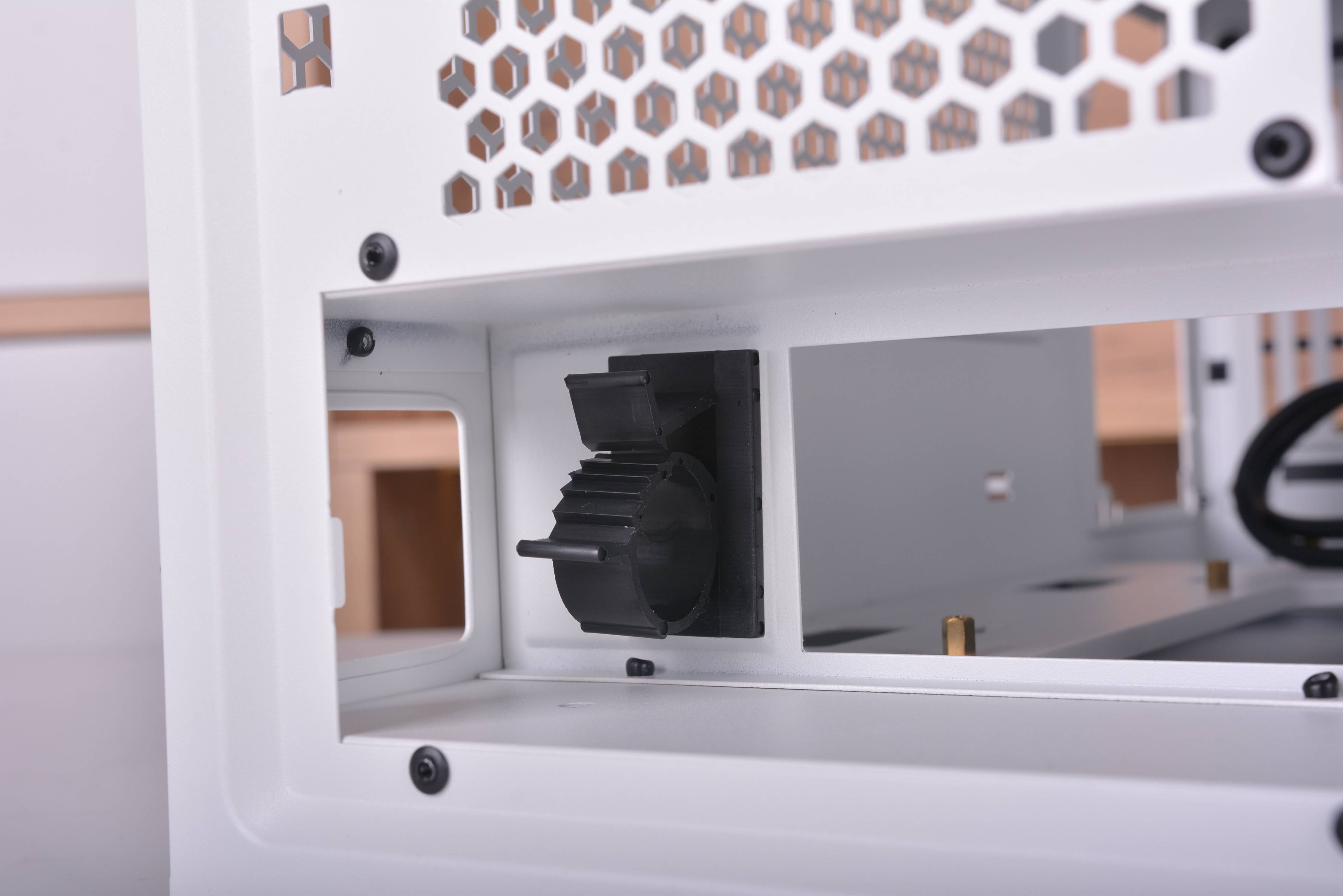 由于主板顺时针旋转了90°,一般机箱的上出风口在破晓X这里就变成了后出风口,这里可以作为安装风扇以及冷排的地方,最多可以支持240水冷以及两把12cm风扇安装。