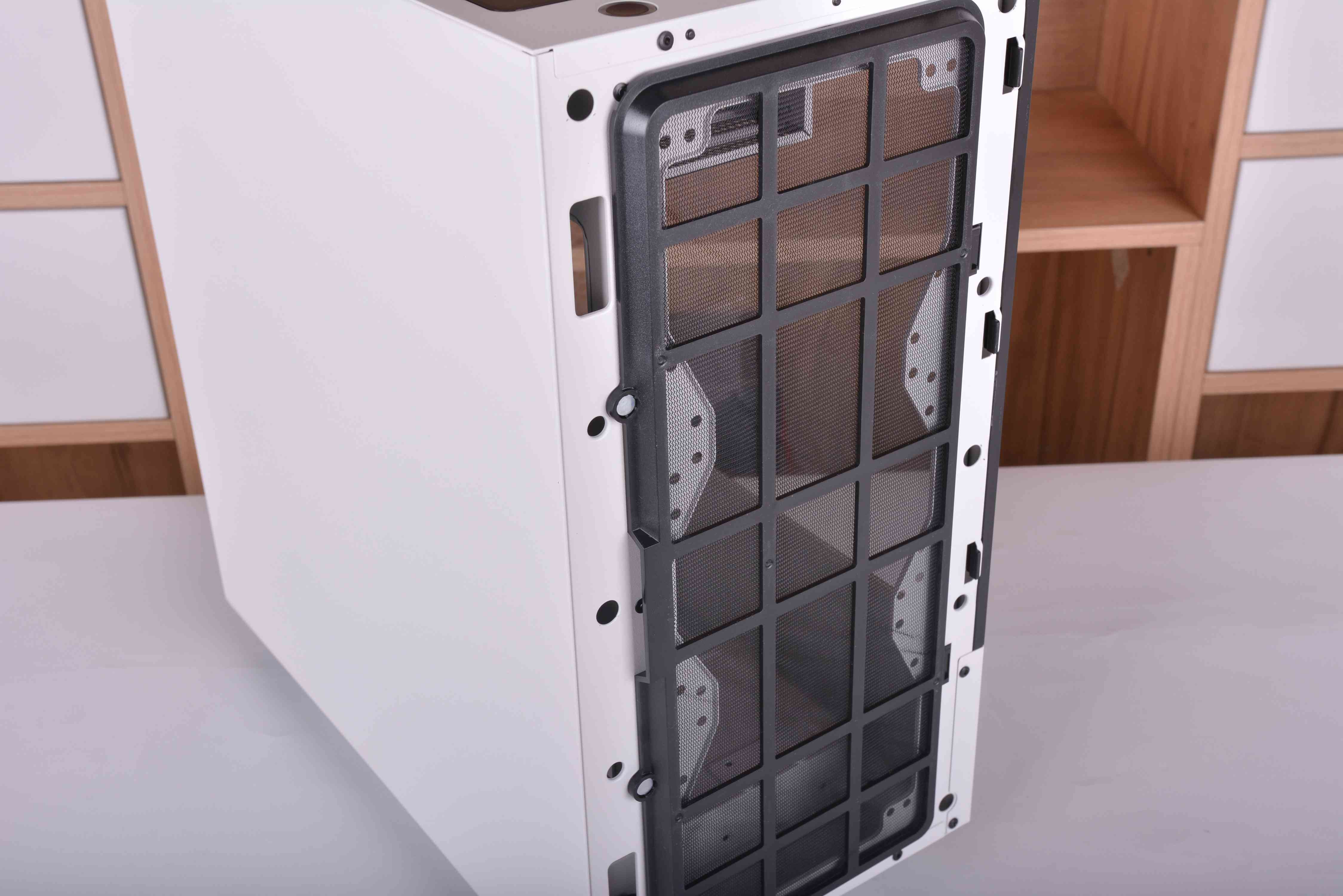 由于机箱顶部变成了主机的I/O口面板,破晓X的顶部相较于普通机箱的PVC磁吸防尘网改成了现在的尼龙防尘网,根据以往使用经验来看,尼龙的防尘效果应该要更好。