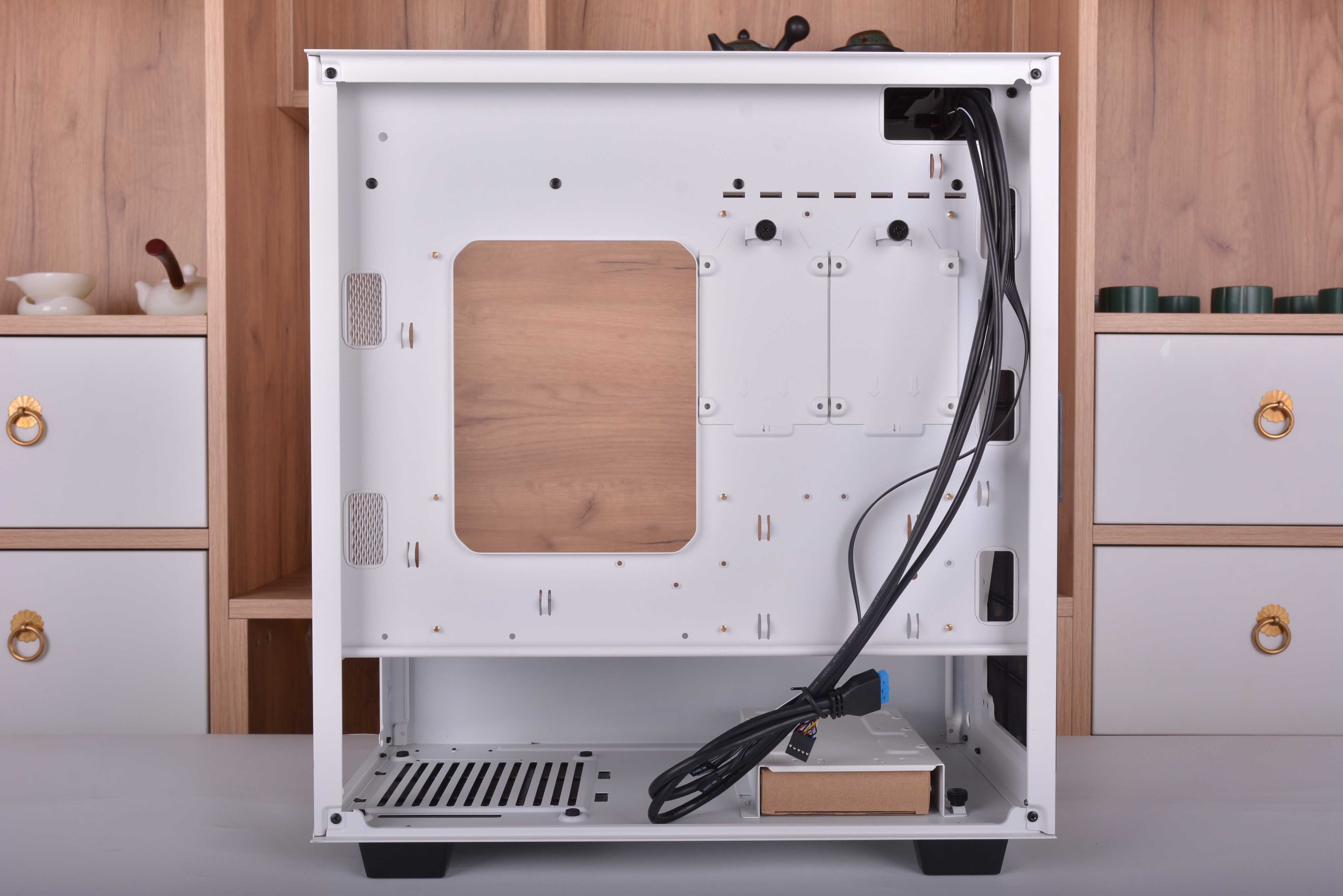 机箱背部走线方面,虽然说破晓X有20mm的走线空间,但是看到底部的电源仓跟硬盘仓被打通了,没有隔板在中间,就顿时不想走线了,把硬盘架拔了,全部一骨碌塞到硬盘仓部分就完事了。