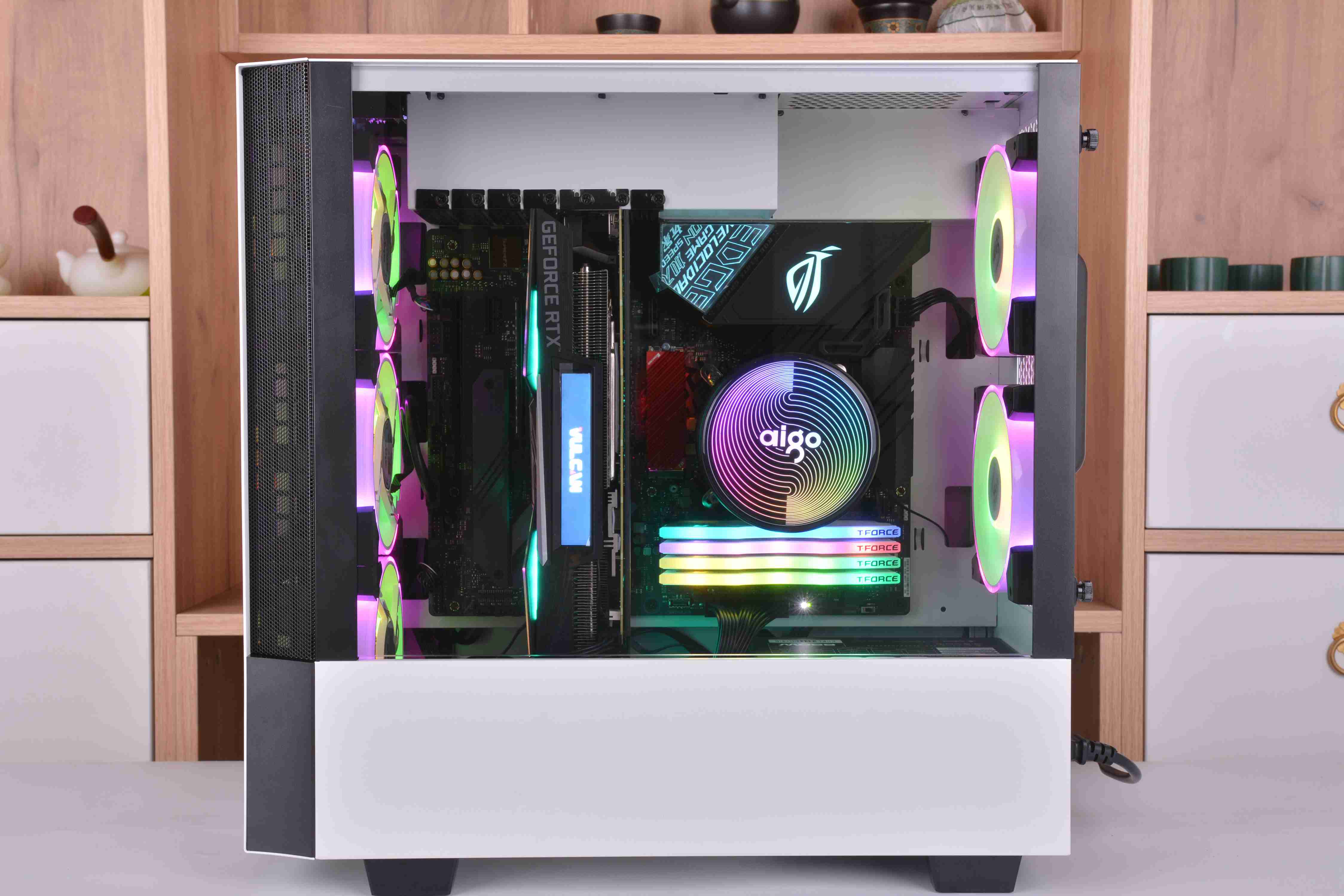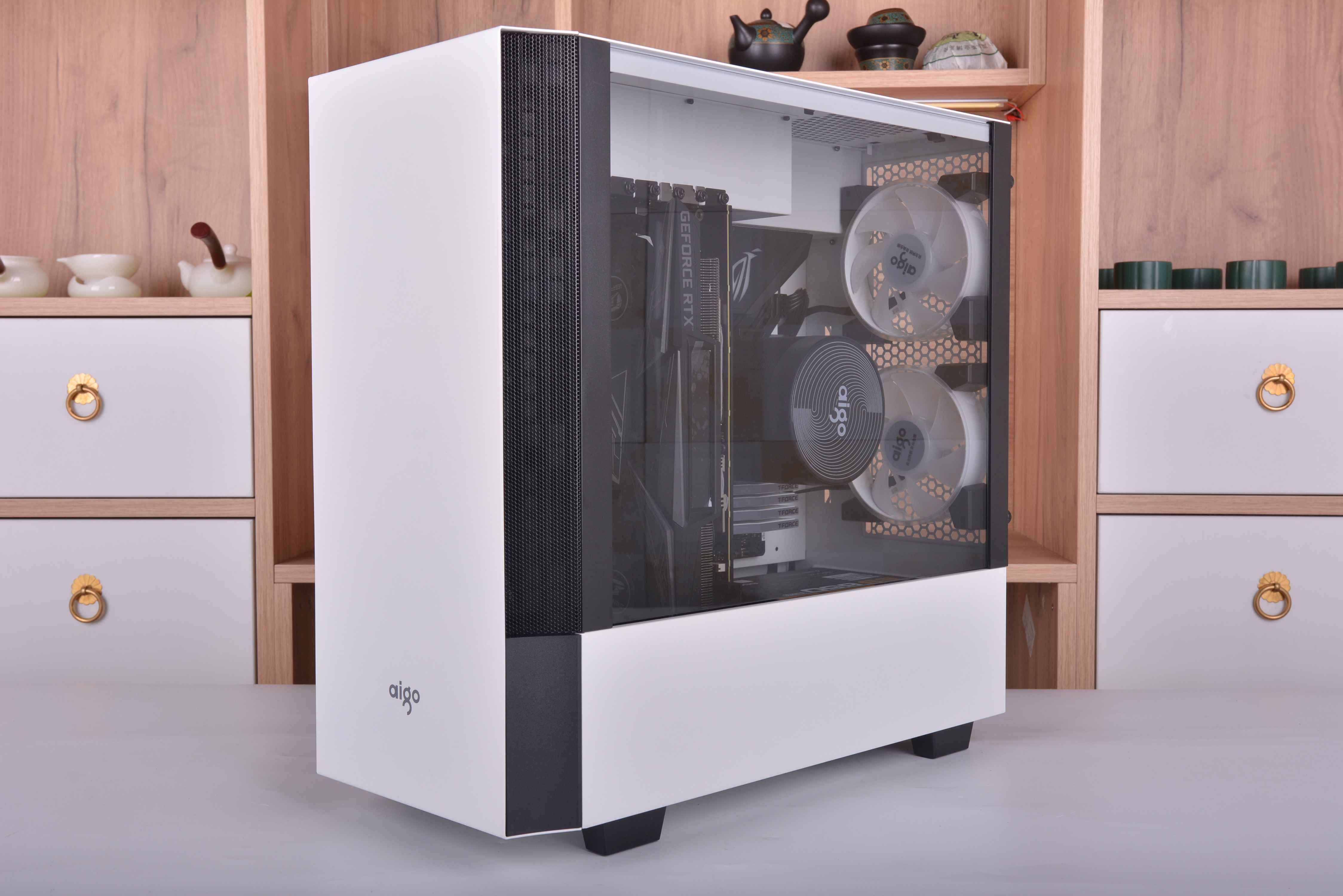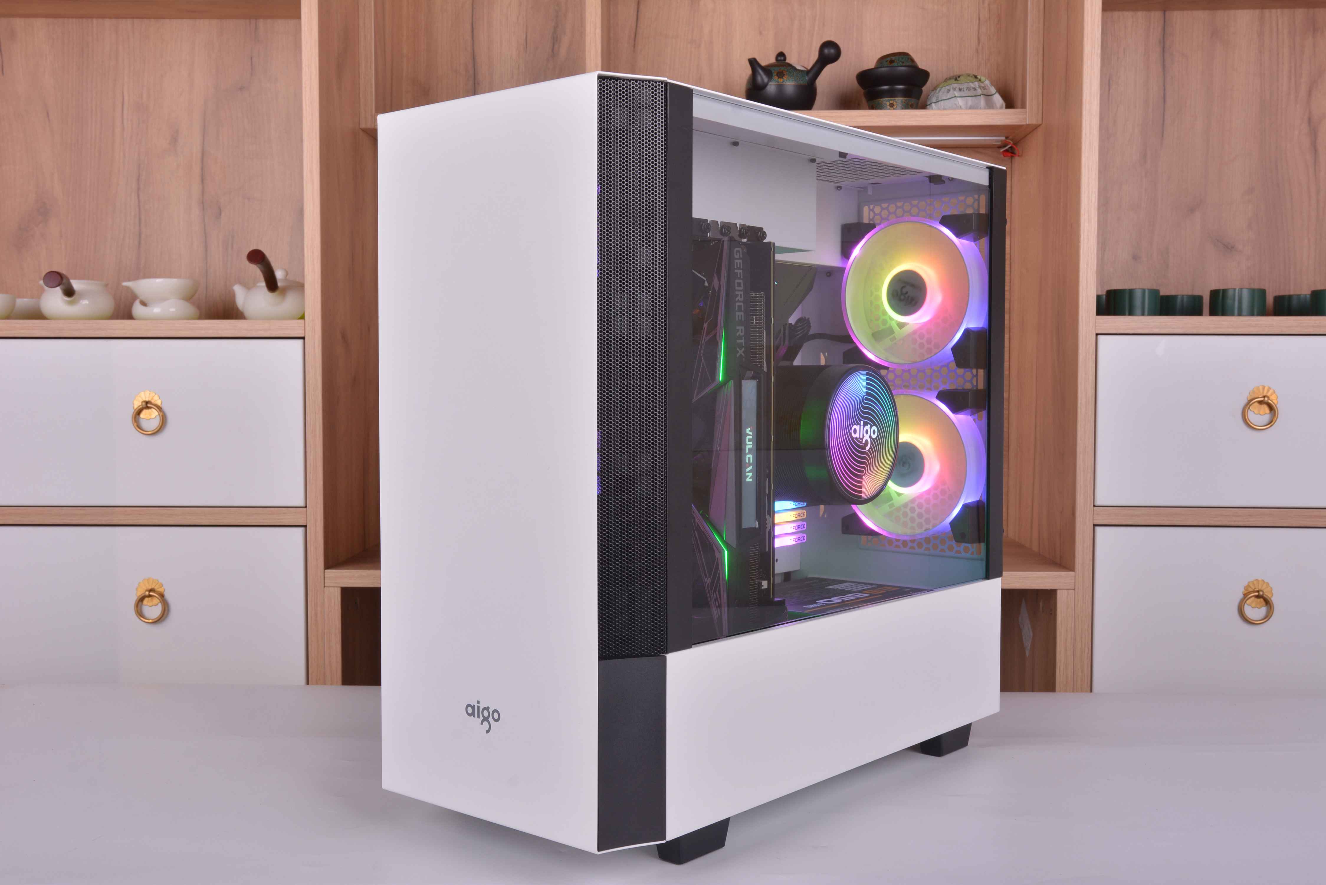 整机安装完毕,全机配件颜色基本都是黑白配,所以看起来非常的舒服,不过我个人觉得箱子的脚高度有点偏高了,看起来稍微怪了点,高度降低点可能就会好很多。下面就直接来看点亮效果吧。