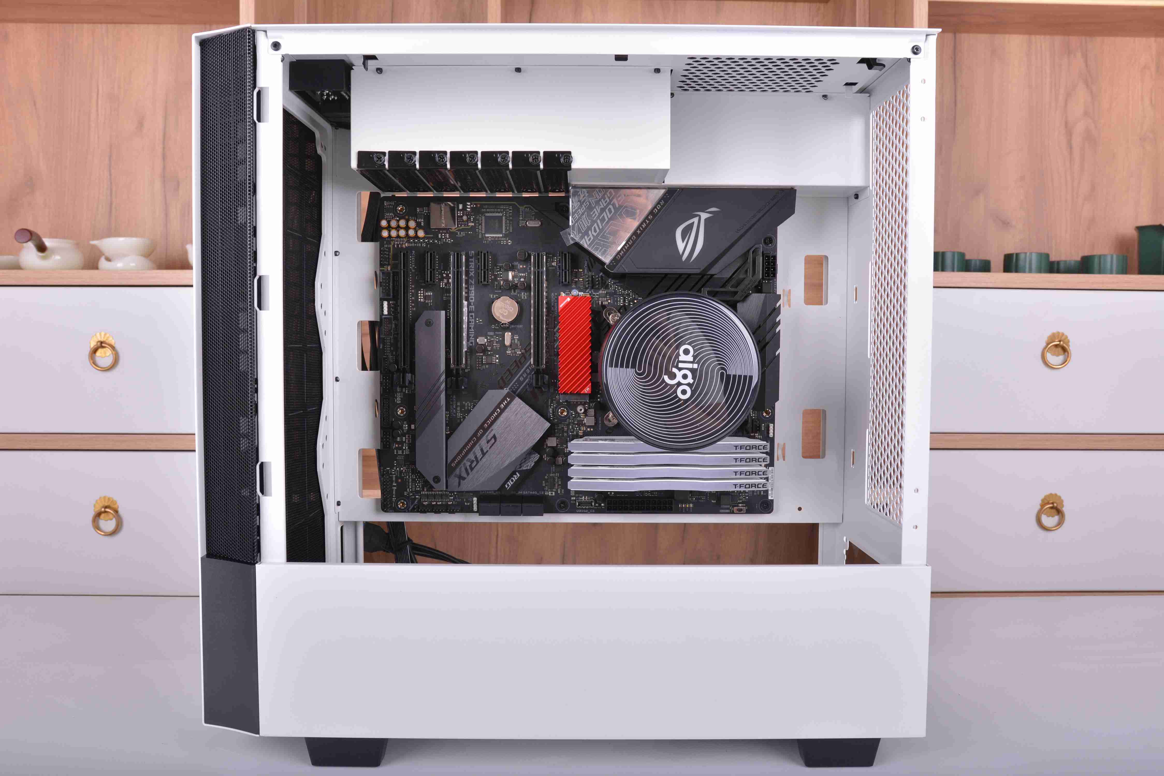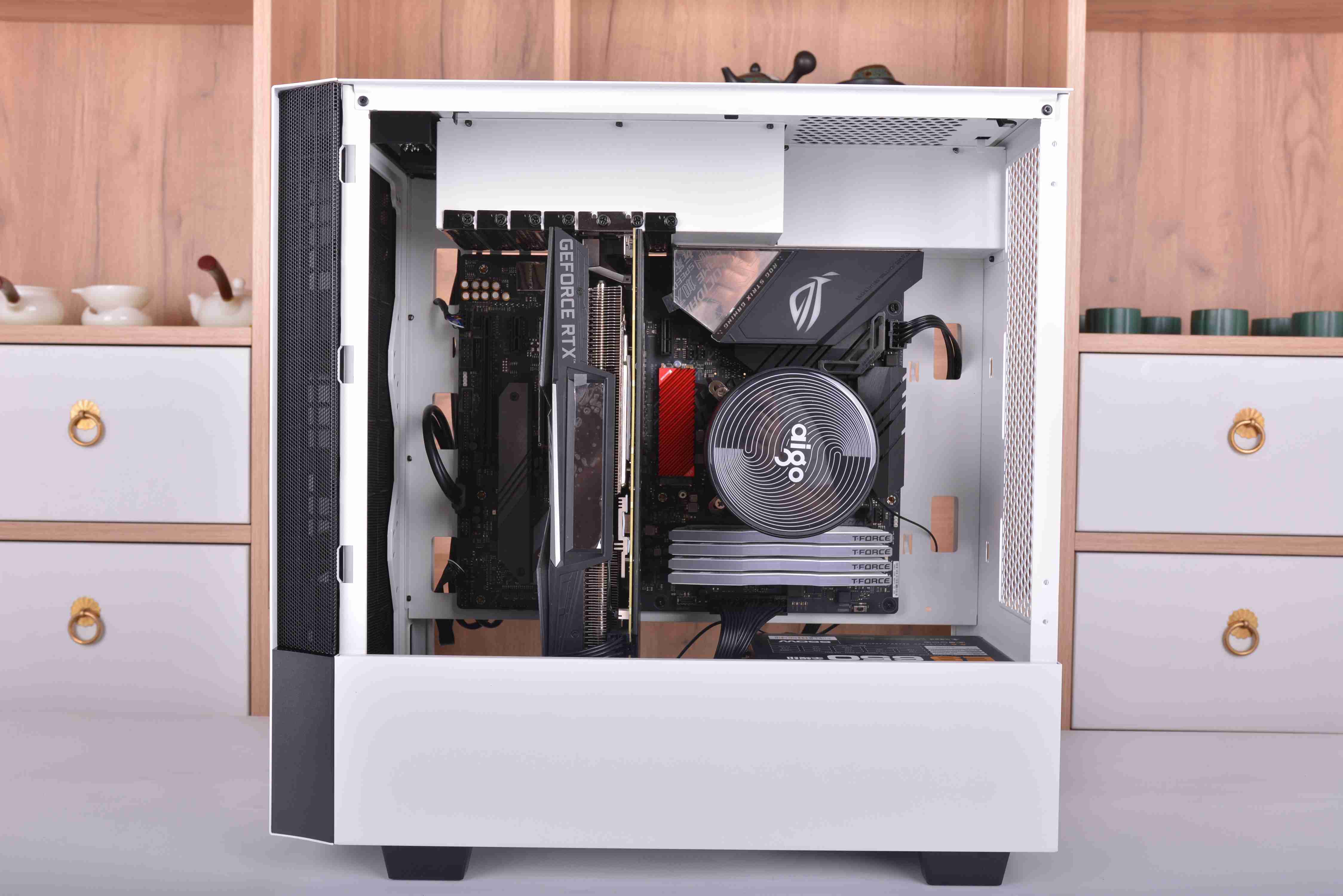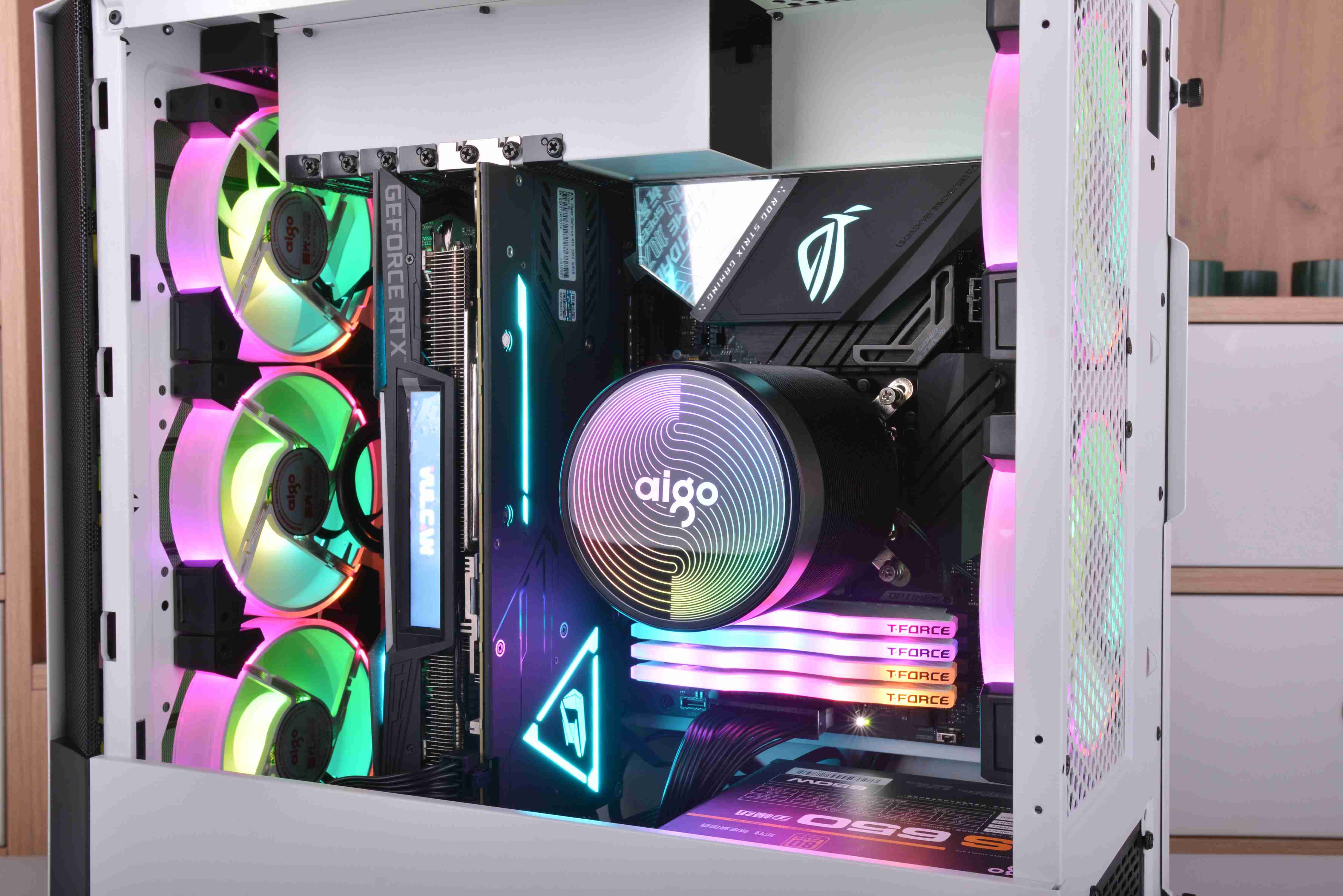 整机安装完毕,全机配件颜色基本都是黑白配,所以看起来非常的舒服,不过我个人觉得箱子的脚高度有点偏高了,看起来稍微怪了点,高度降低点可能就会好很多。下面就直接来看点亮效果吧。