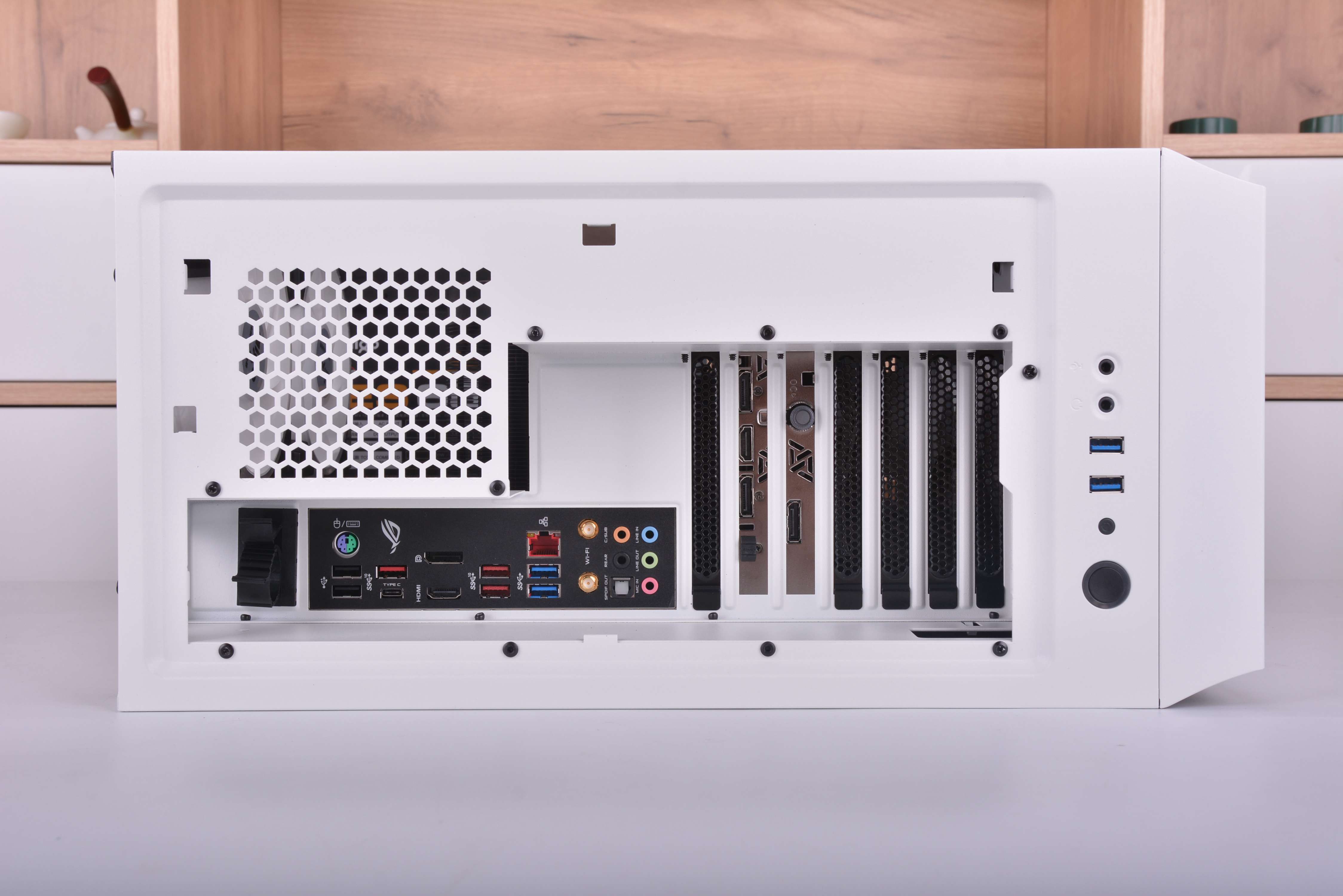 显卡也跟着主板来了个90°旋转,这时候显卡的力全部变成了垂直方向了,受力点变成了更加坚固的PCI挡板,显卡变弯什么的全部都不存在了,显卡支架也再也不需要了。