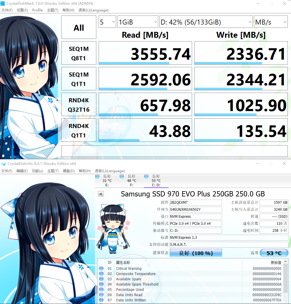 在加上M2-3散热马甲时候跑分时最高温度仅达到55°C,截图时候的温度为53°C,可以看得出M2有没有马甲的温度表现完全不是一个差距,所以各位还是花个小钱加个M2散热马甲为妙,毕竟长期工作于高温对于电子器件来说肯定是不太好的。