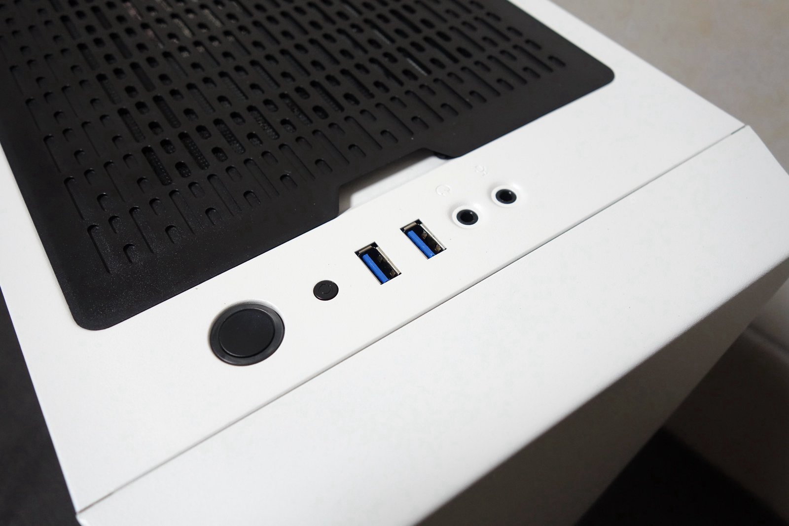 顶置的IO面板设计,上面提供有两个USB 3.0接口和两个3.5mm音频接口,圆形的电源灯周围带有导光条,通电之后会白色的灯光。