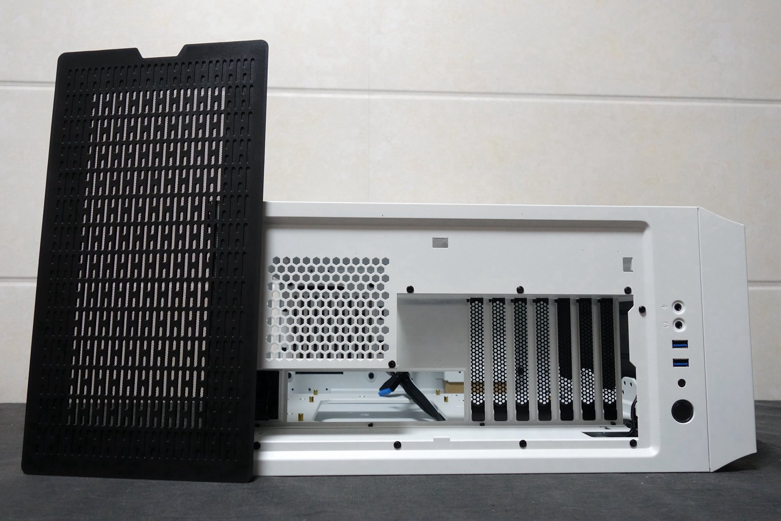 同样是因为主板90度旋转的设计,主板的IO面放置在了机箱的顶部,它配有可拆卸的防尘盖板和单独的走线槽,实际使用的时候要比普通机箱更加干净整洁。