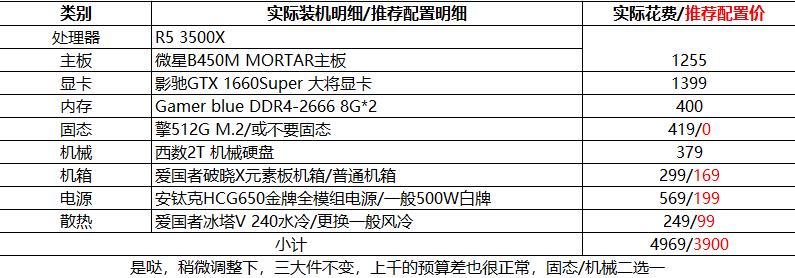 实际配置清单如下:AMD 锐龙R5 3500X ,微星B450M MORTAR主板,影驰GTX 1660Super 大将显卡,Gamer Blue DDR4-2666内存,擎512G M.2 固态加西数2T 机械硬盘,爱国者破晓X元素板机箱,安钛克HCG650金牌全模组电源,爱国者冰塔V 240水冷...顺便再加上白嫖来的三个爱国者暮光RGB风扇。