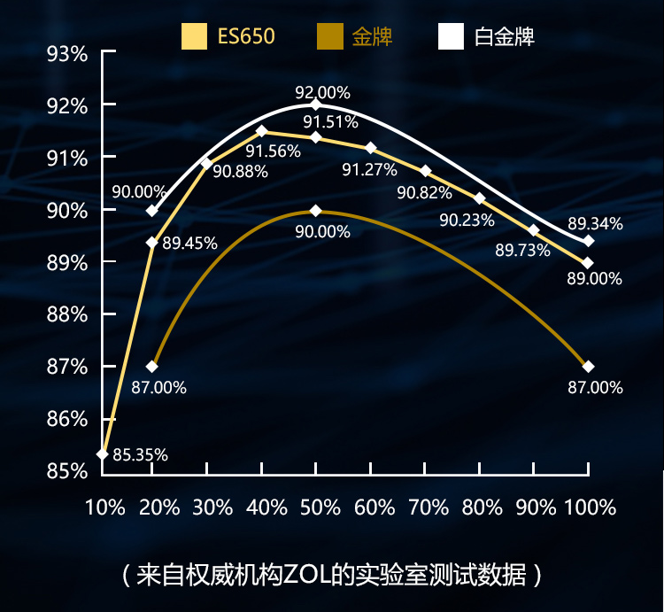 作为举例的爱国者ES650就是金牌认证,转换效率可达90%以上,并且远高于一般金牌标准,非常接近白金排标准。