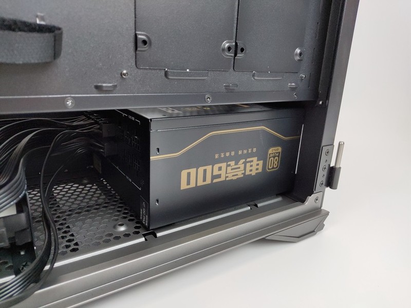 开始上机,电竞600这个标准尺寸的电源安装还是无压力的,装完后和硬盘架和电源处还有很富裕的空间。