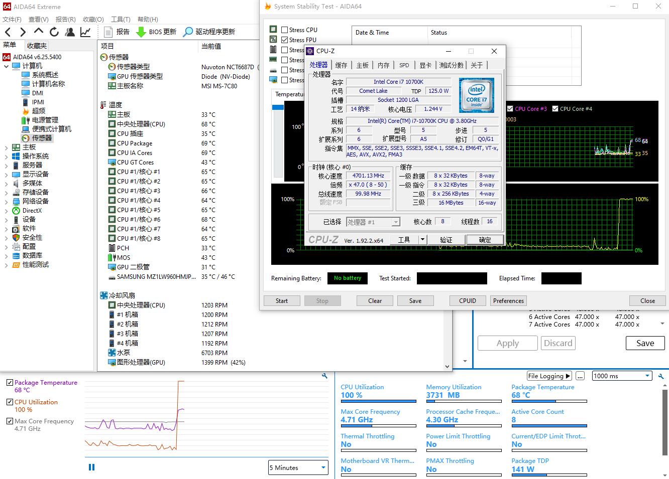 ▼接着跑一下CPU-Z的压力测试,处理器的功耗在141W左右,处理器温度68℃,核心温度在65℃上下波动。