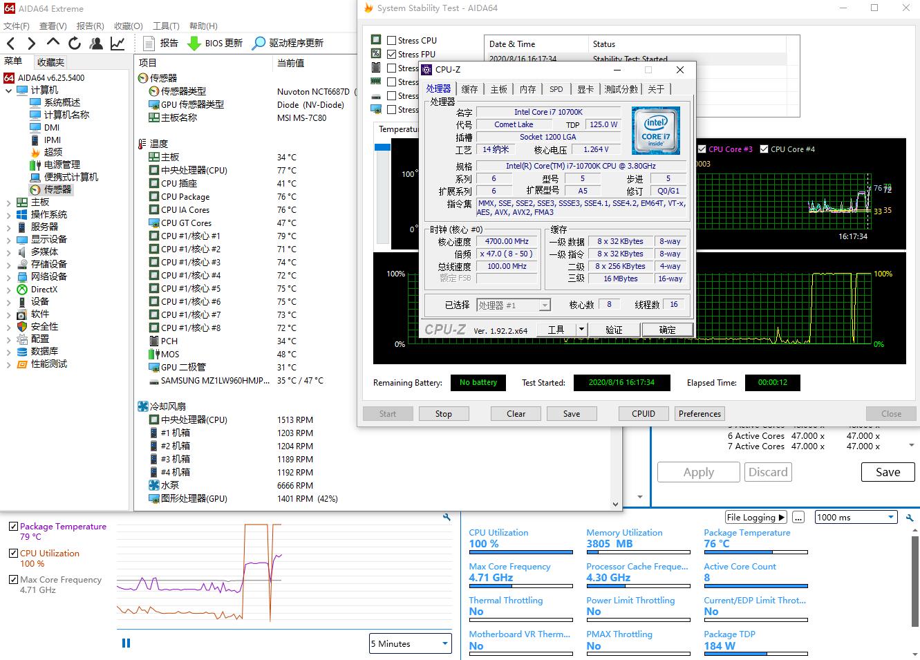 ▼接着单烤FPU,cpu的功耗在184W,处理器温度在77℃,核心温度在71℃左右波动。