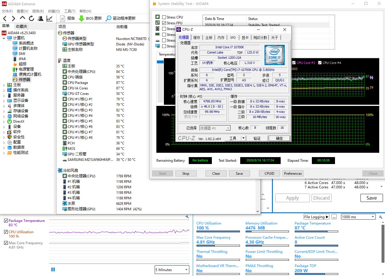 ▼继续刚刚的测试,将10700K超频至全核4.8G,单烤FPU,处理器功耗209W。
