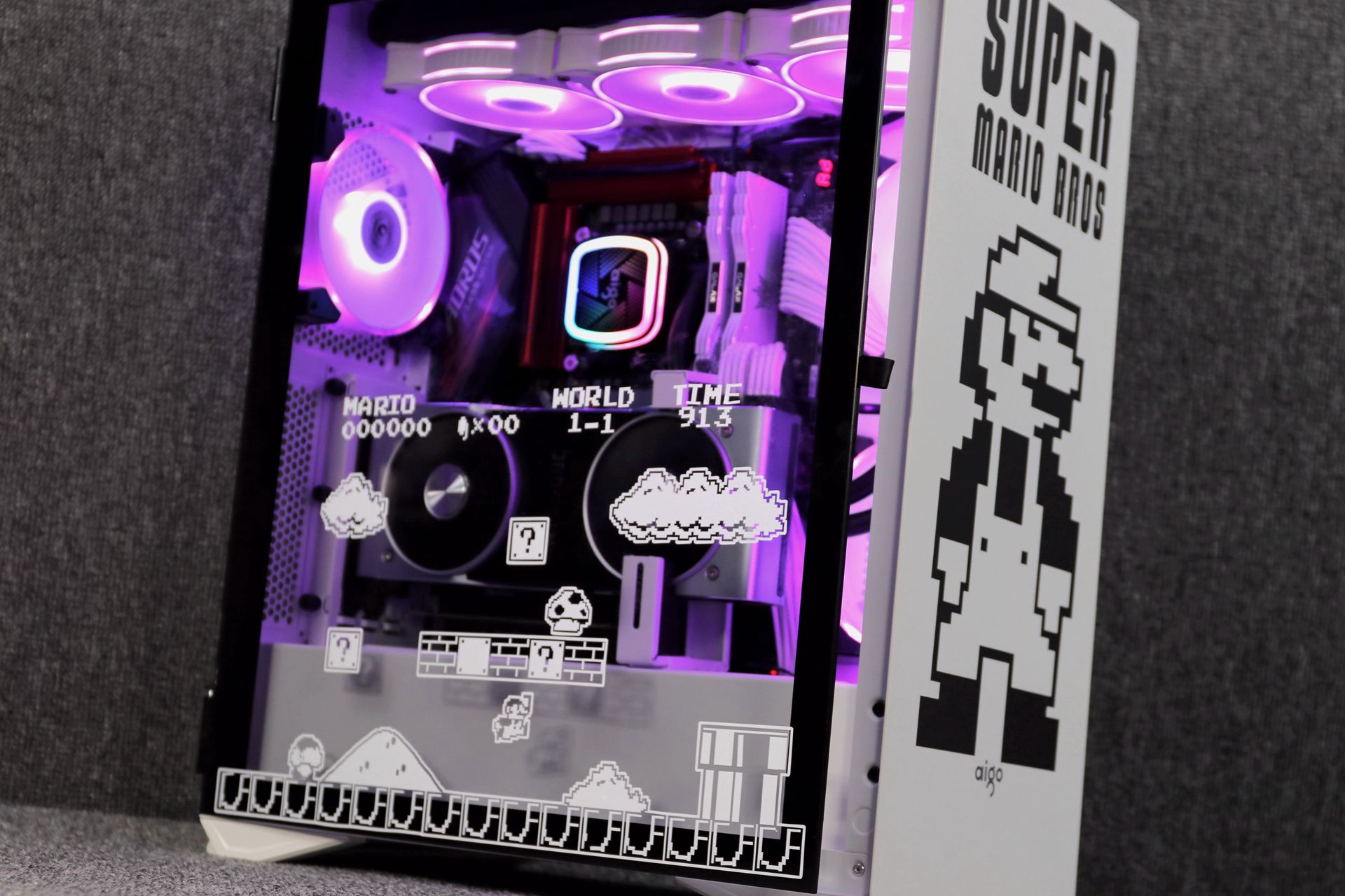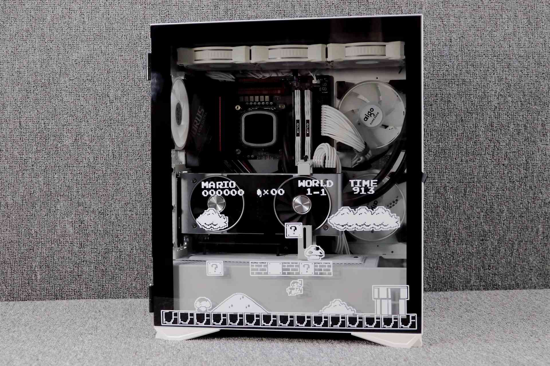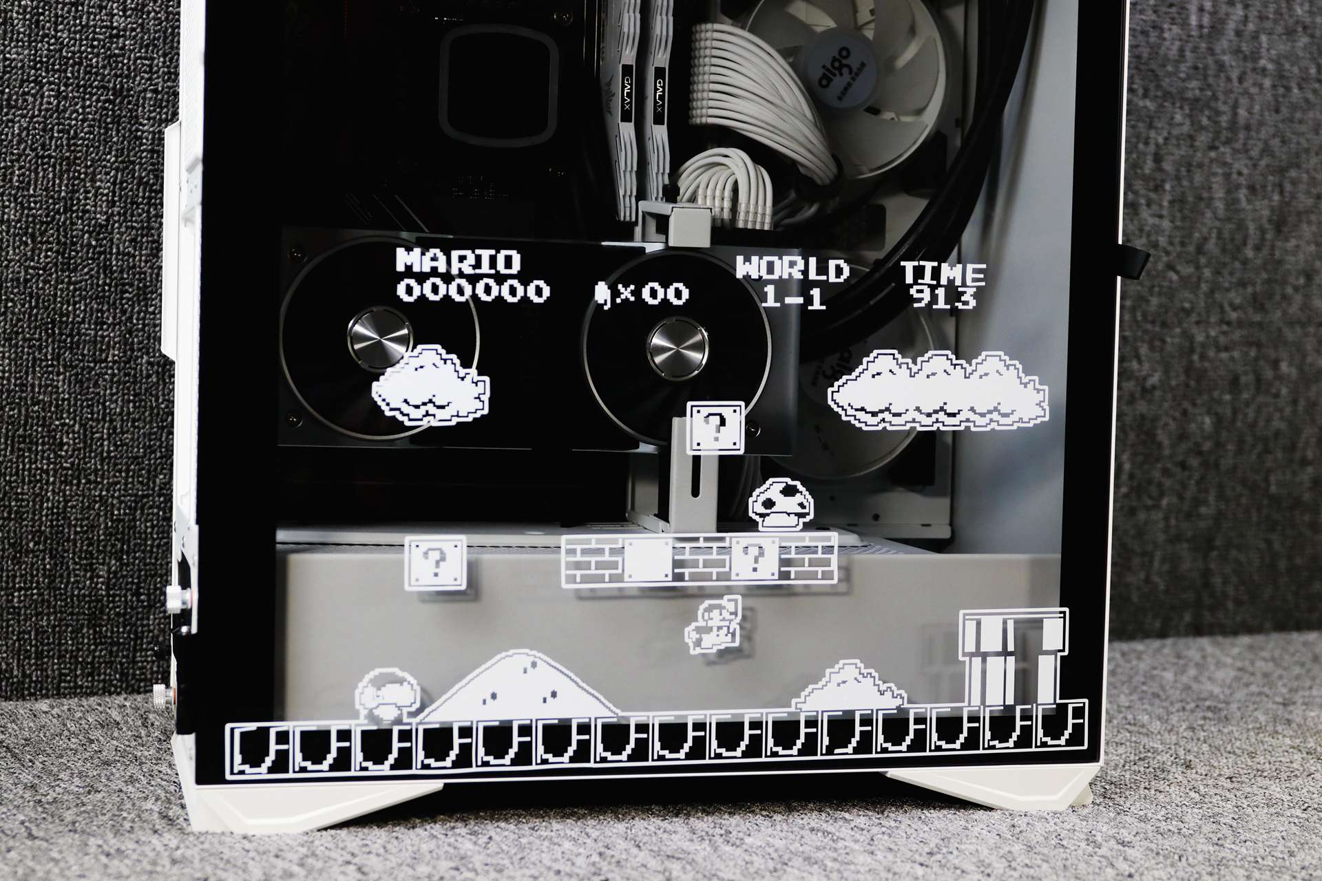玩过红白机超级玛丽的朋友都知道,侧板上的这个是游戏中第一关的场景,同时也是许多人童年回忆中的经典场景。所以在这次主题DIY中,钢化玻璃侧板上的场景图案算得上是一大亮点。
