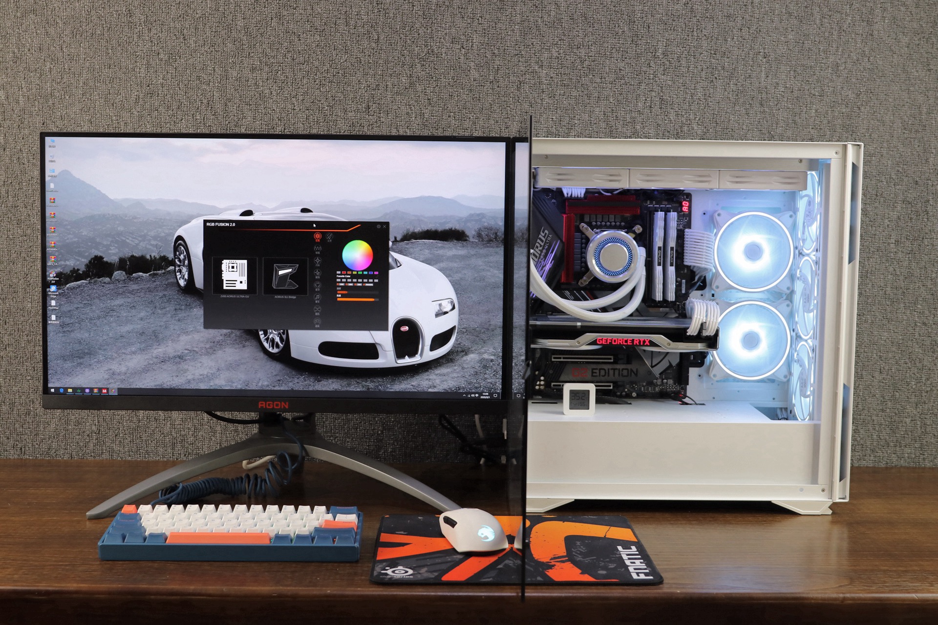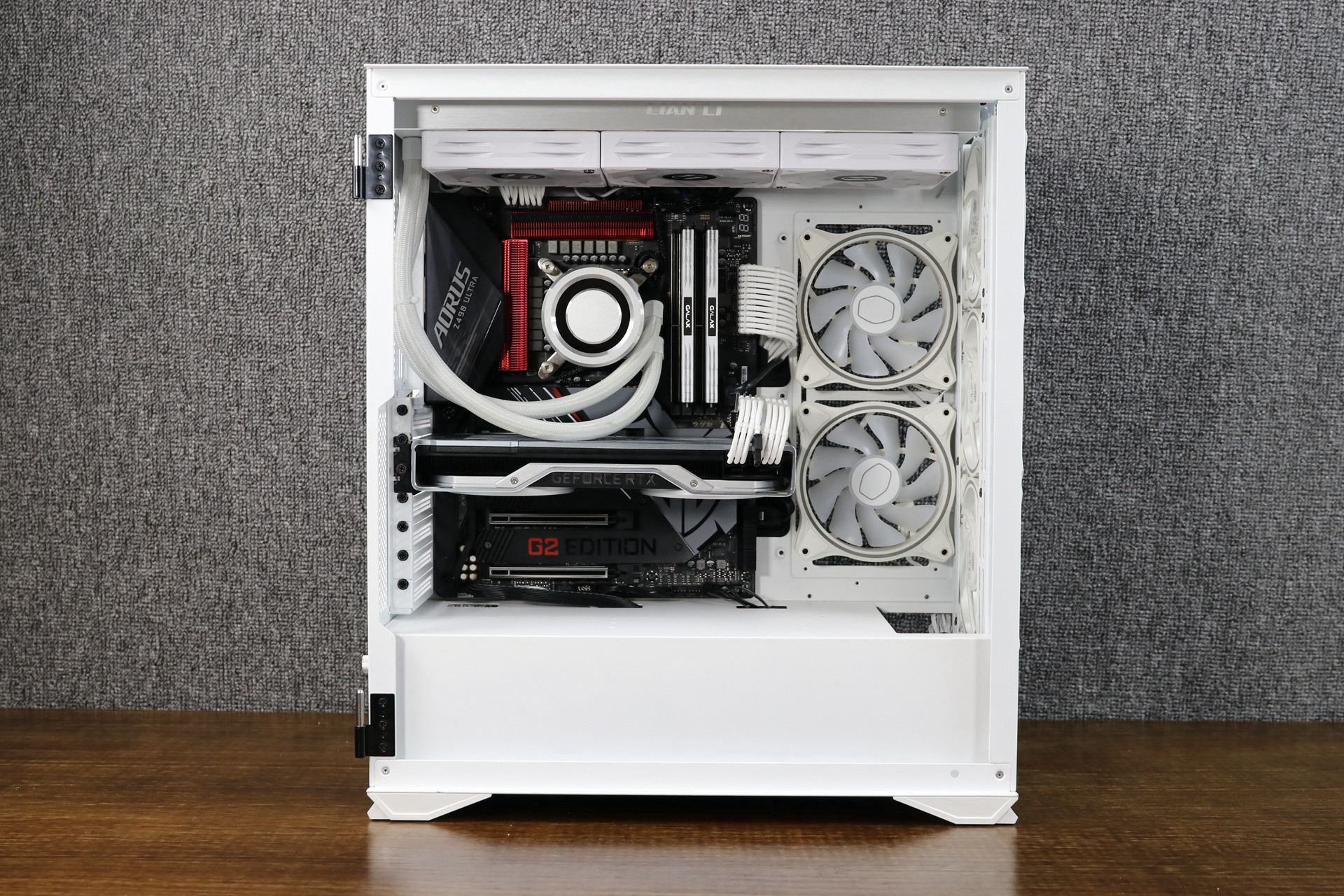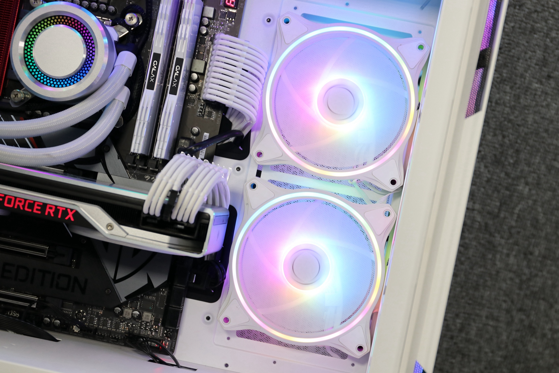 亮机后的效果也是杠杠的,颜值也很在线。特别是柔和的ARGB氛围灯效搭配上白色的箱体更显出一份档次十足的主机氛围效果。