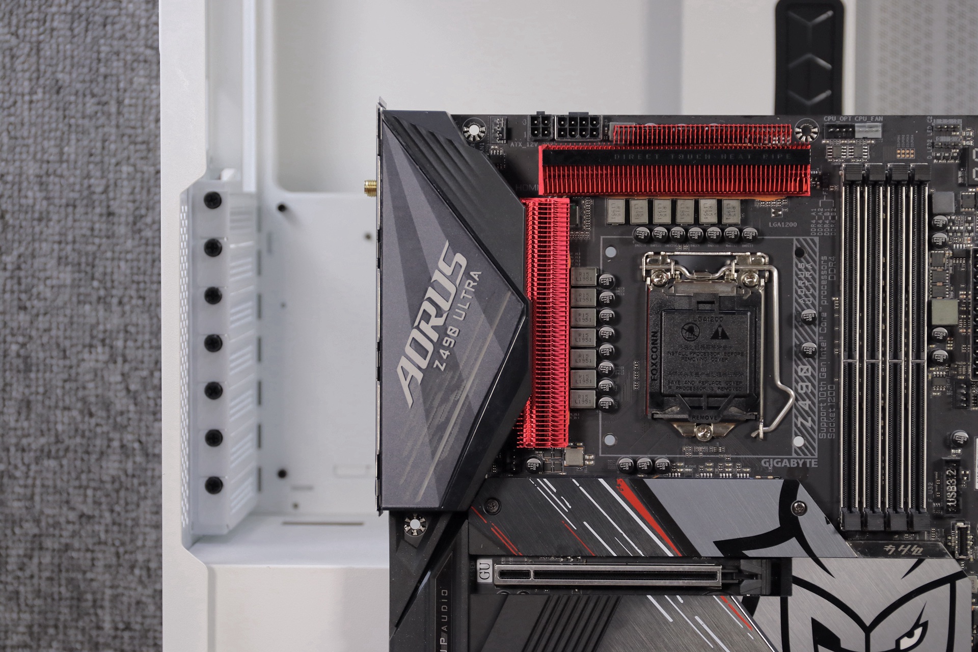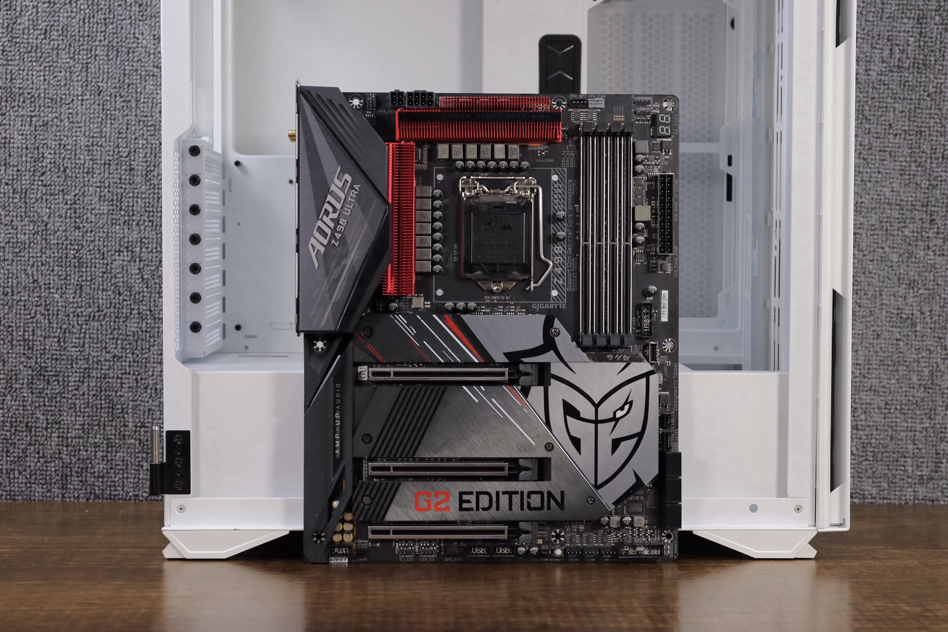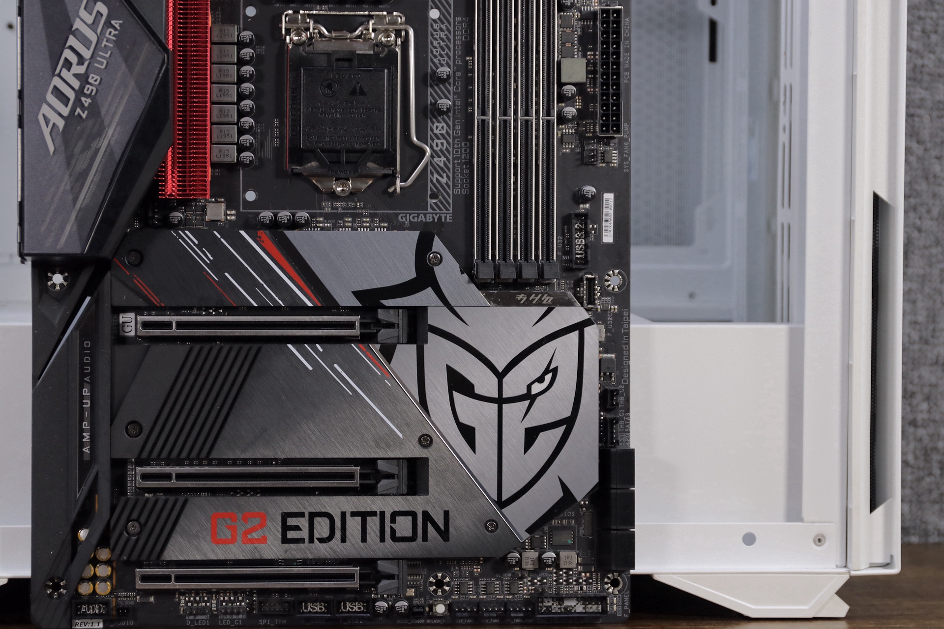 主板搭配方面,采用极具电竞风格的技嘉Z490 AORUS ULTRA G2 定制版。红与黑配色格调还是高的,整个主板是以著名电竞战队G2 Esports元素来设计的。