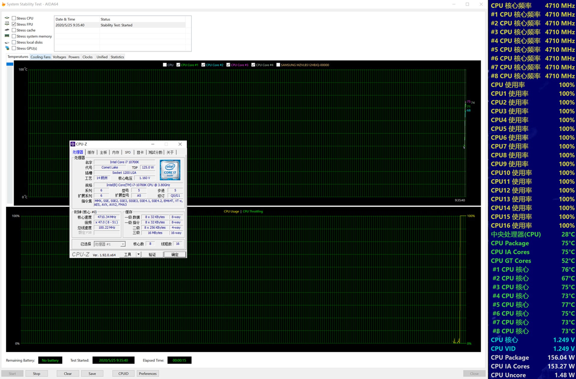 默频全核心4.7GHz AIDA64 FPU烤机温度维持在75度。
