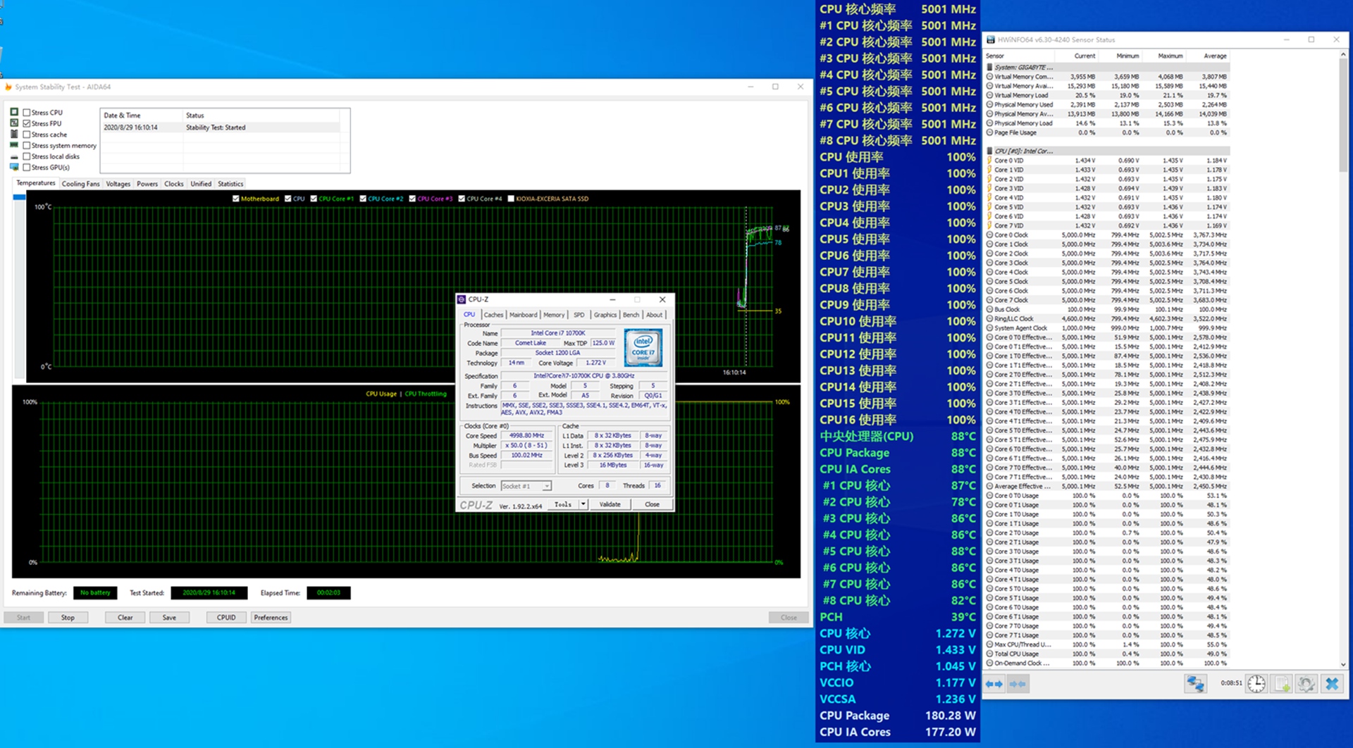 超频全核5.0GHz AIDA64 FPU烤机温度维持在88度。