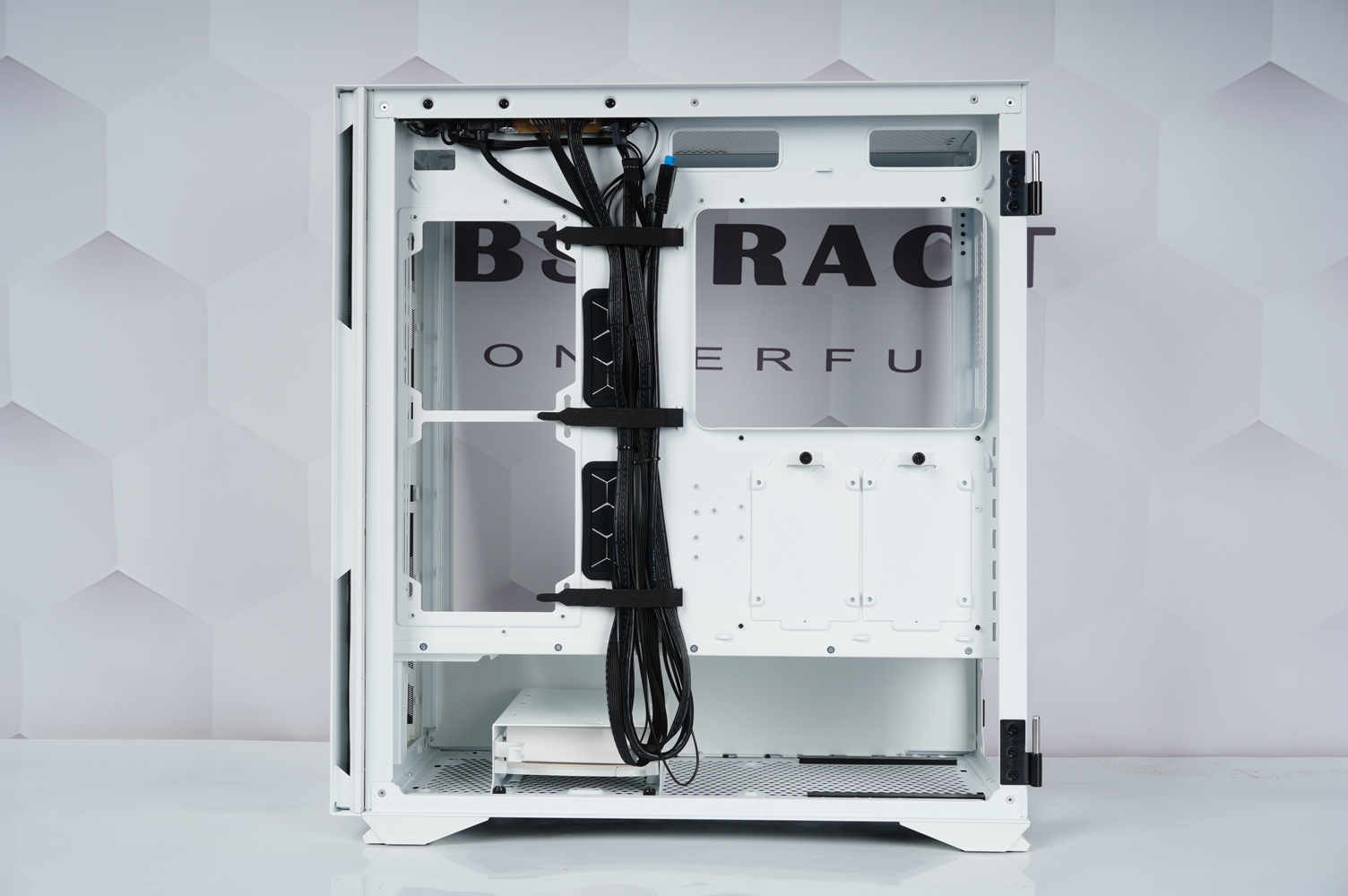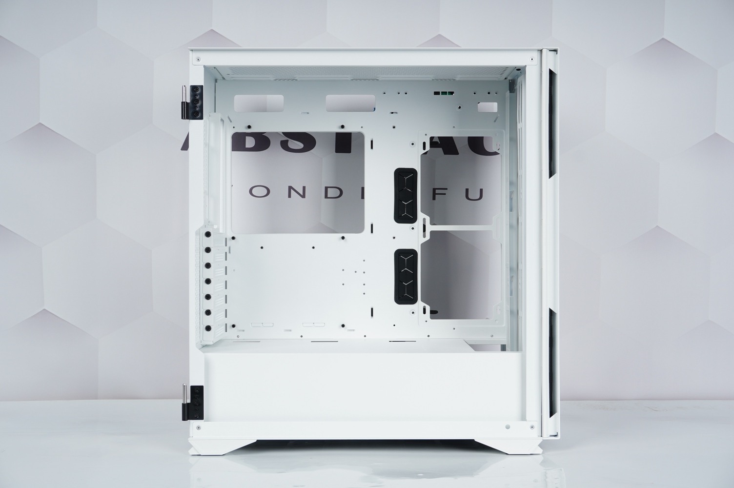 YOGO K1在内部方面也有一些新设计,大家可以看到机箱内部的主板安装板前部多了两个竖排的12厘米风扇位,这里可以额外支持一个240冷排的安装,这样也就可以尽情展示冷排的灯效了。内部这次最大支持到E-ATX板型,显卡几乎不存在限制长度的问题。