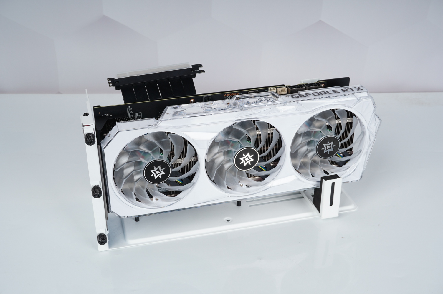 YOGO K1显卡竖装支架的全貌,PCIE延长线已经出厂预配并安装好,另外还有后面一个显卡支撑支架。支架上部可以调高高度以及宽度来适应不同高度以及厚度的显卡。底部同样也可以根据显卡的厚度来调整承托宽度,保证能把显卡完全承托住。