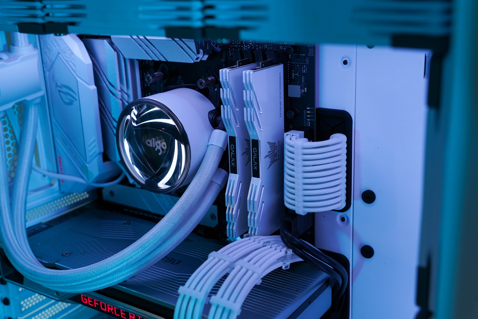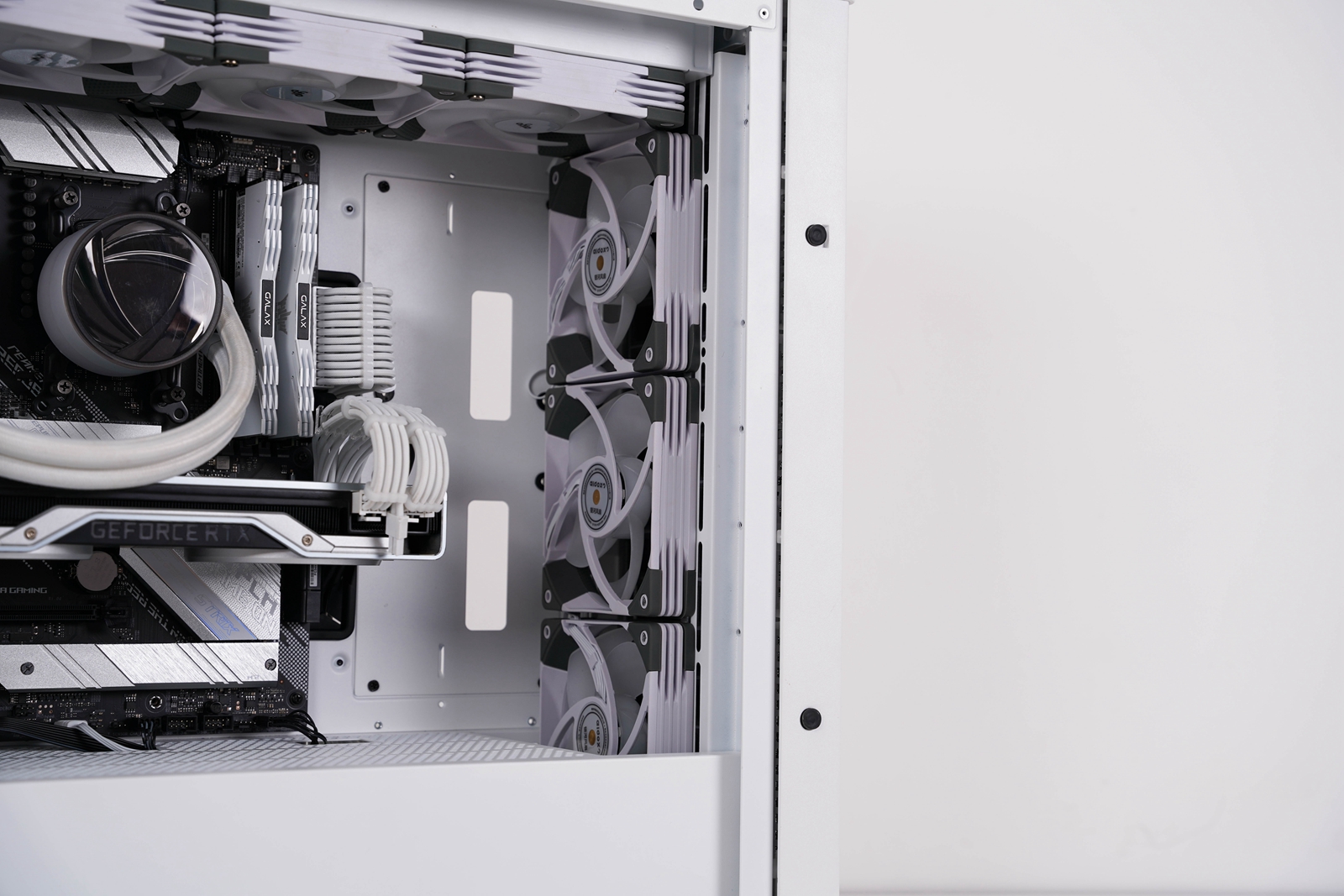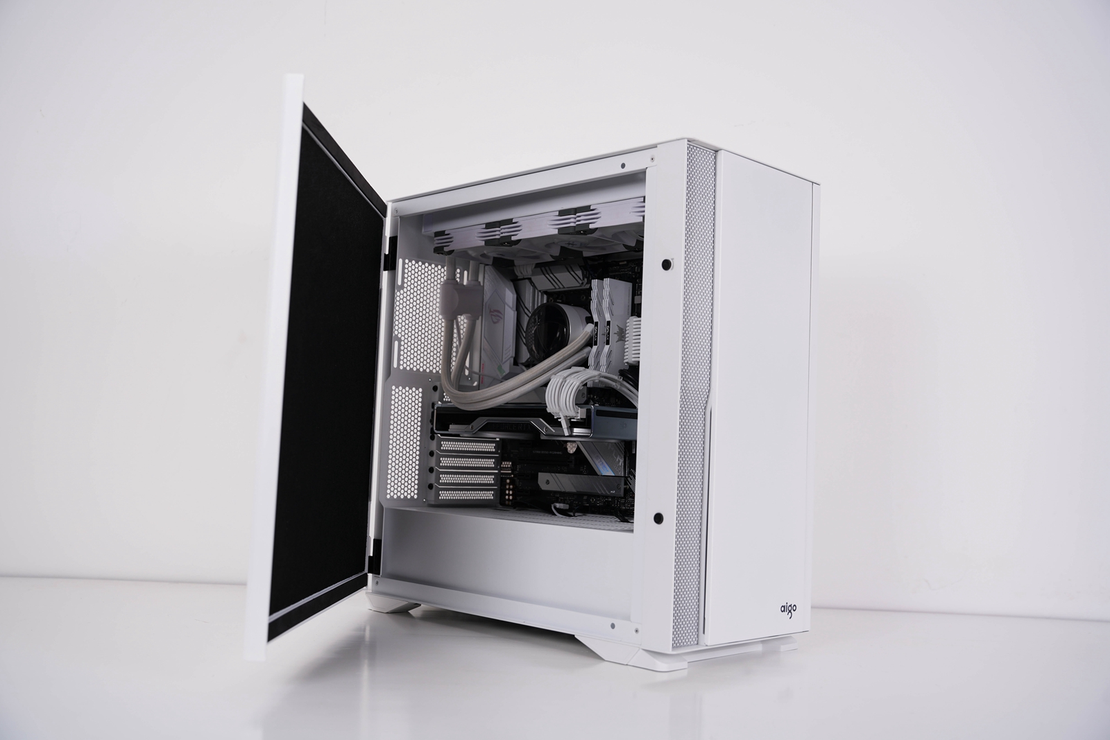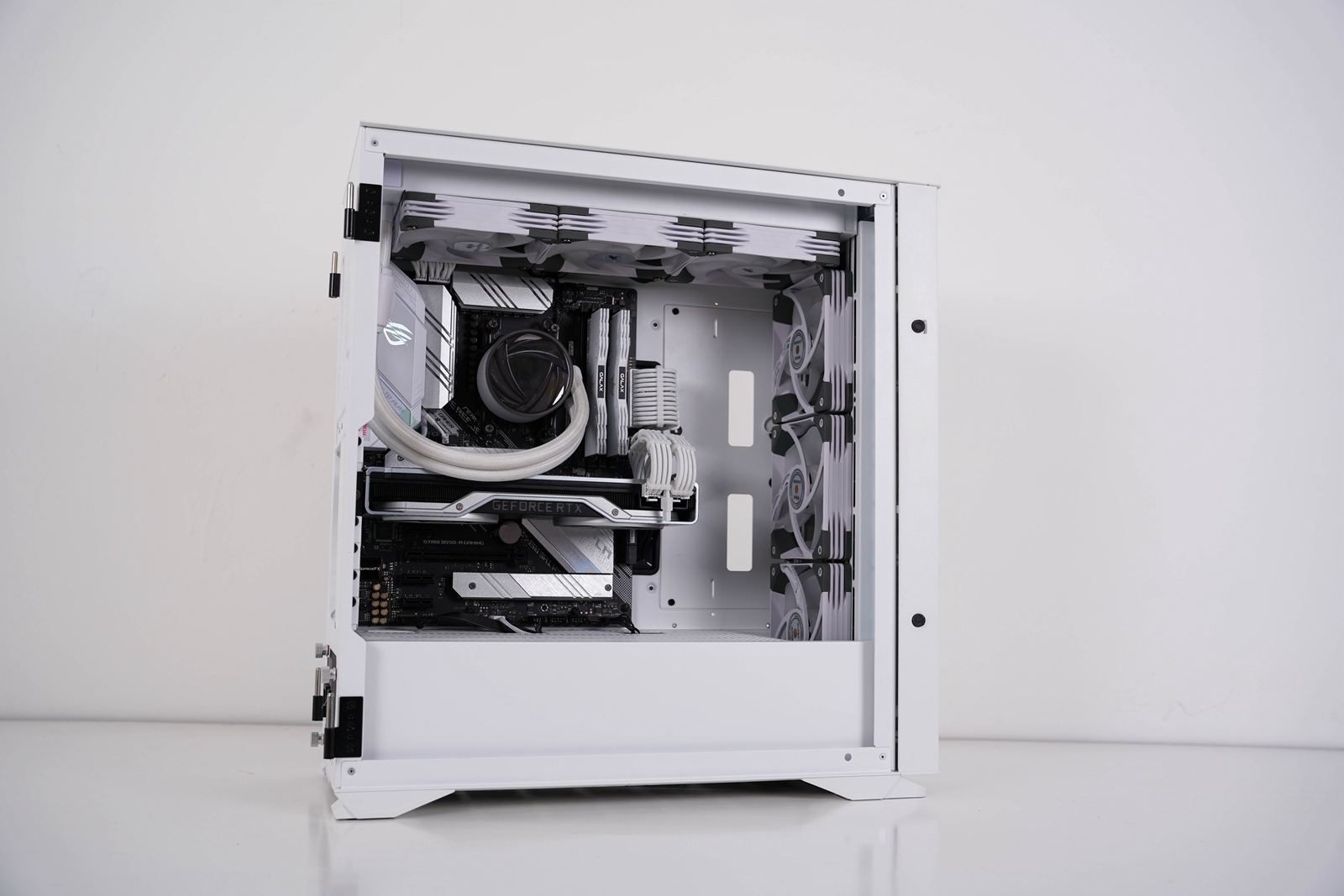 搭配机箱的配色,所以主板和内存都采用白色元素的,主板是华硕B550-A吹雪,内存是影驰名人堂HOF Extreme DDR4 3600 8*2 16G。在散热器方面,毕竟考虑到静音机箱的架构和整体的美观协调,所以采用的AIO水冷来作为处理器散热,也不至于浪费这款机箱那么优秀的散热布局。