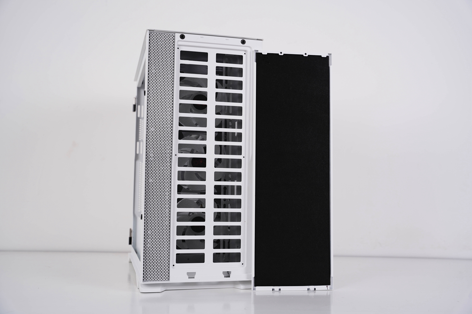 在静音设计方面,整个箱体前置、左右两侧和上置均预设有静音隔棉的面板,对于降噪和降低灰尘吸附,静音面板的作用还是很明显的。可以看到K100前置面板与其他静音机箱不同的地方,除了静音部分的设计之外,还在前置面板左侧进行可冲孔网面设计来加强前置进风,多功能面板也是体现了现在的机箱设计越来越贴合使用者的需求。