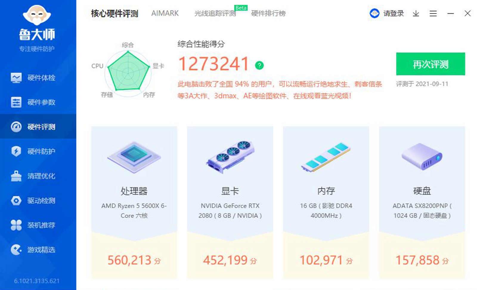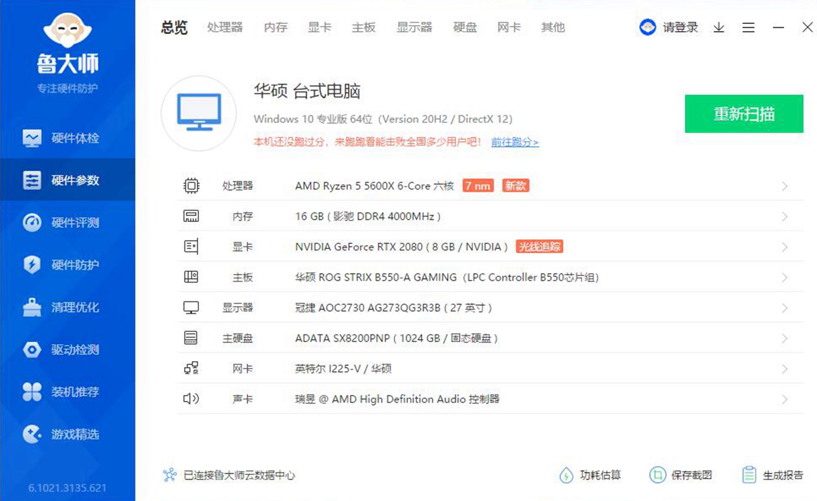 开机后再使用日常使用较多的鲁大师来看下整个主机的配置与性能评测的得分吧,毕竟主机还是以性能为优先考虑的。
