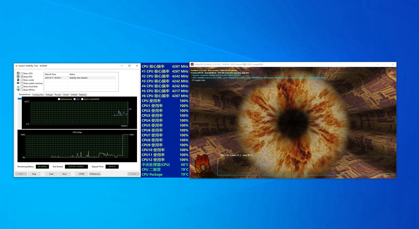 然后再用3D MARK和AIDA 64和FurMark这三款可以连续循环测试稳定性、散热性的软件来进行主机的满载符合测试。