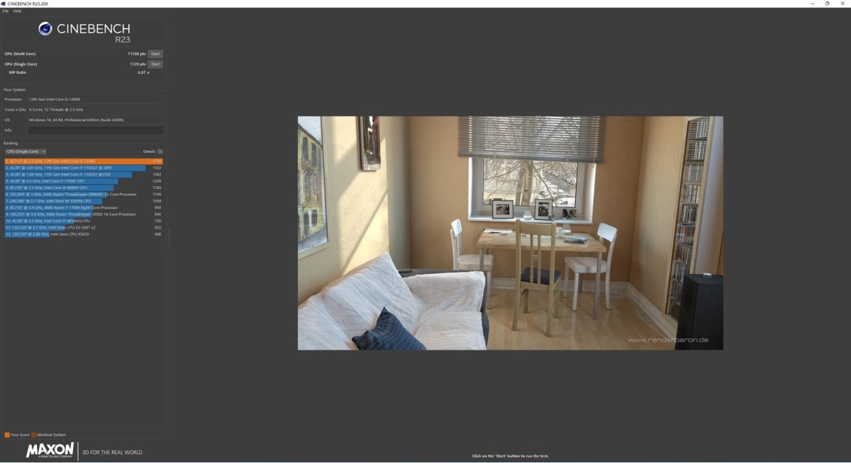 再来看下i5 12400处理器在R23测试的多核和单核的成绩:多核心为11708pts。单核:1720pts MP Ratio:6.81 x。