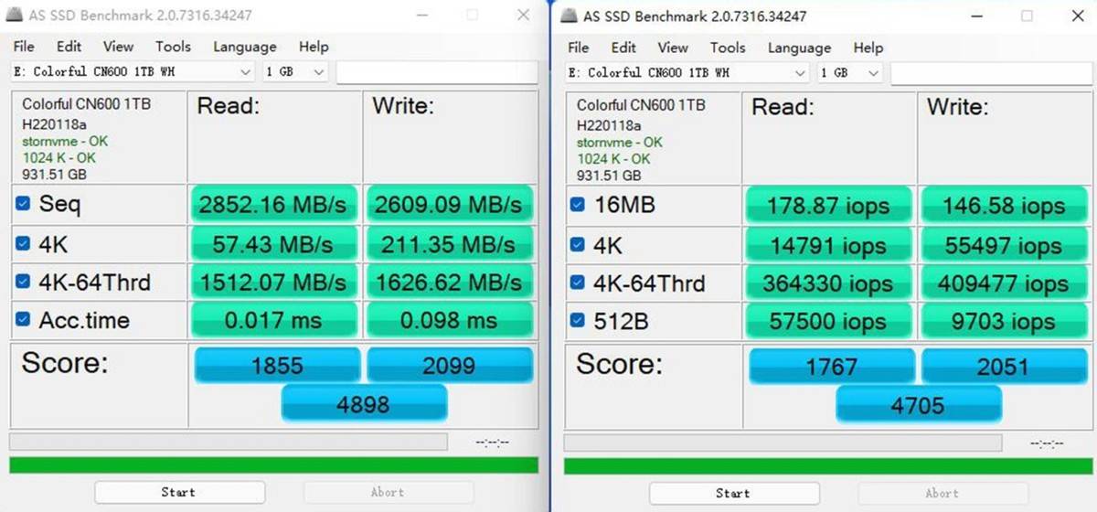 接着来看下七彩虹新推出的CN 600 系列的战戟1T固态的性能如何,采用了国产的长江FLASH+联芸主控方案 PCIe3.0固态的读写能力是否能满足日常使用需求。首先是AS SSD的读写和IOPS速度测试:读取2852.16MB/S,写入2609.09MB/S,读取:178.87iops,写入:146.58iops。