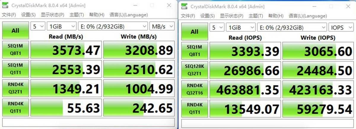 接着是CrystalDiskMark读写测试:读取3573.47MB/S、写入3208.89MB/S,读取3393.39iops、写入3065.60iops。