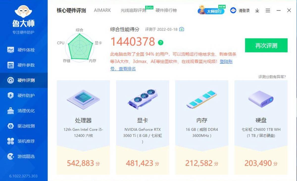 游戏主机肯定首要考虑到性能,那么先来看下鲁大师的跑分,1440378整体分数并不低,毕竟花了不少资金了。
