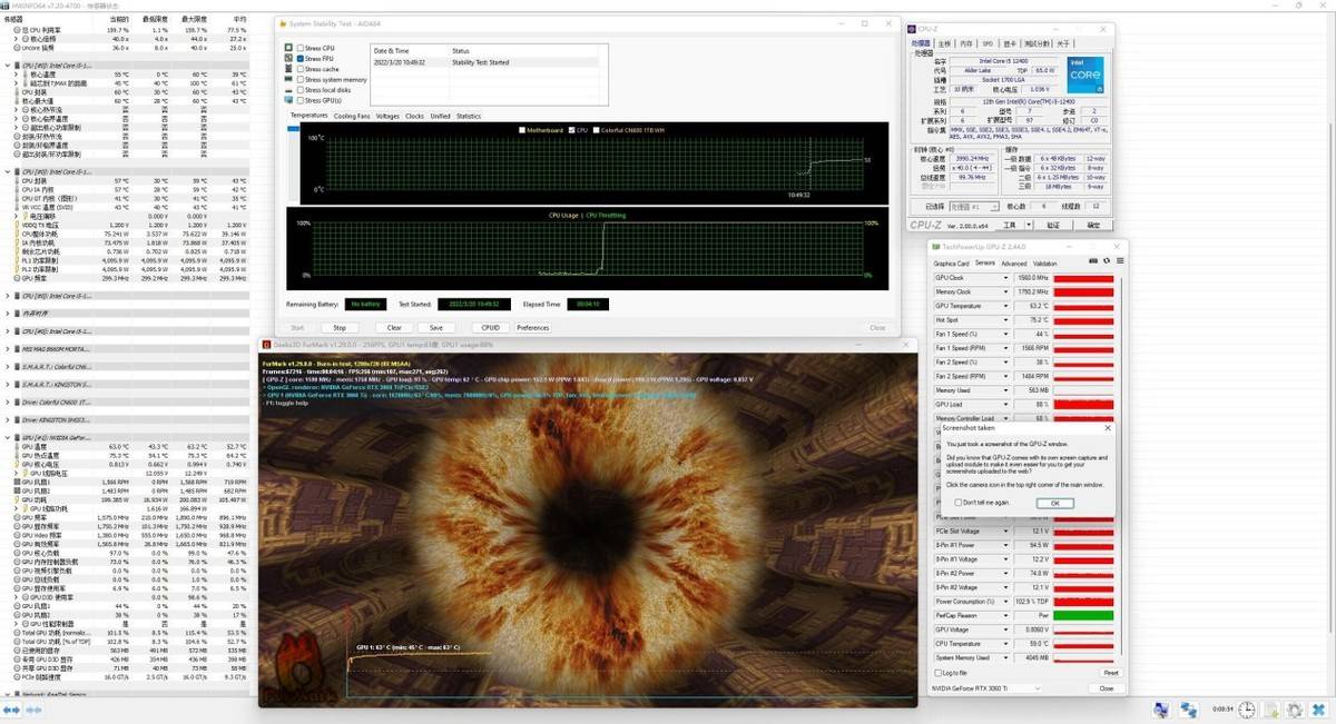 散热方面:CPU满载一直稳定在51℃,CPU核心温度也是维持在52℃。GPU满载63℃,整机功耗:i5 12400全核心4GHz TDP功耗为75W左右,而显卡满载GPU TDP 功耗维持在200W,加上其他配件的功耗这套12400+RTX3060ti主机的整机功耗基本维持在300多瓦左右,所以使用额定600~650W的电源是最理想的。要是想更省钱的话可以使用500~550W电源也是可以的。