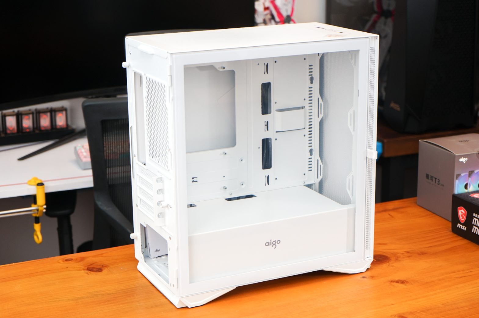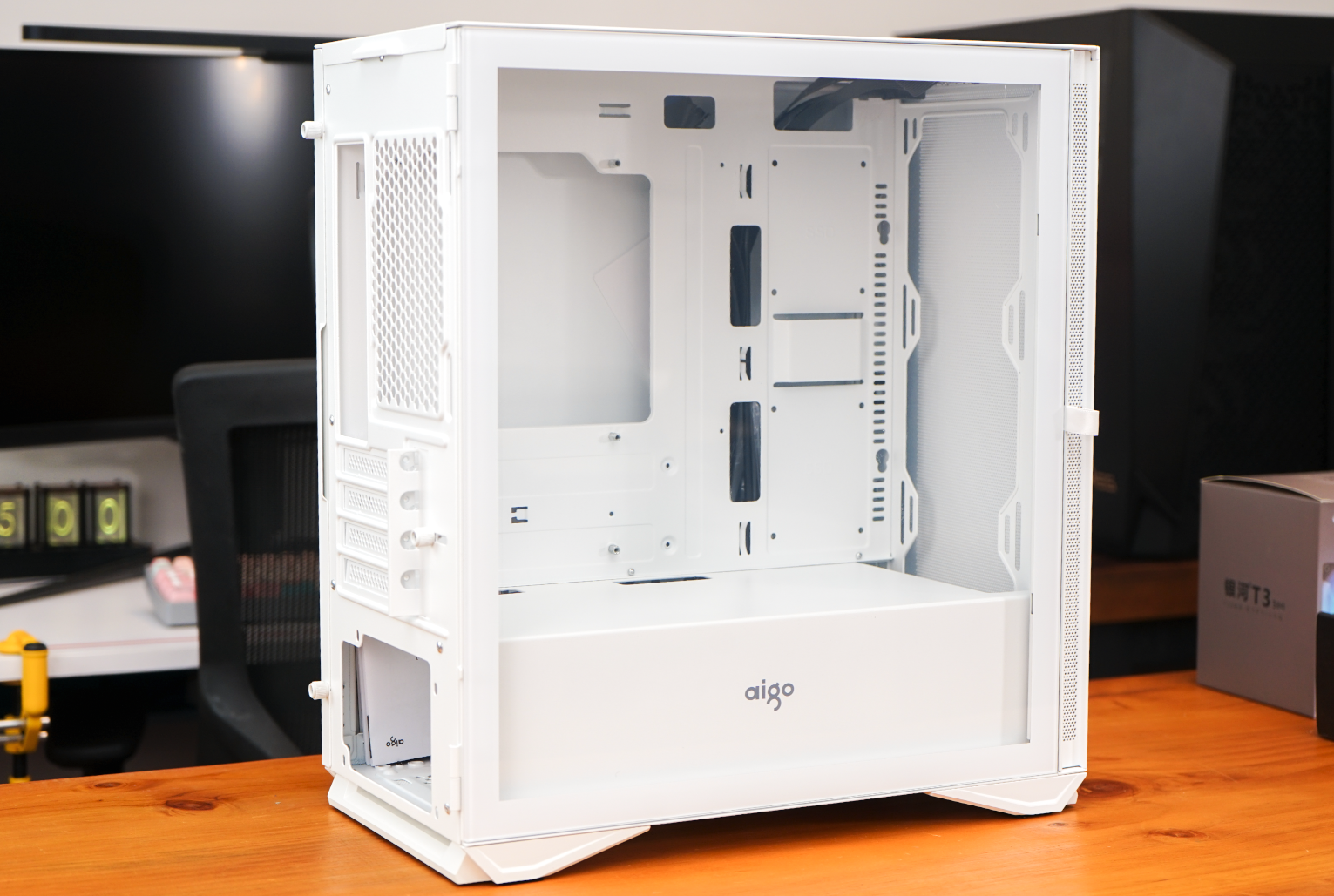 aigo YOGO M2高性能版机箱对比之前的版本颜值又高了不少。这次我拿到的是纯白版,里里外外基本上都是白色。aigo的logo被设计在电源仓的侧面,看起来也非常醒目。