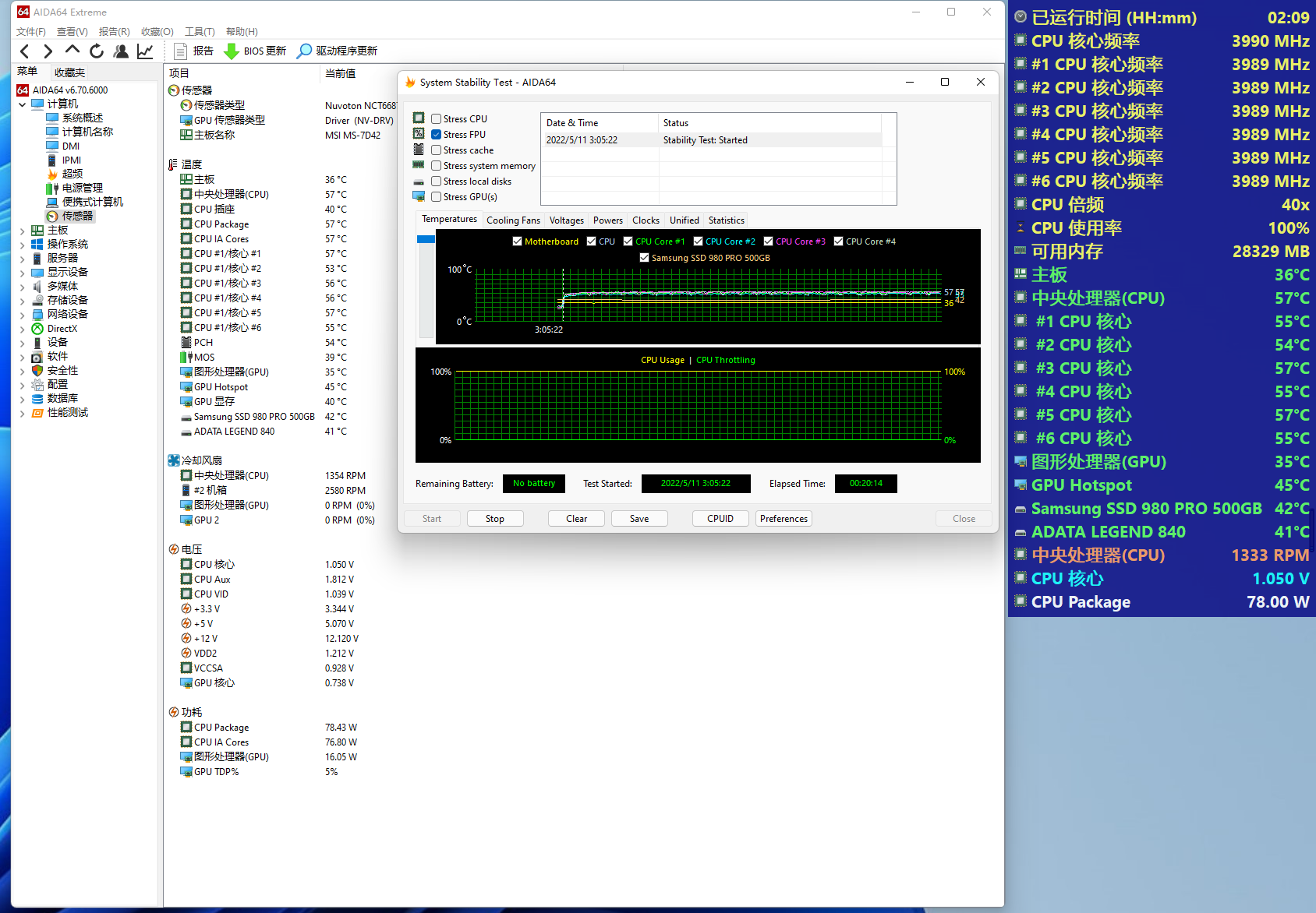 为什么说这套平台不用水冷就够,看看拷机表现就知道了通过AIDA64单烤FPU,i5-12490F为全核4.0GHz,核心电压为1.05V,整体功率为80W左右。同时经过超频三东海R4000W和aigo银河T3风扇的联手压制,CPU温度仅为57℃,且风扇转速只有1300RPM,完全可以用非常凉快来形容。