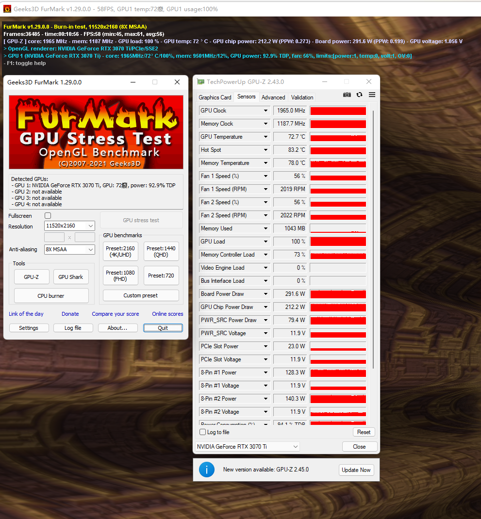 至于显卡也通过FurMark拷机,设置12K分辨率(11520*2160)+8 x MSAA,影驰RTX3070Ti永劫无间版总功率为295W左右,10分钟拷机,GPU温度为72.7℃,显存的温度为78℃,表现也还不错。